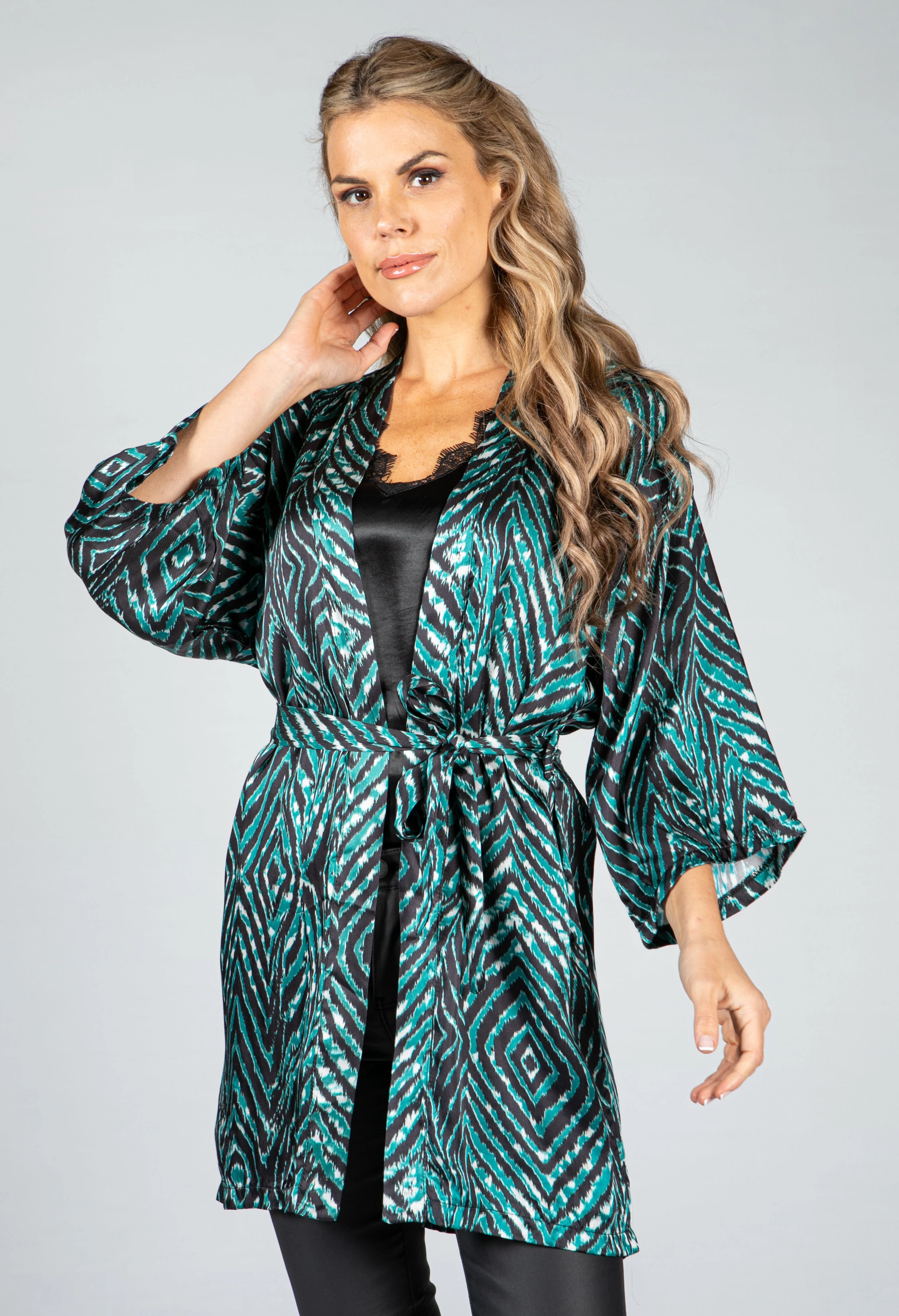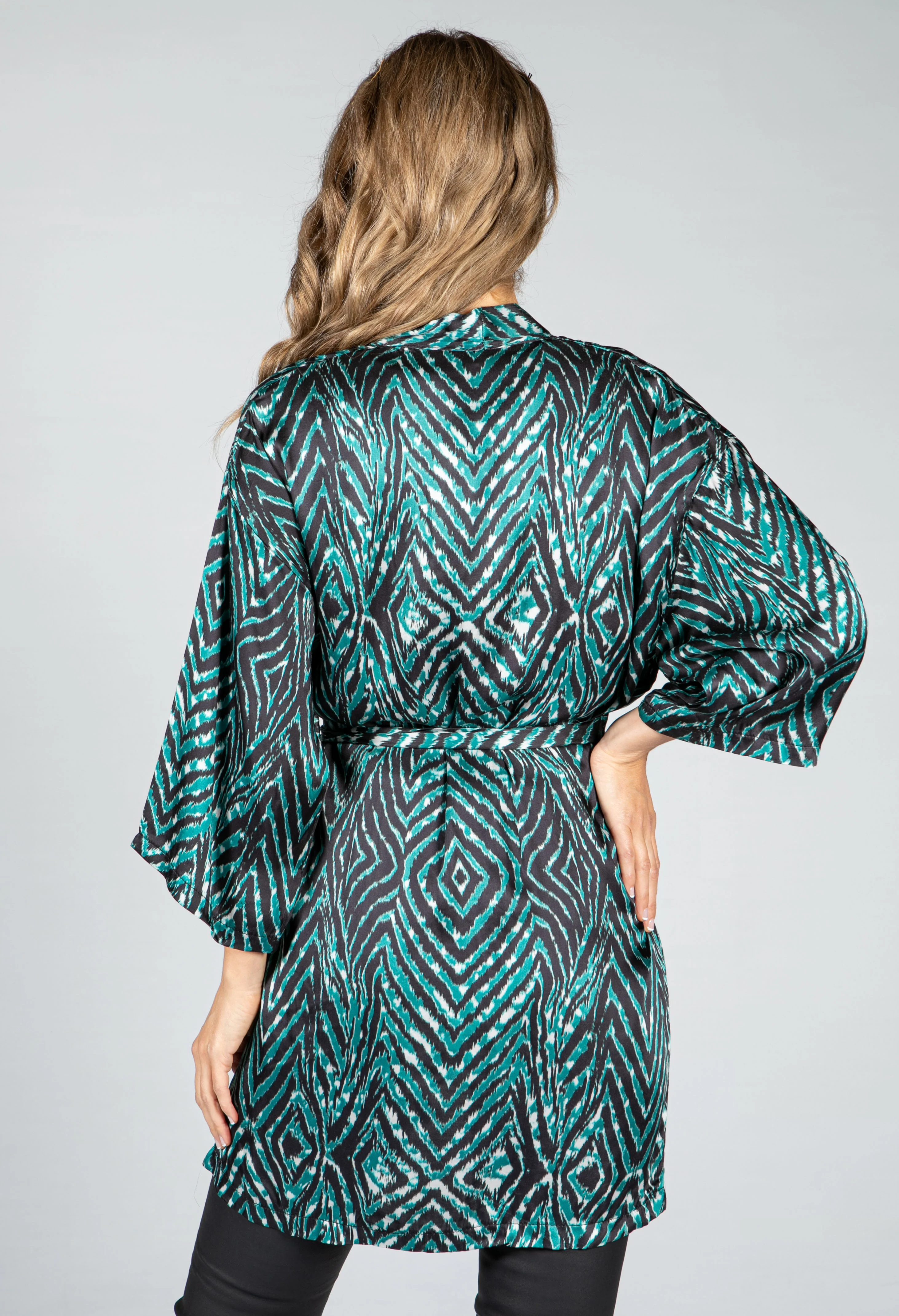 Animal Print Silk Blend Kimono Style Cardigan in Jade Green