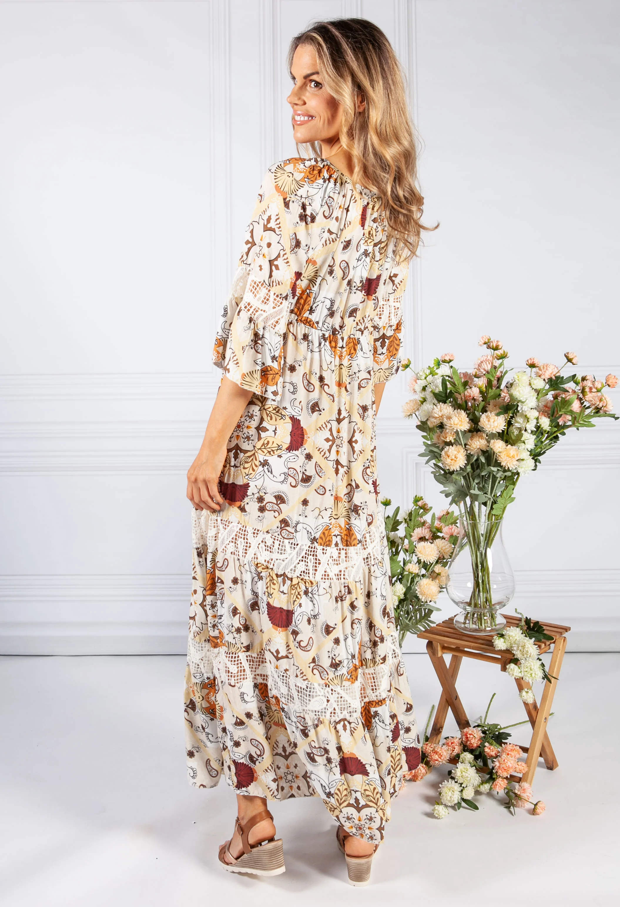 Brown Vintage Print Boho Dress