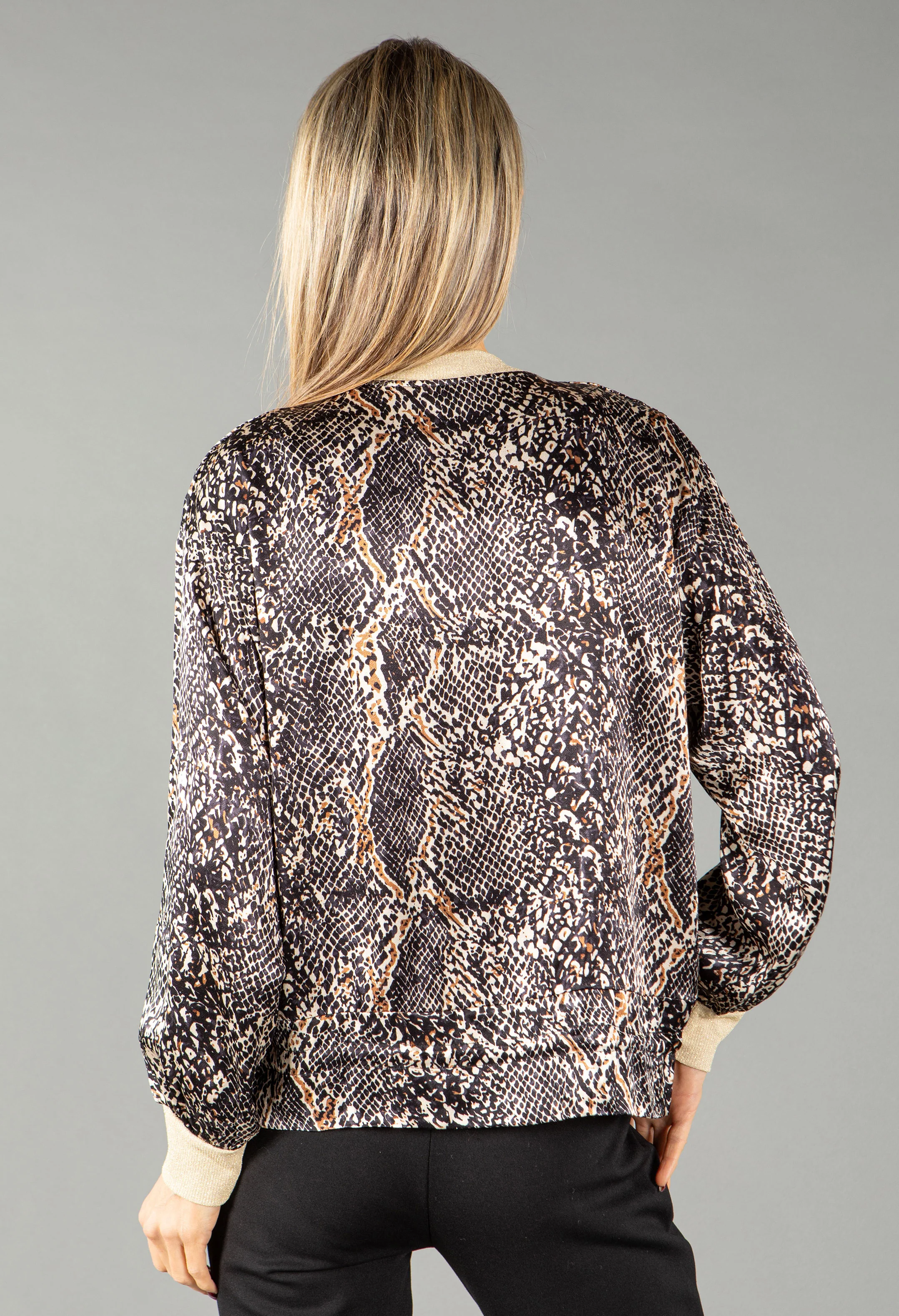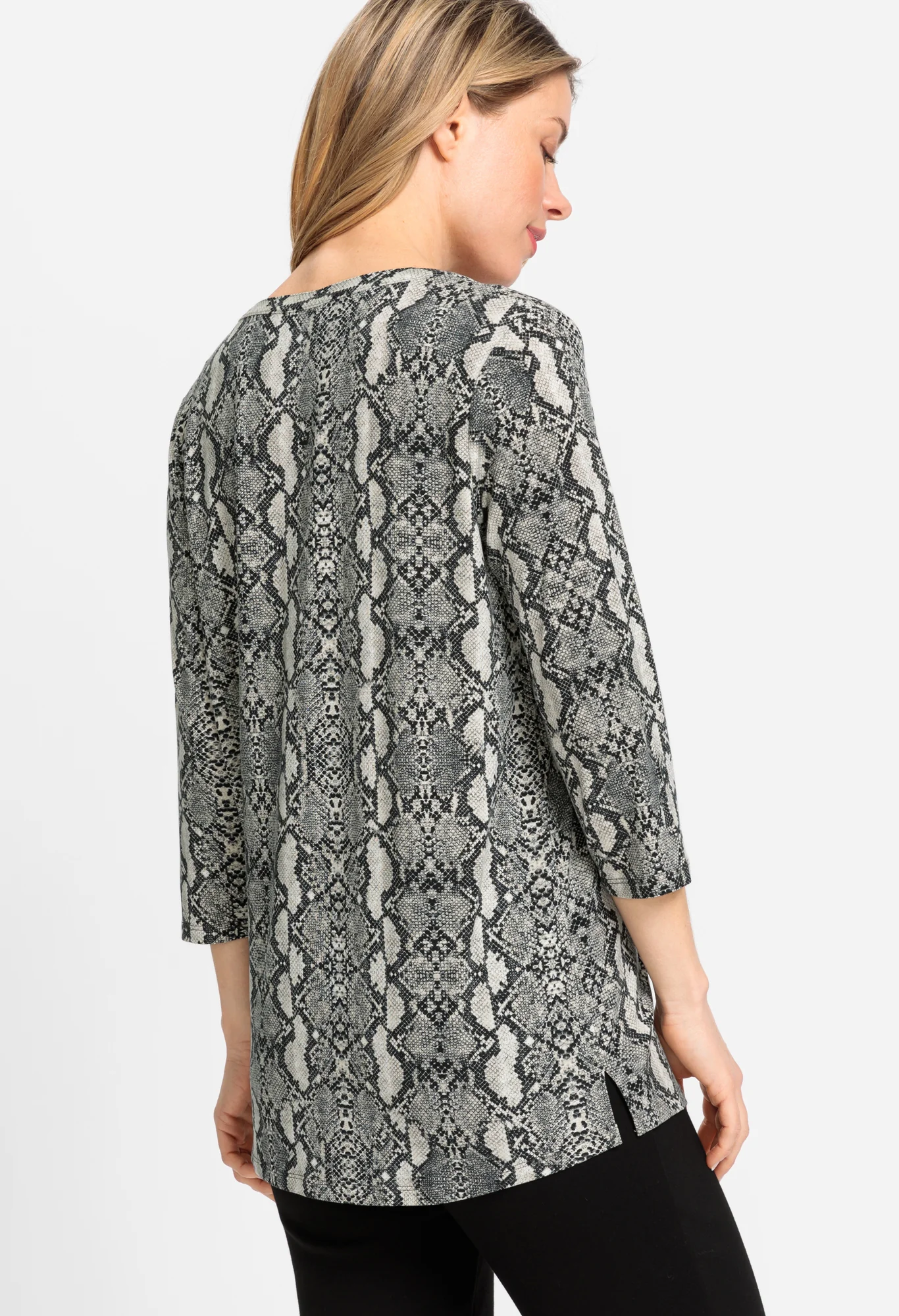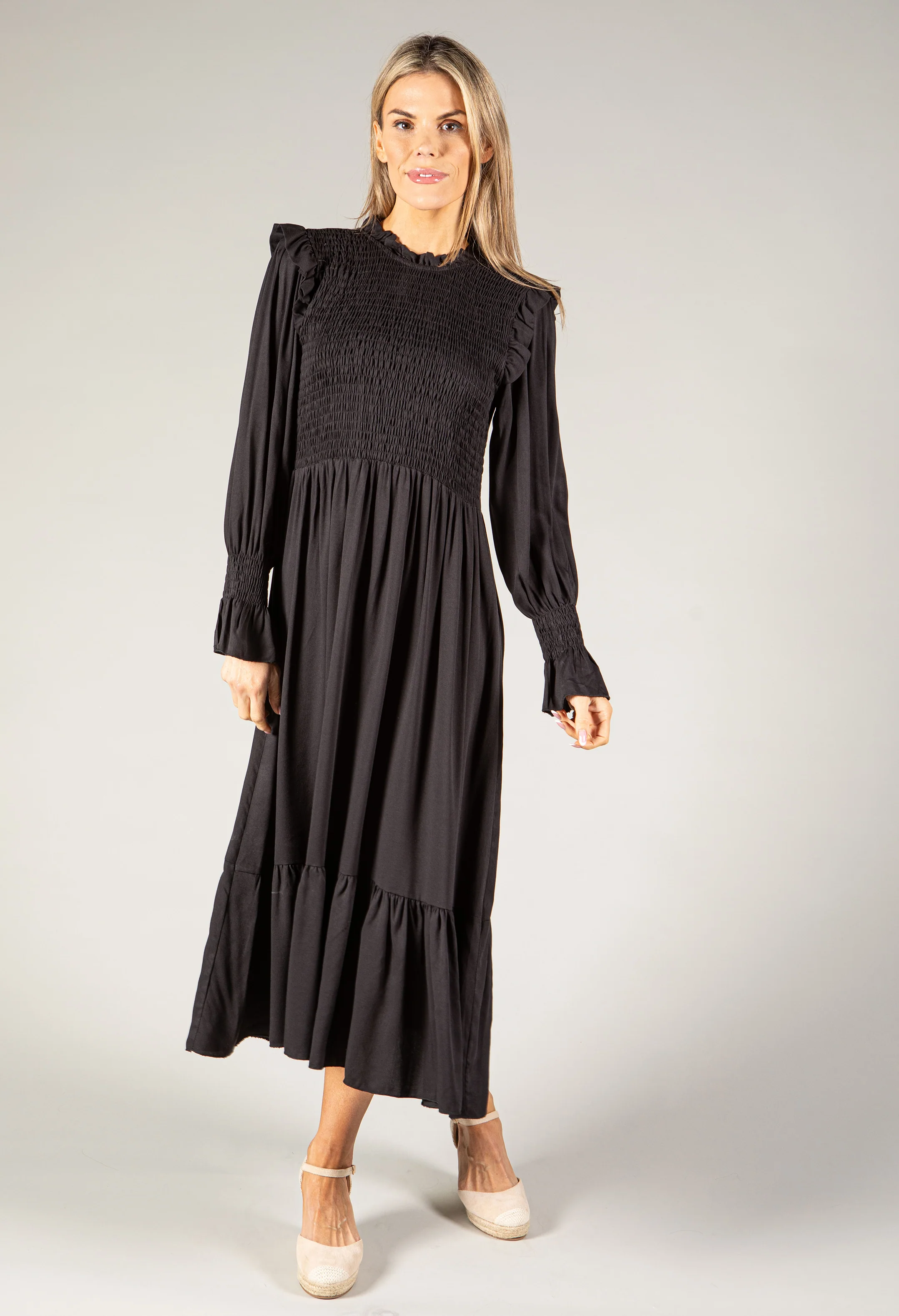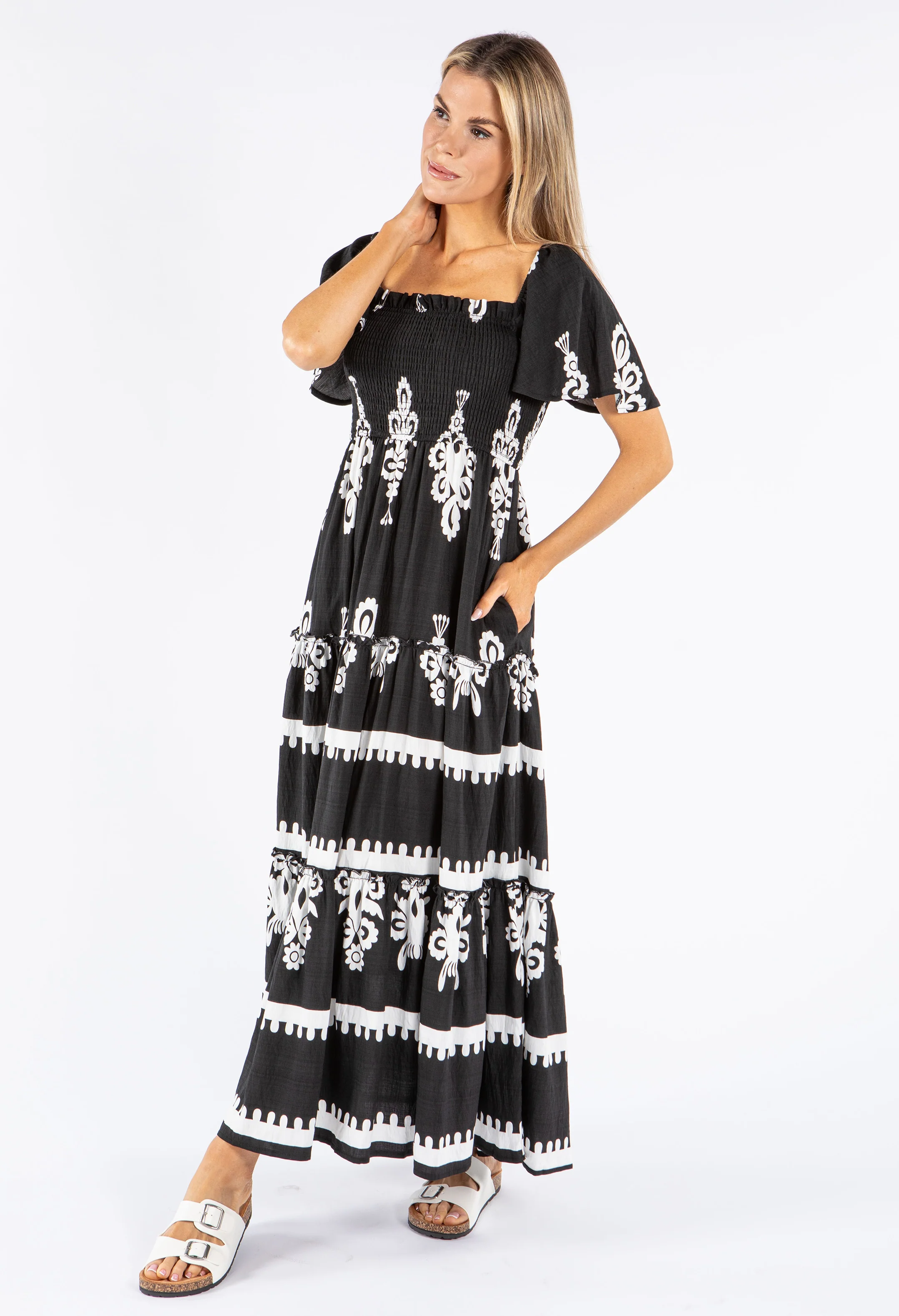 Smocking Mock Neck Printed Long Sleeve Top in Black