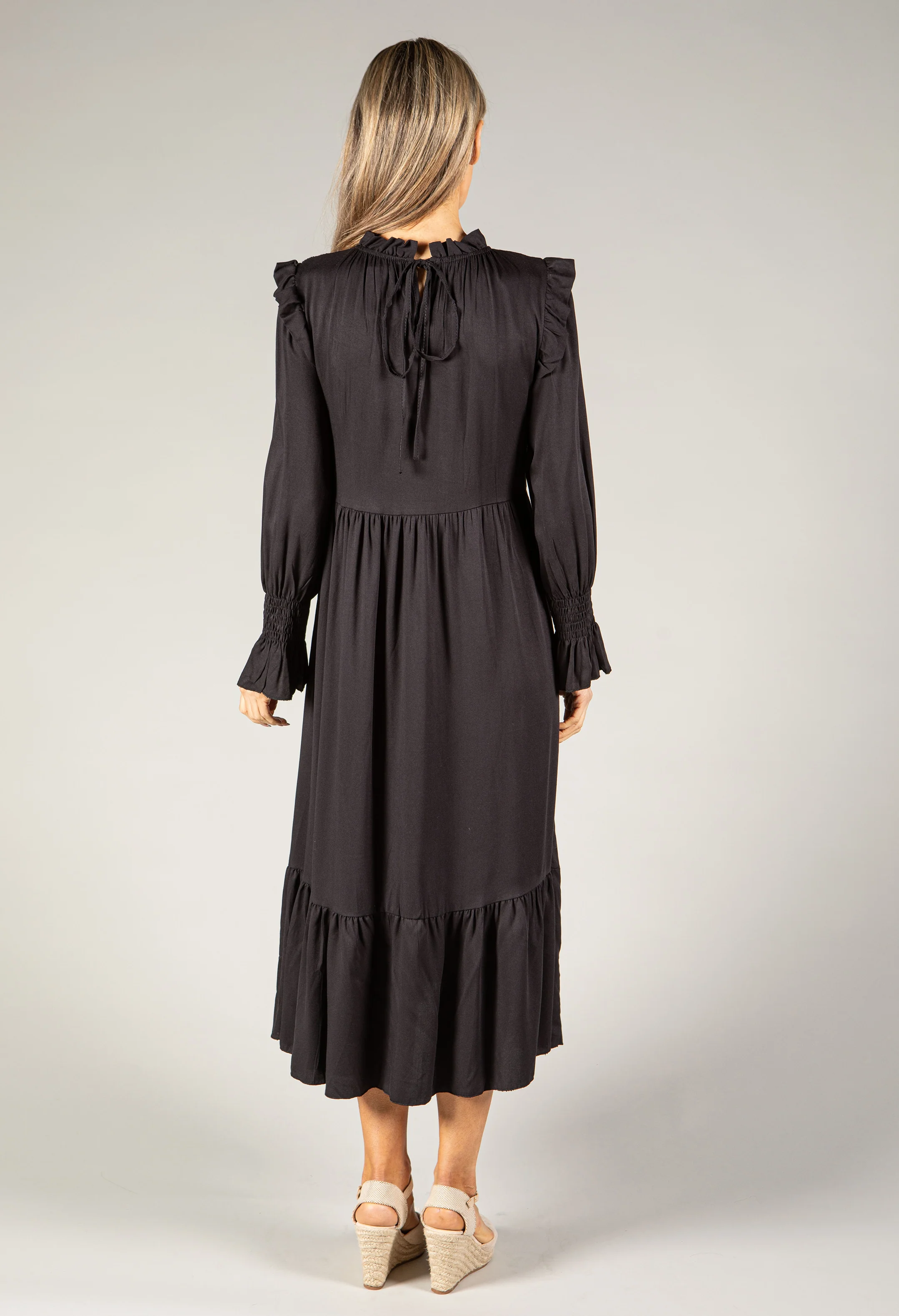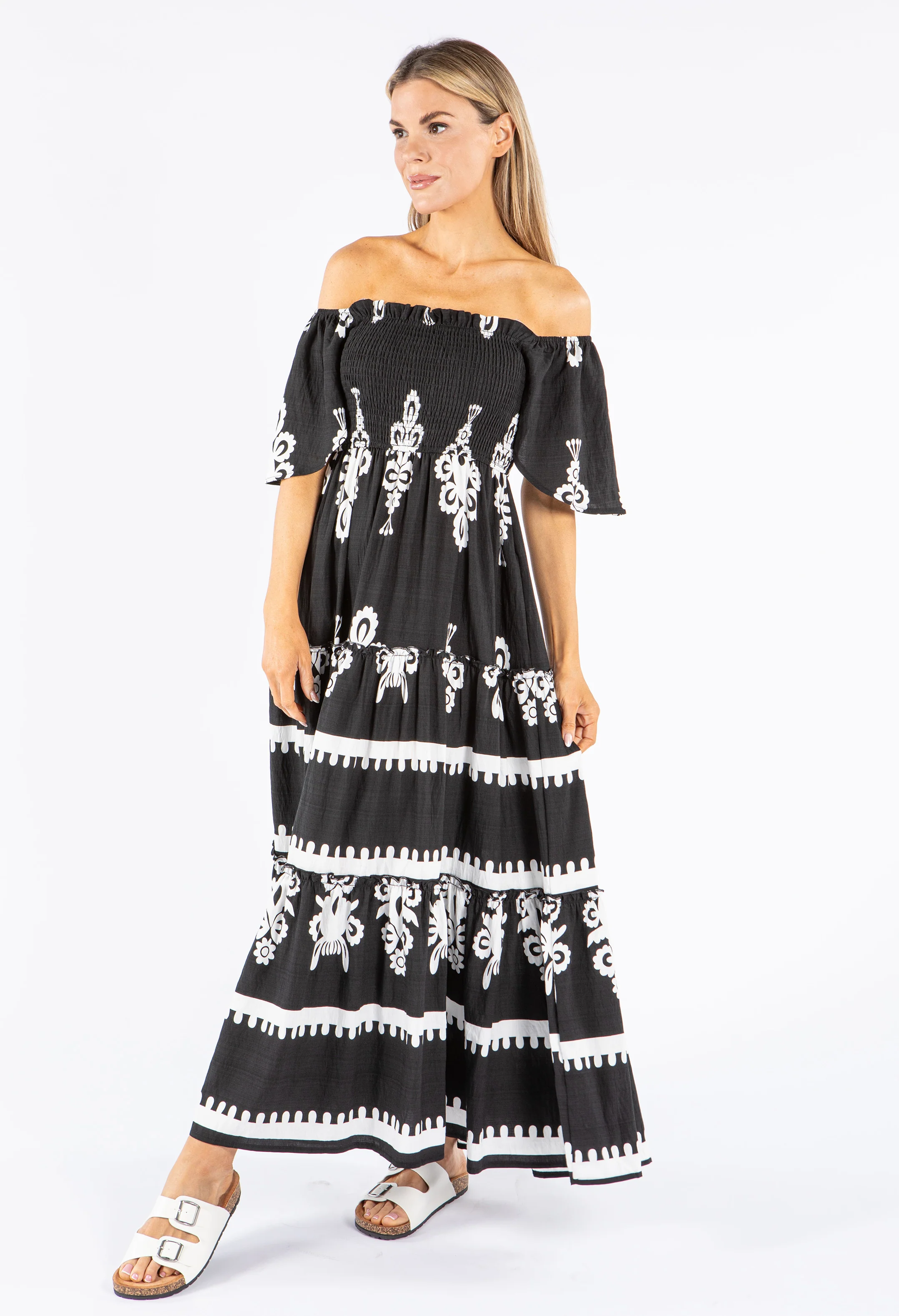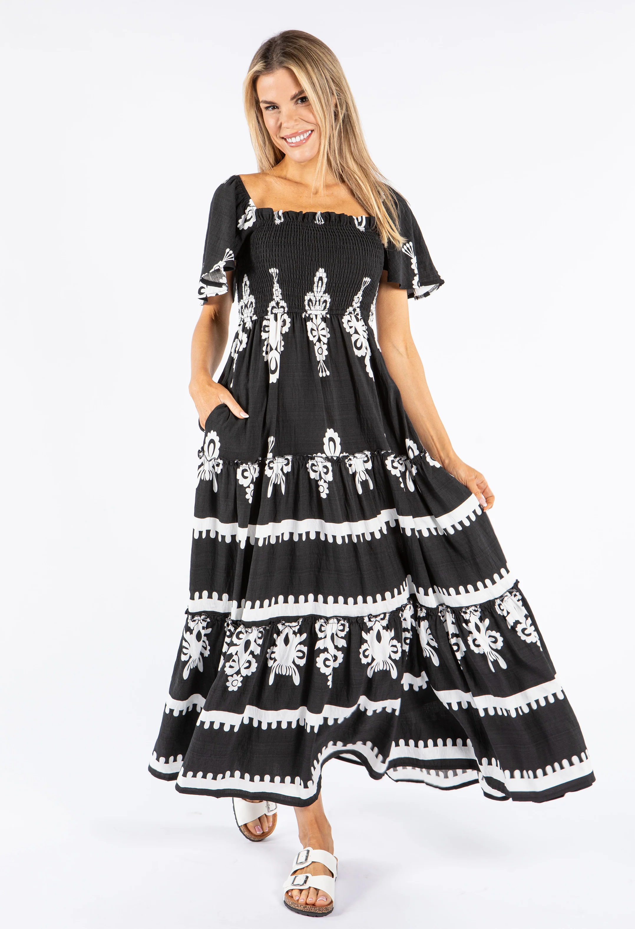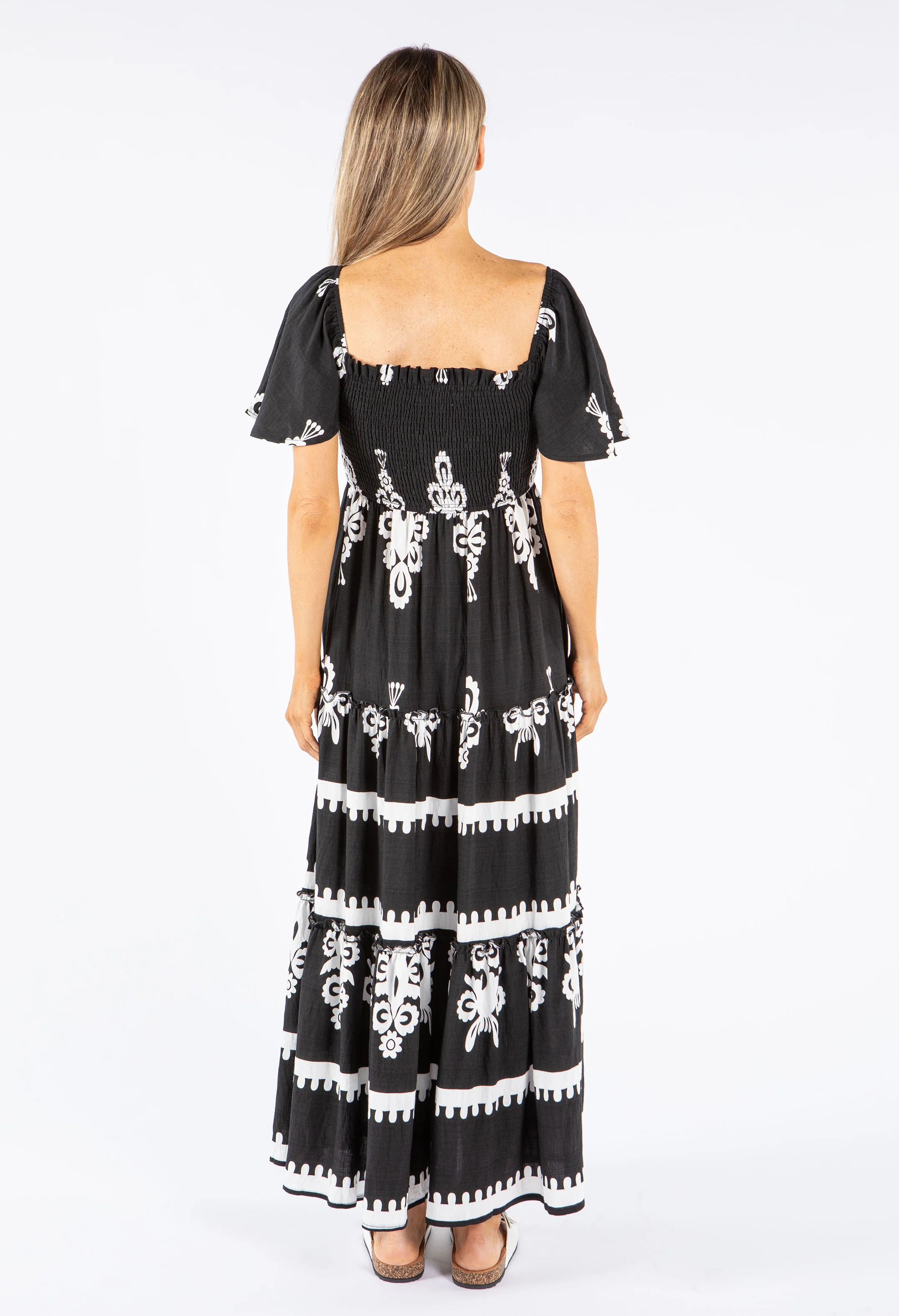 Smocking Mock Neck Printed Long Sleeve Top in Black