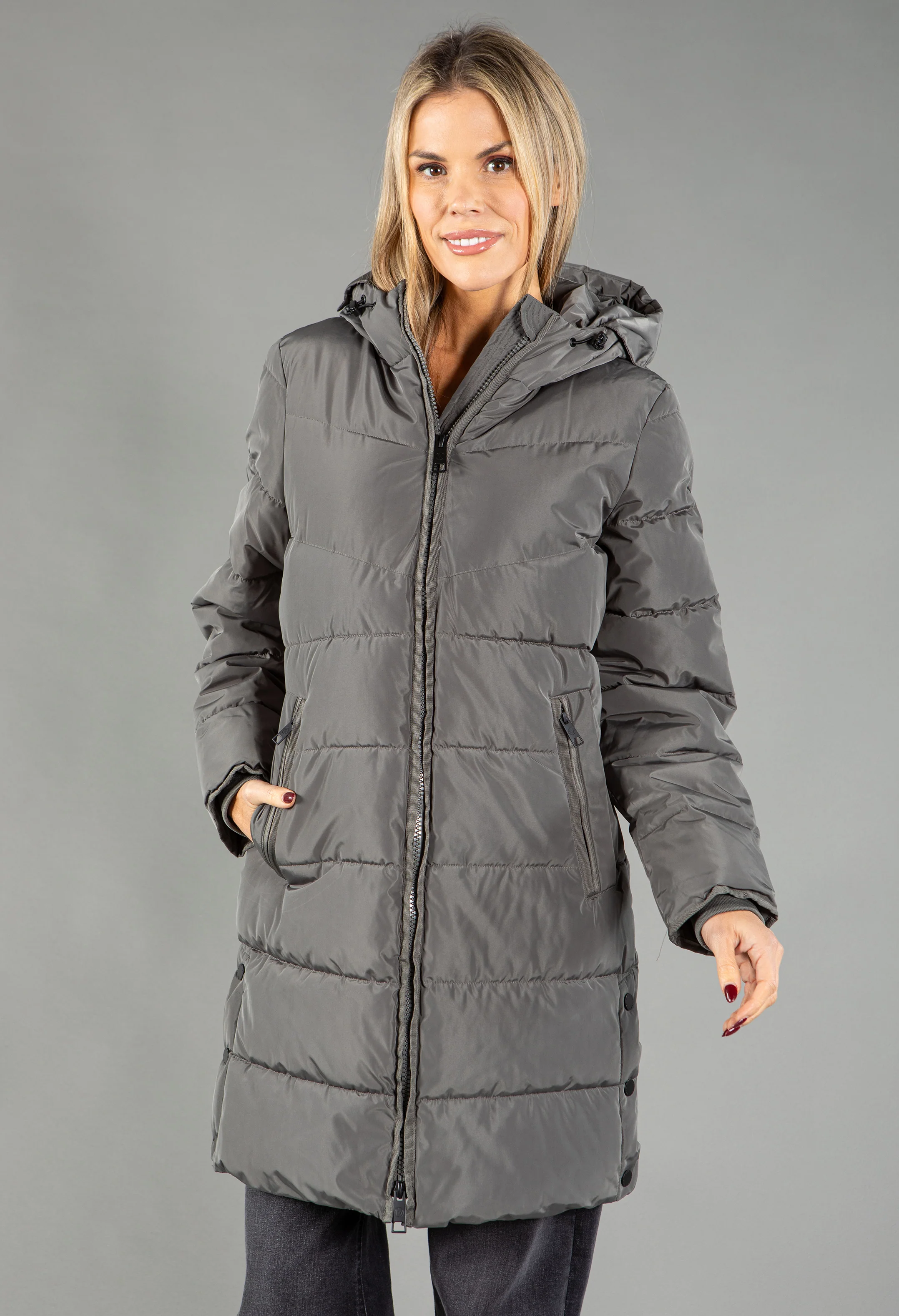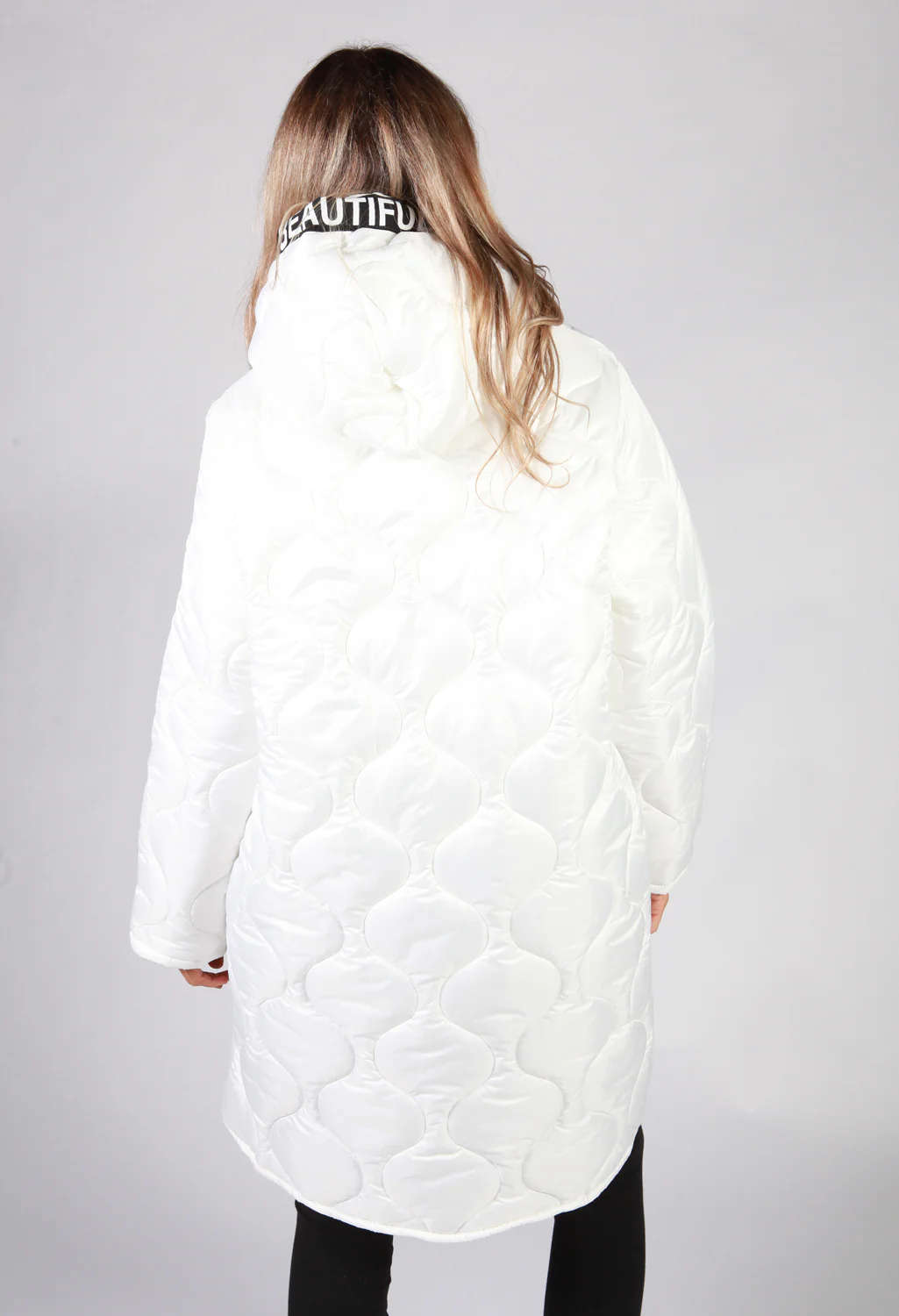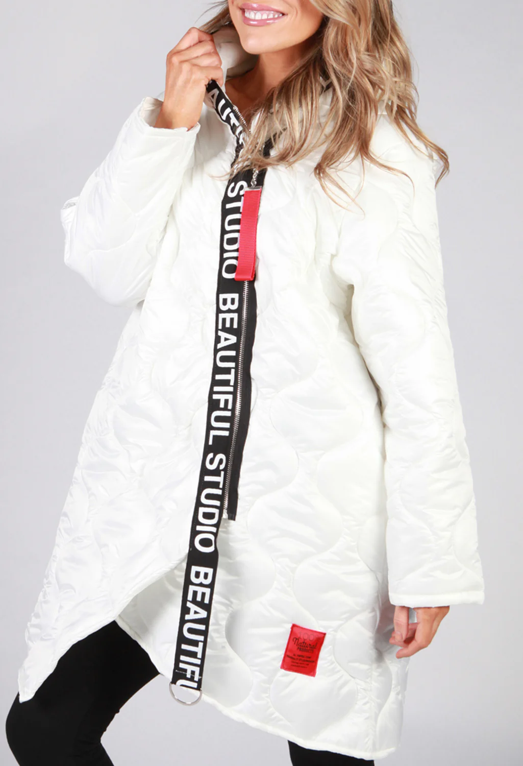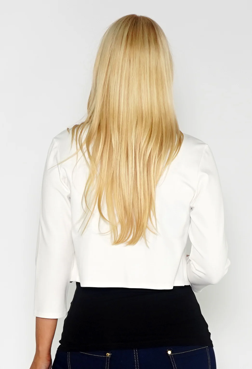 ZIP THROUGH CARDIGAN IN WHITE WITH NAVY STRIPES.