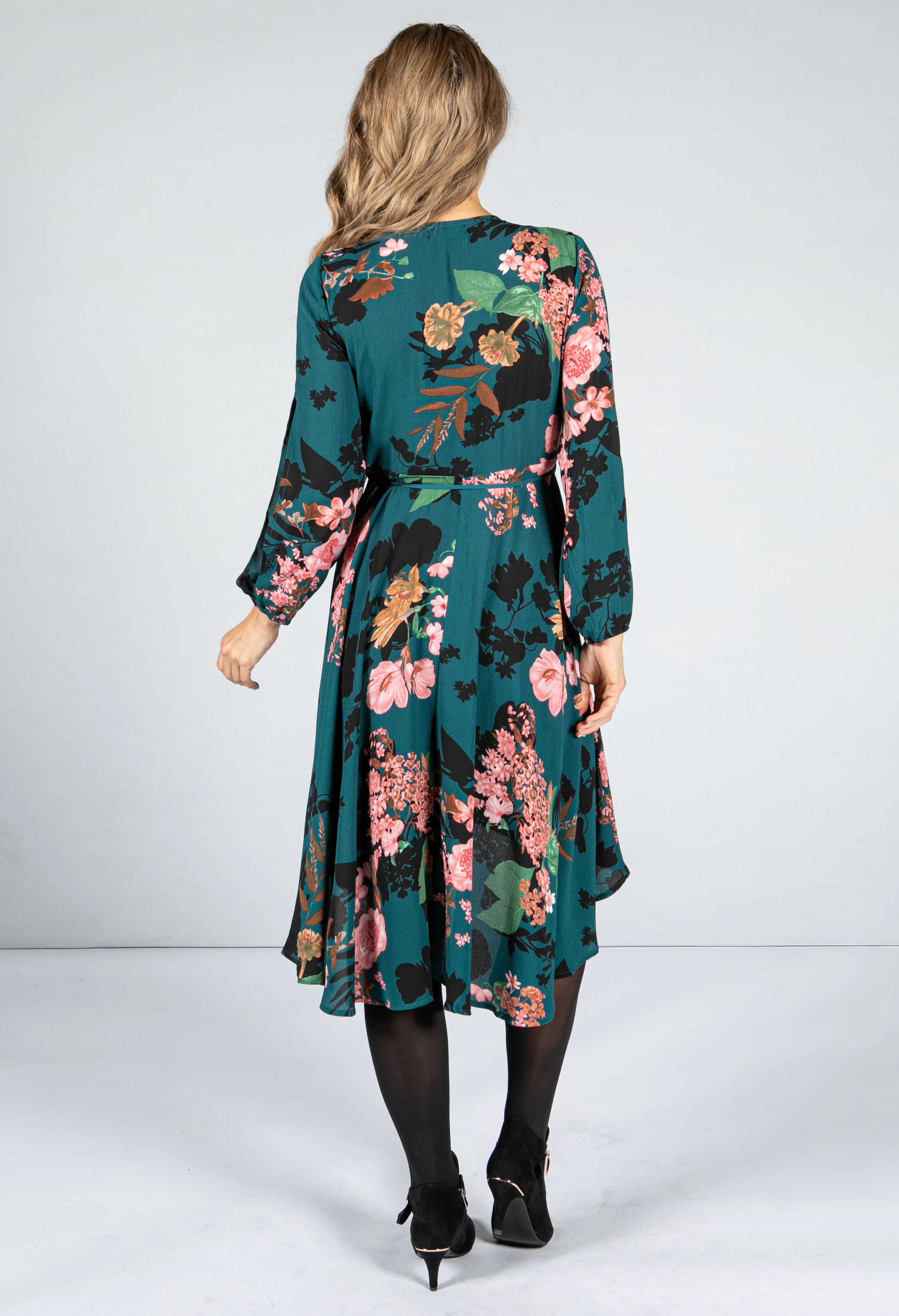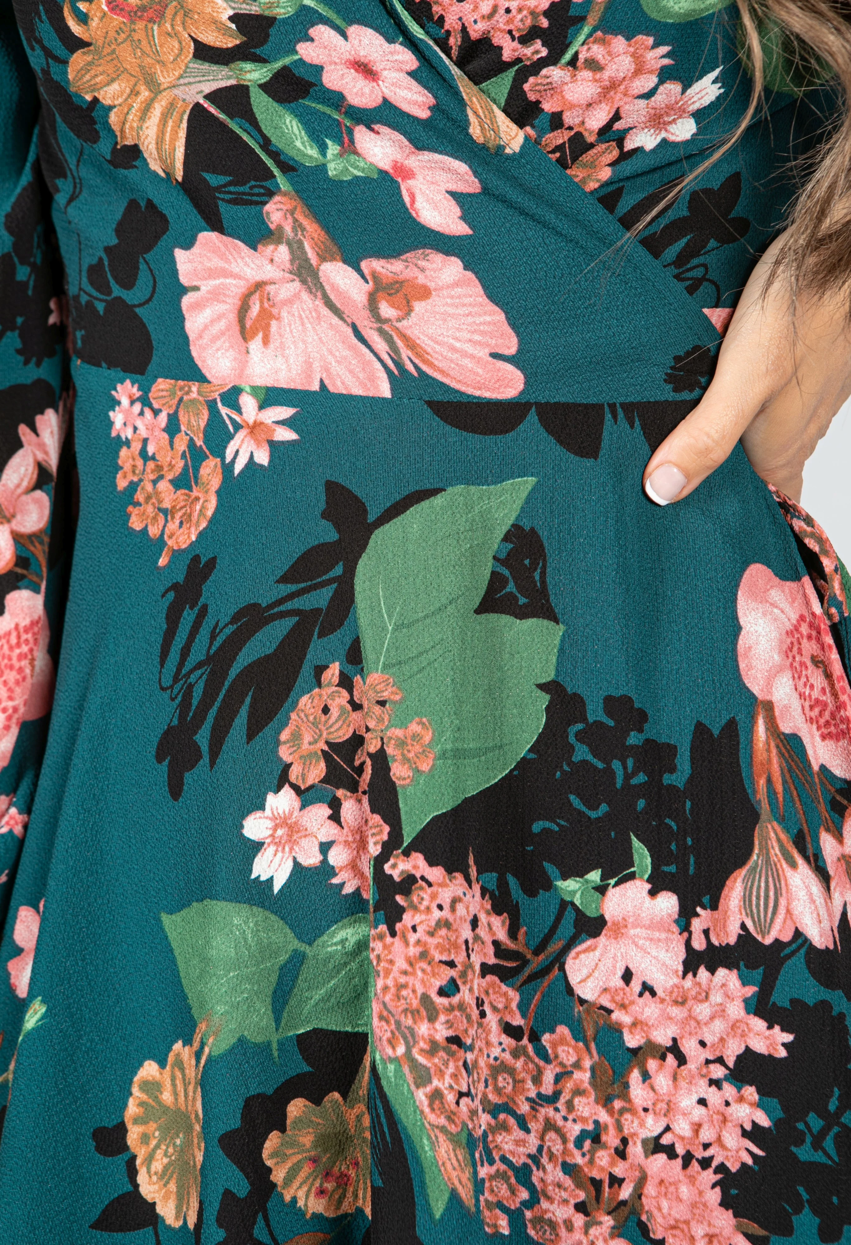 Blossom Print Silk Feel Dress in Deep Turquoise