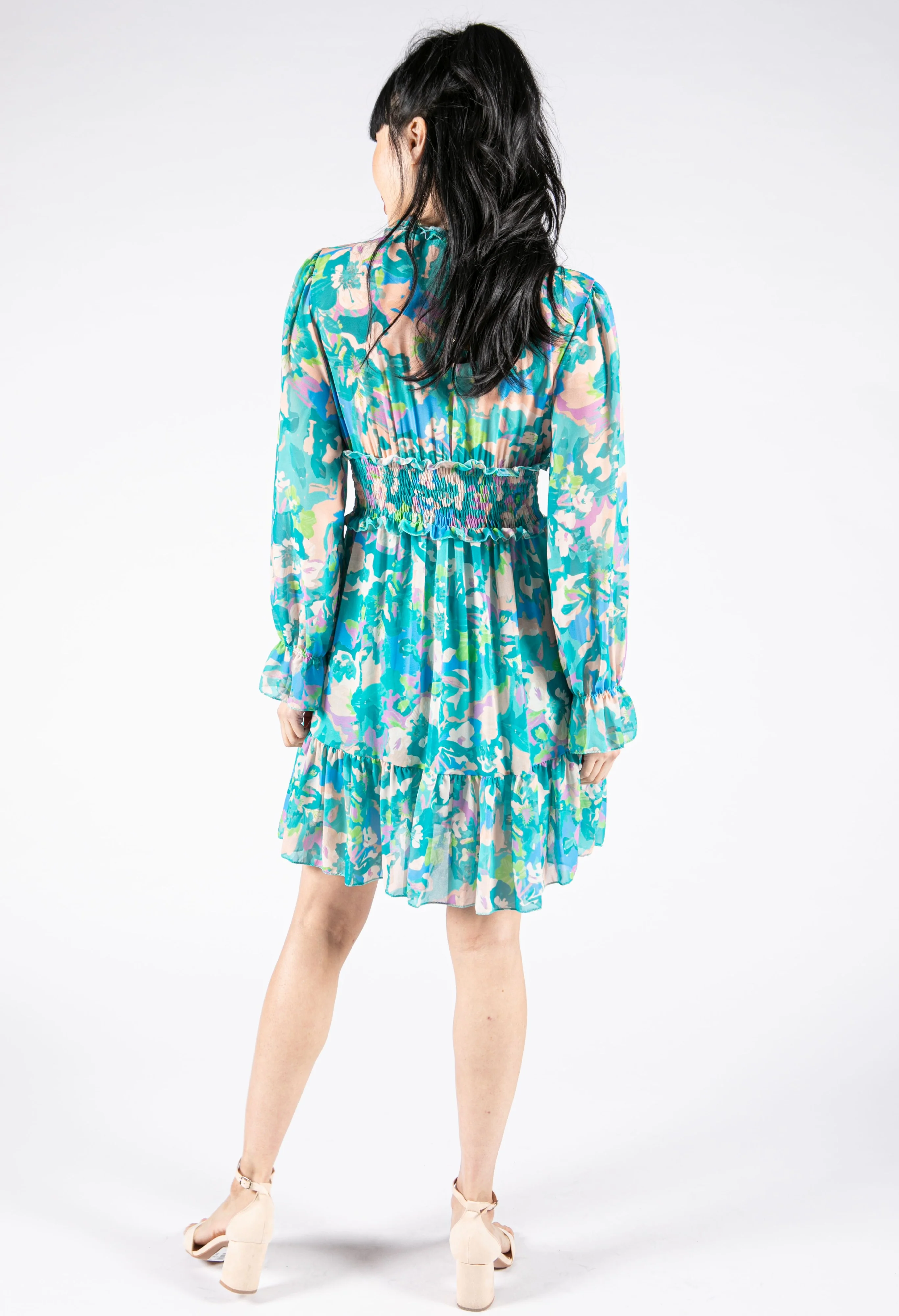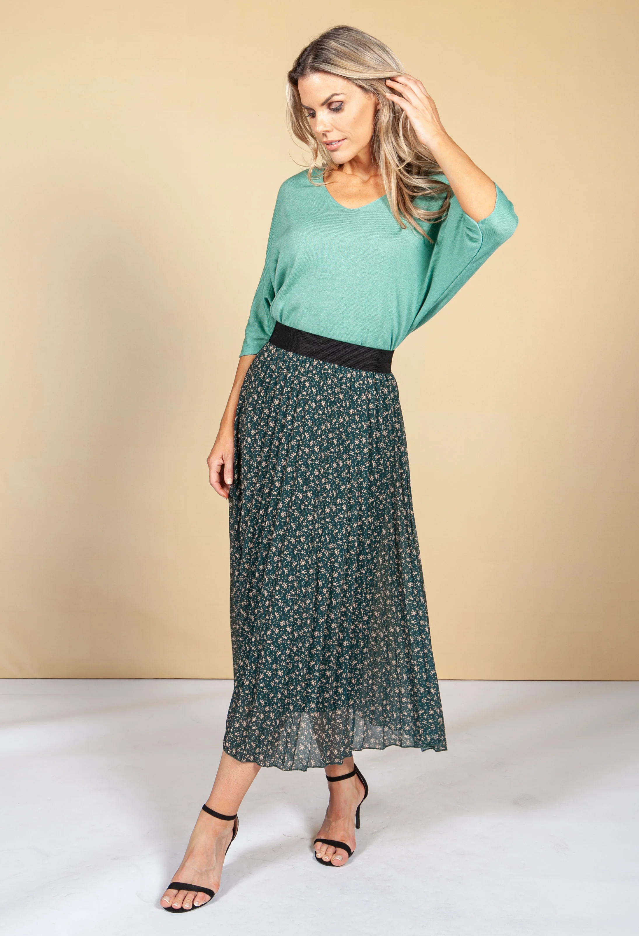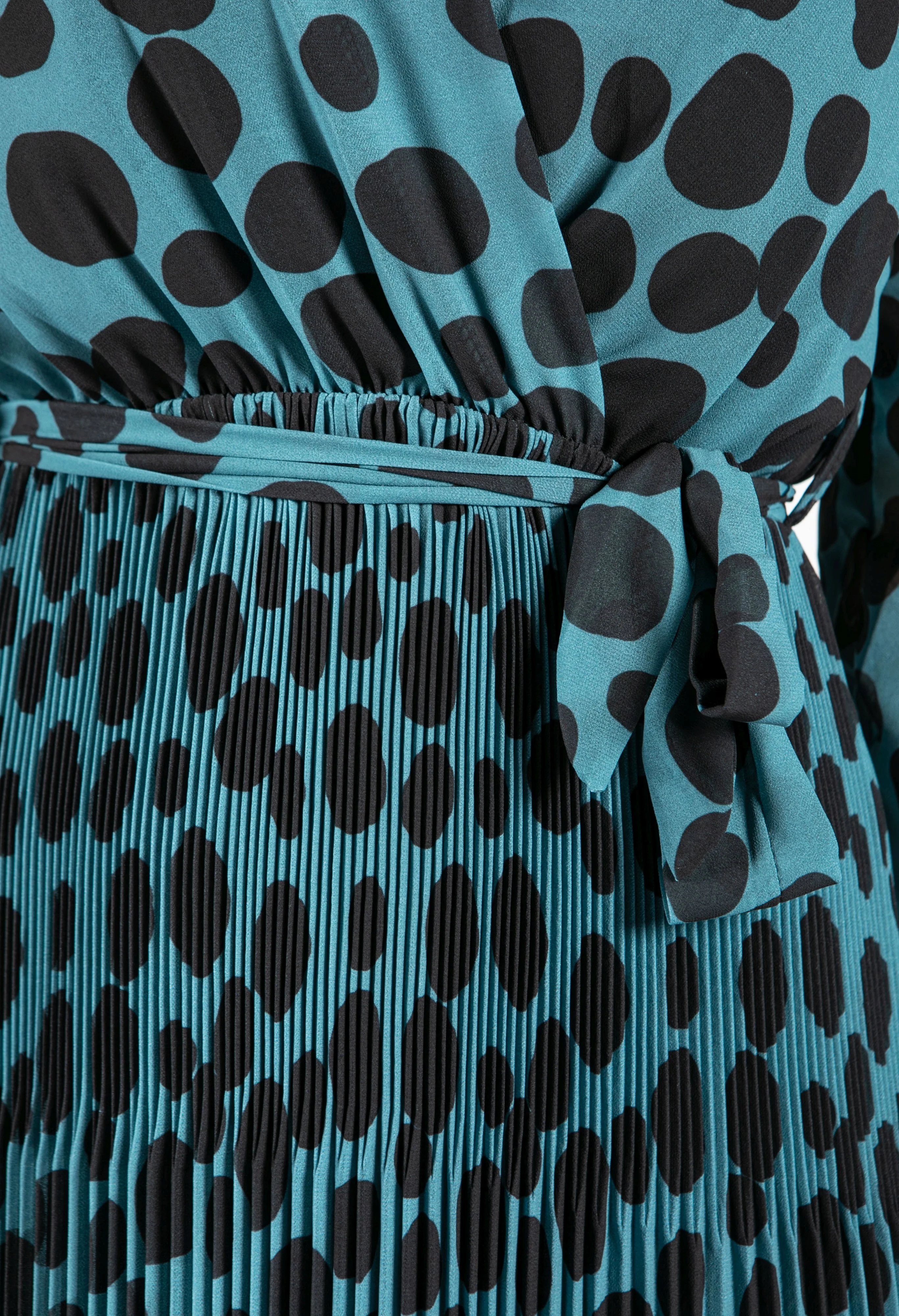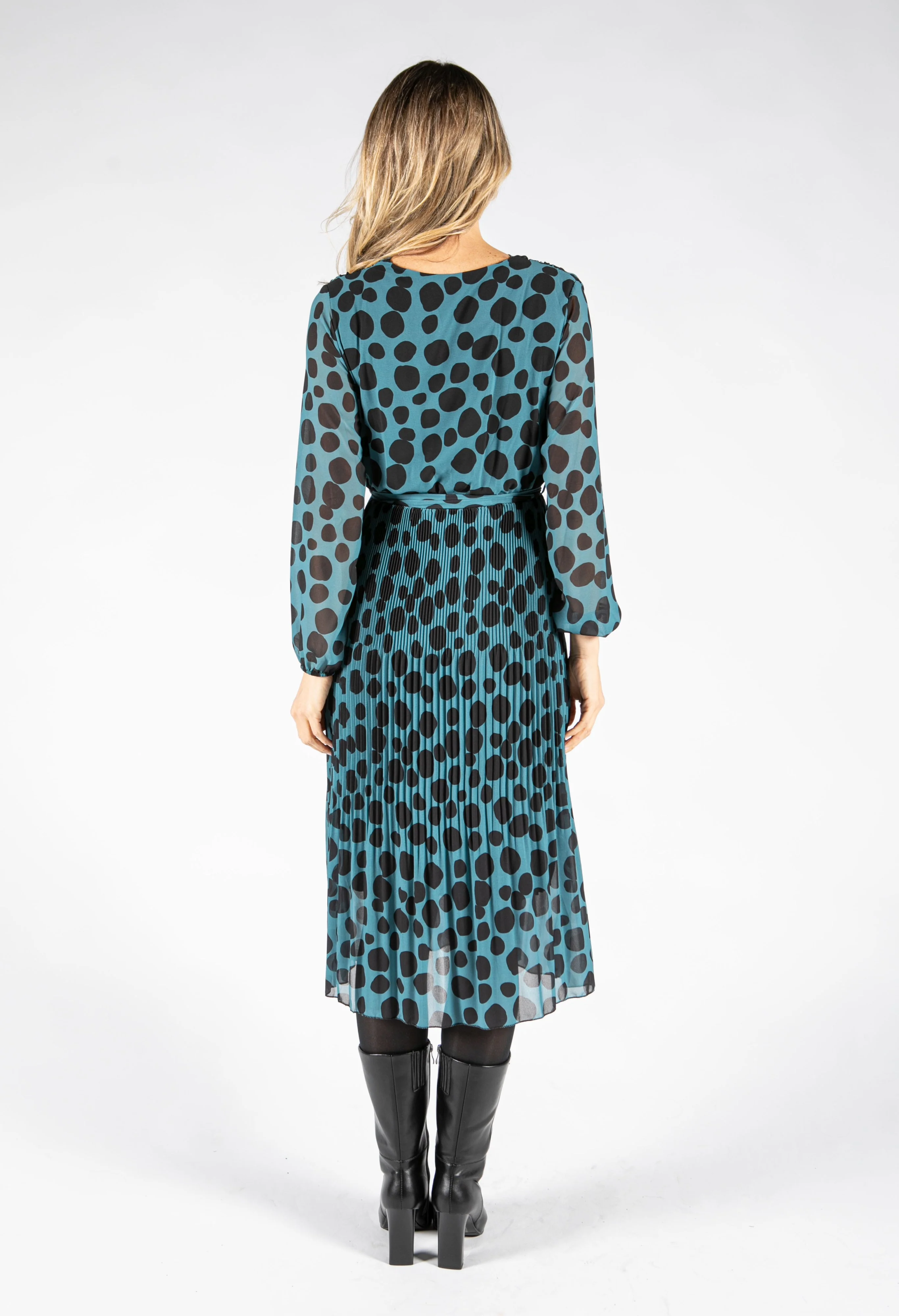 Dot Print Pleated V-Neck Dress in Teal & Black