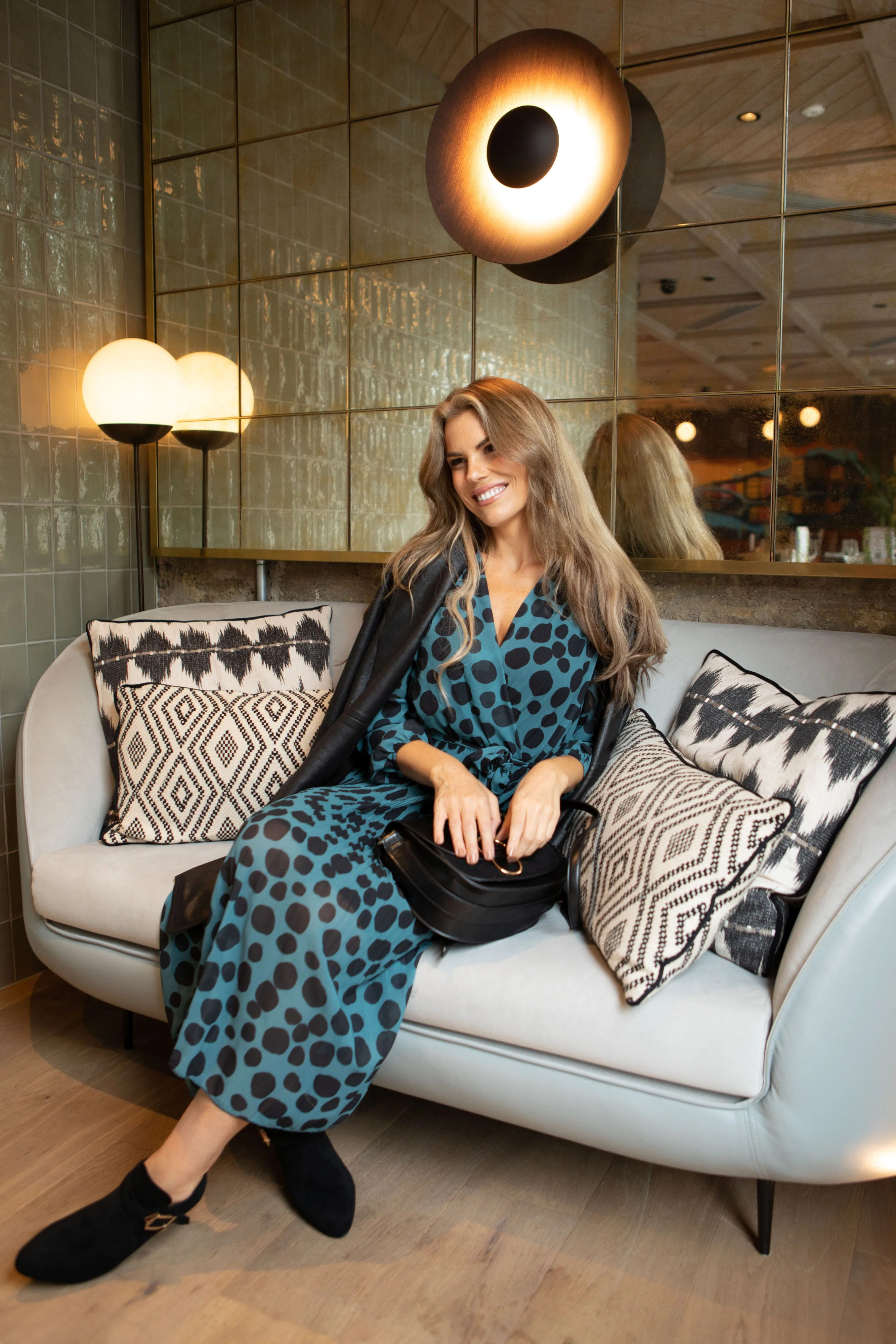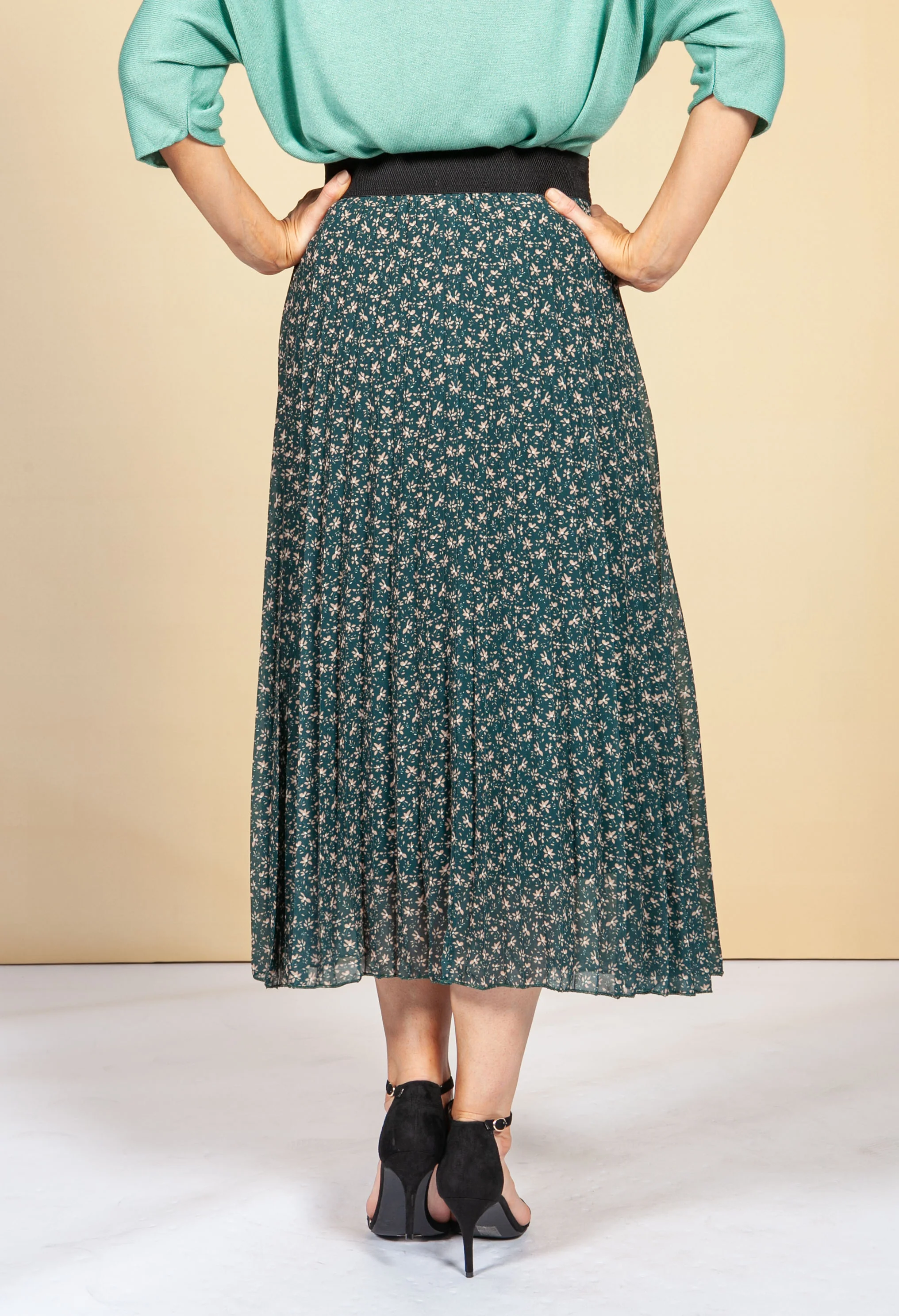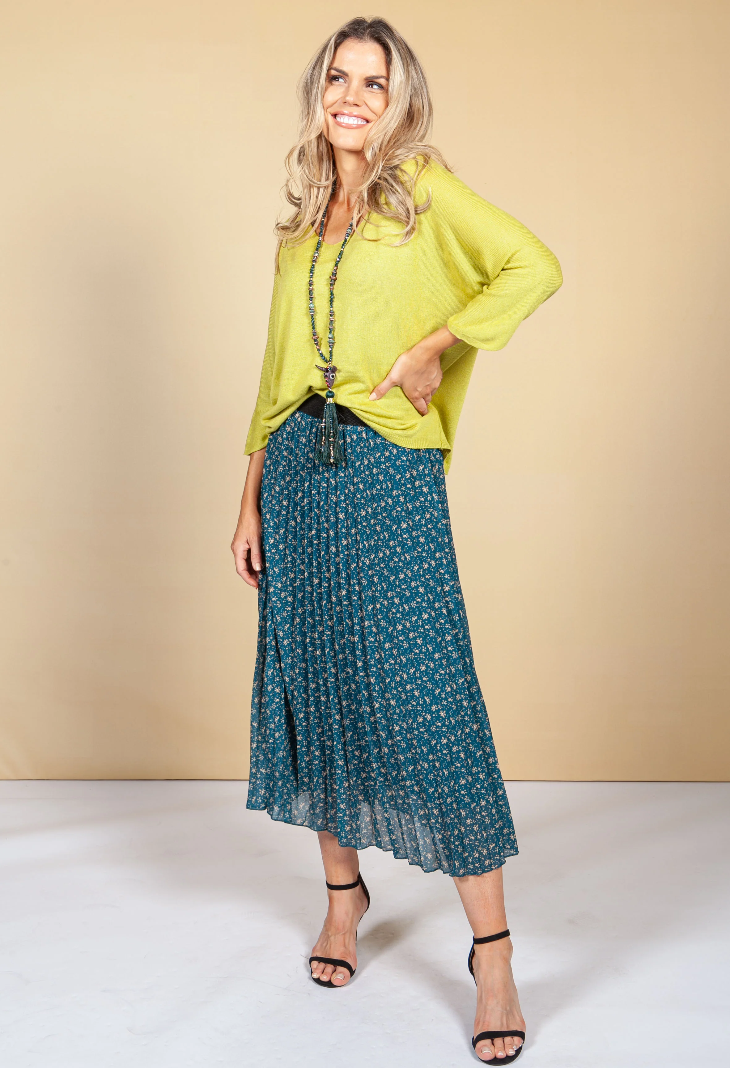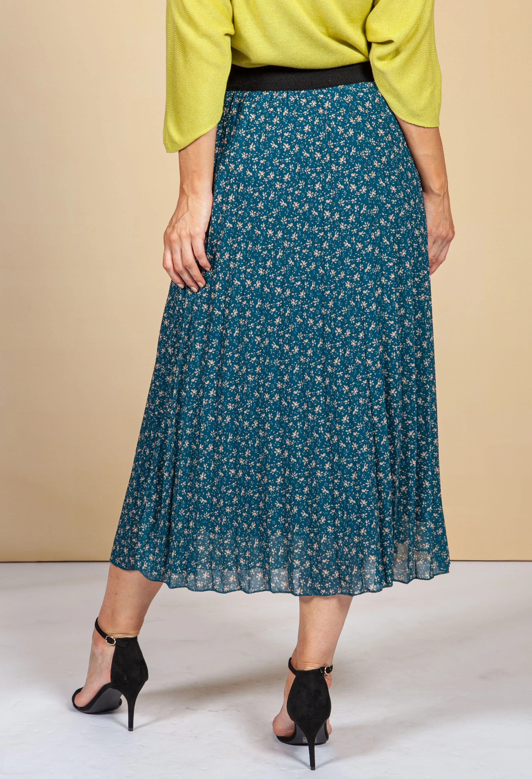 Dot Print Pleated V-Neck Dress in Teal & Black