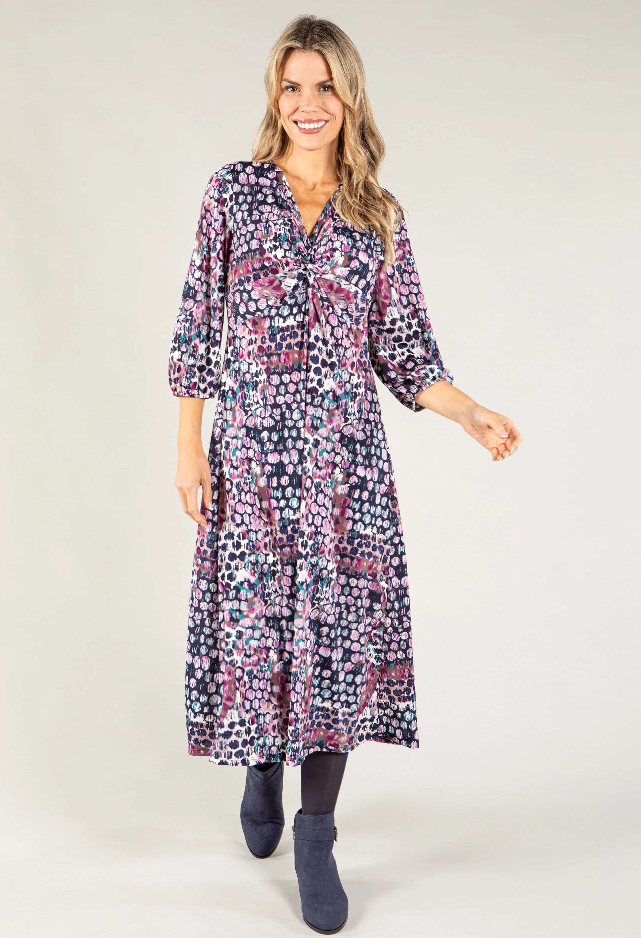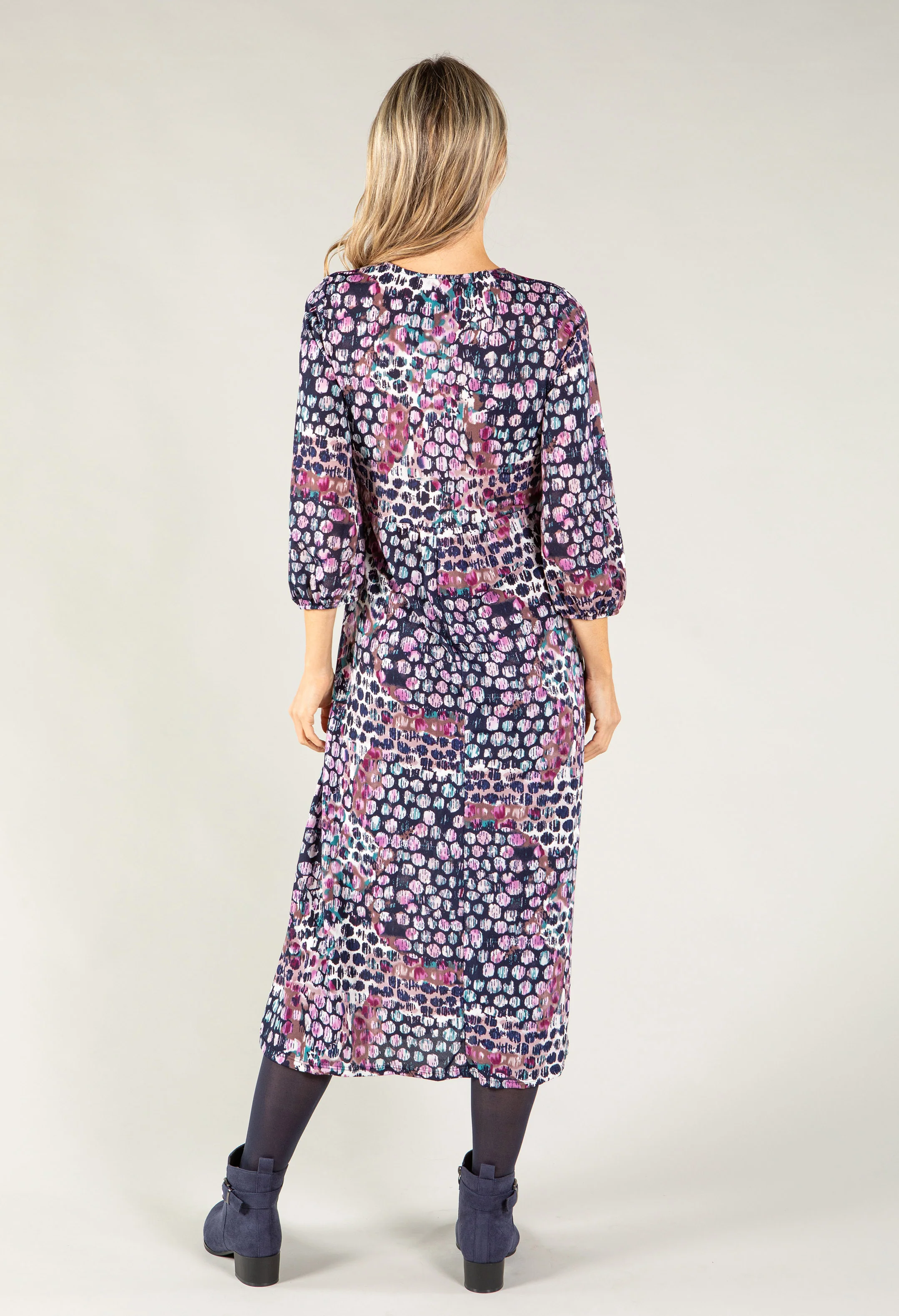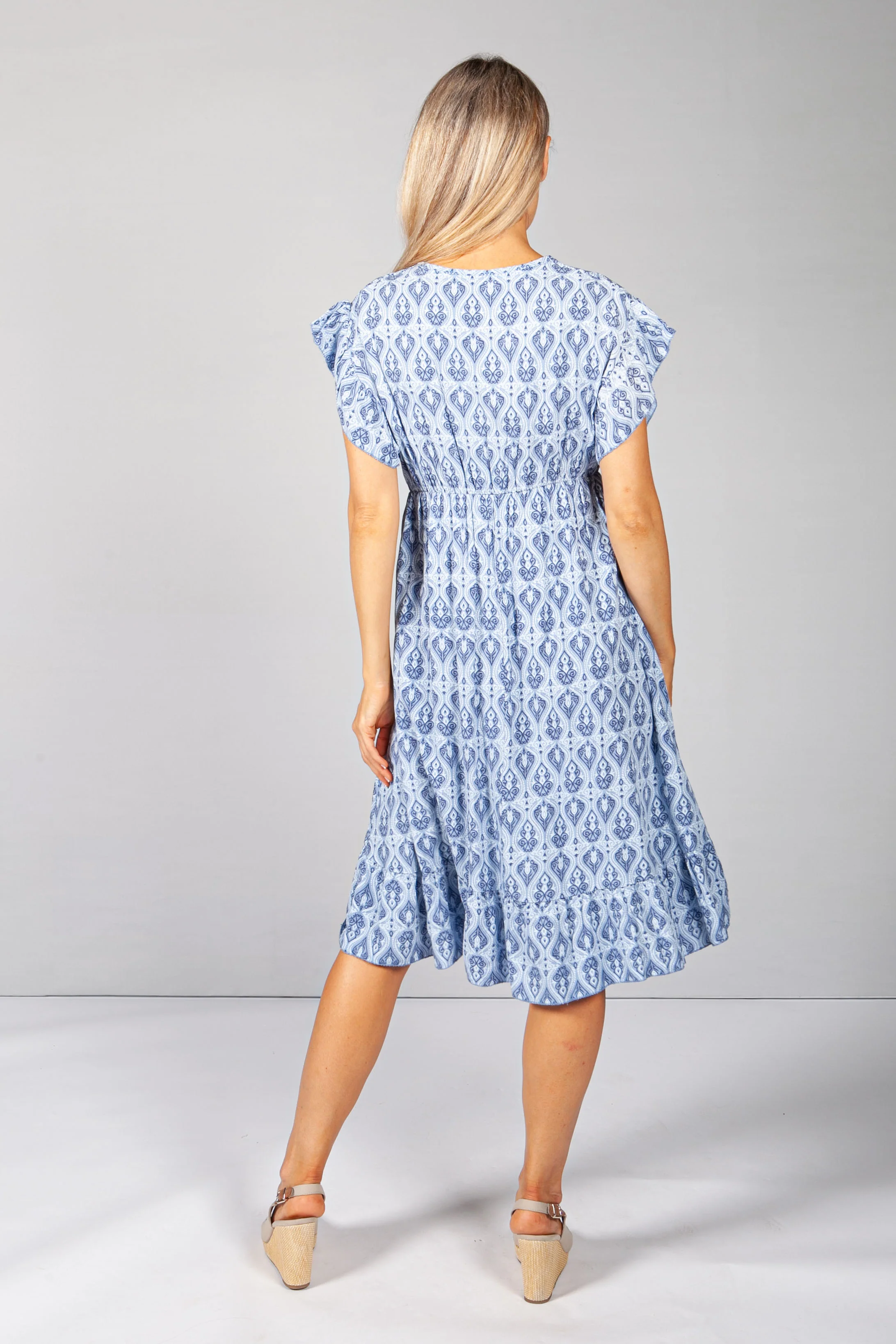Angel Sleeve Split Leg Midi Dress Navy White Mixed Print