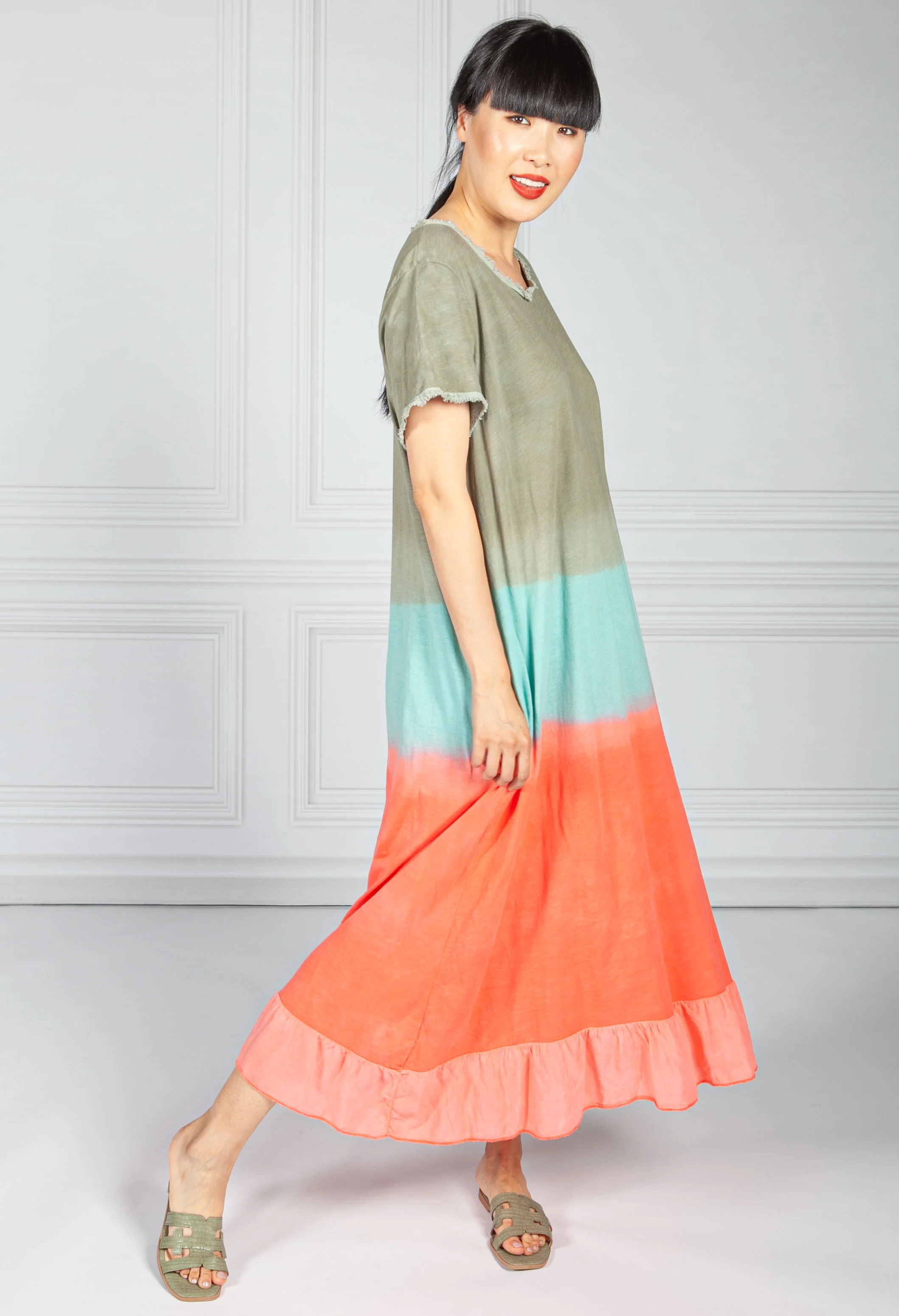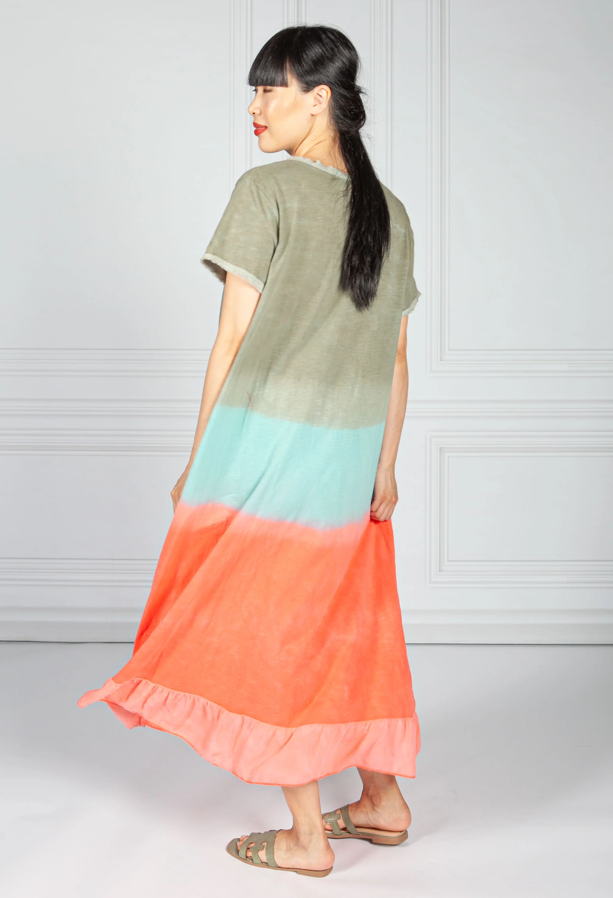 Dip Dyed Cotton Dress in Khaki & Coral