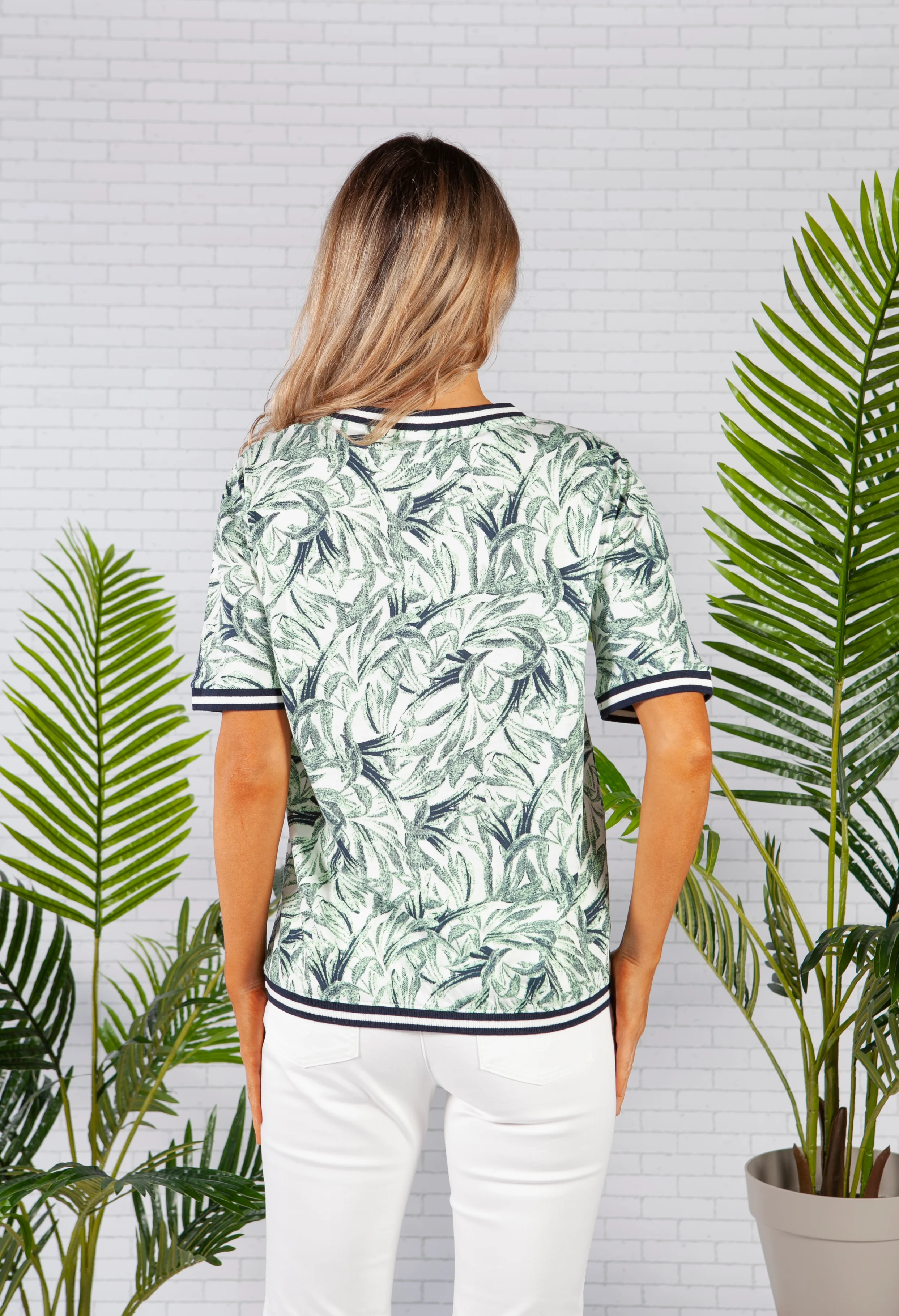 Short Sleeve All Over Botanic Print T-Shirt with Striped Trim
