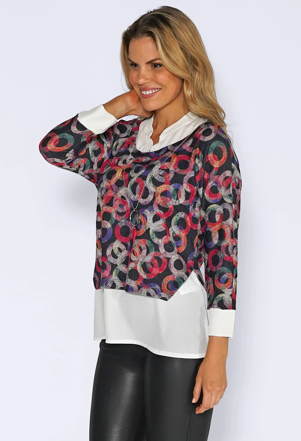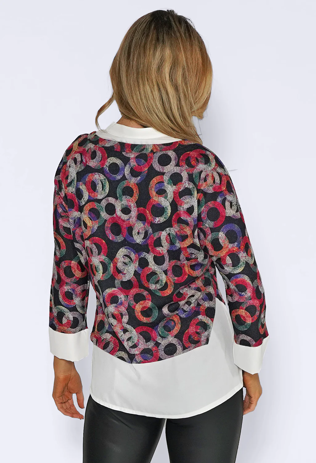 Fuchsia Ring Print Knit Jumper with White Shirt Details