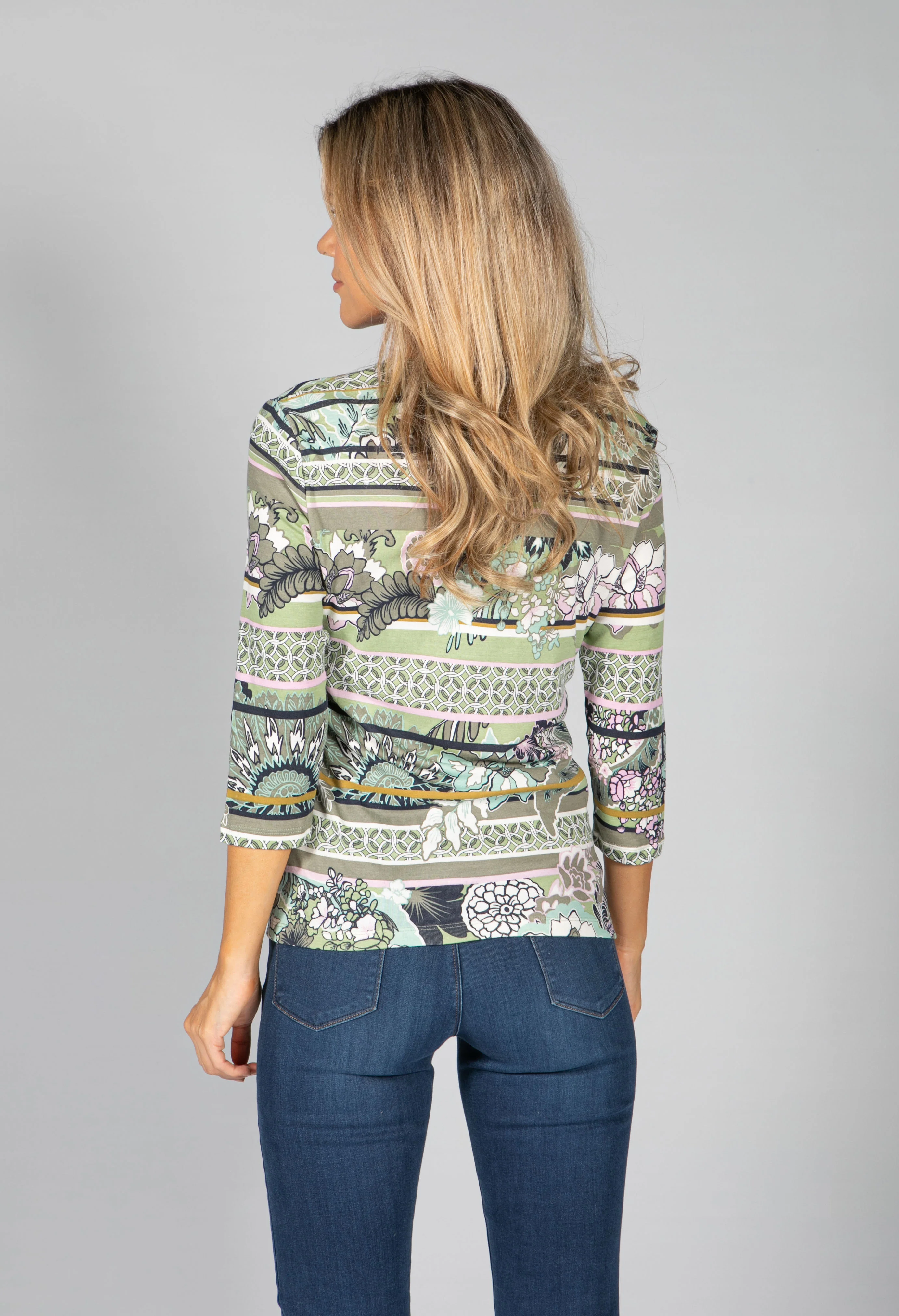 ROUND NECK TOP WITH FLORAL AND STRIPE DESIGN