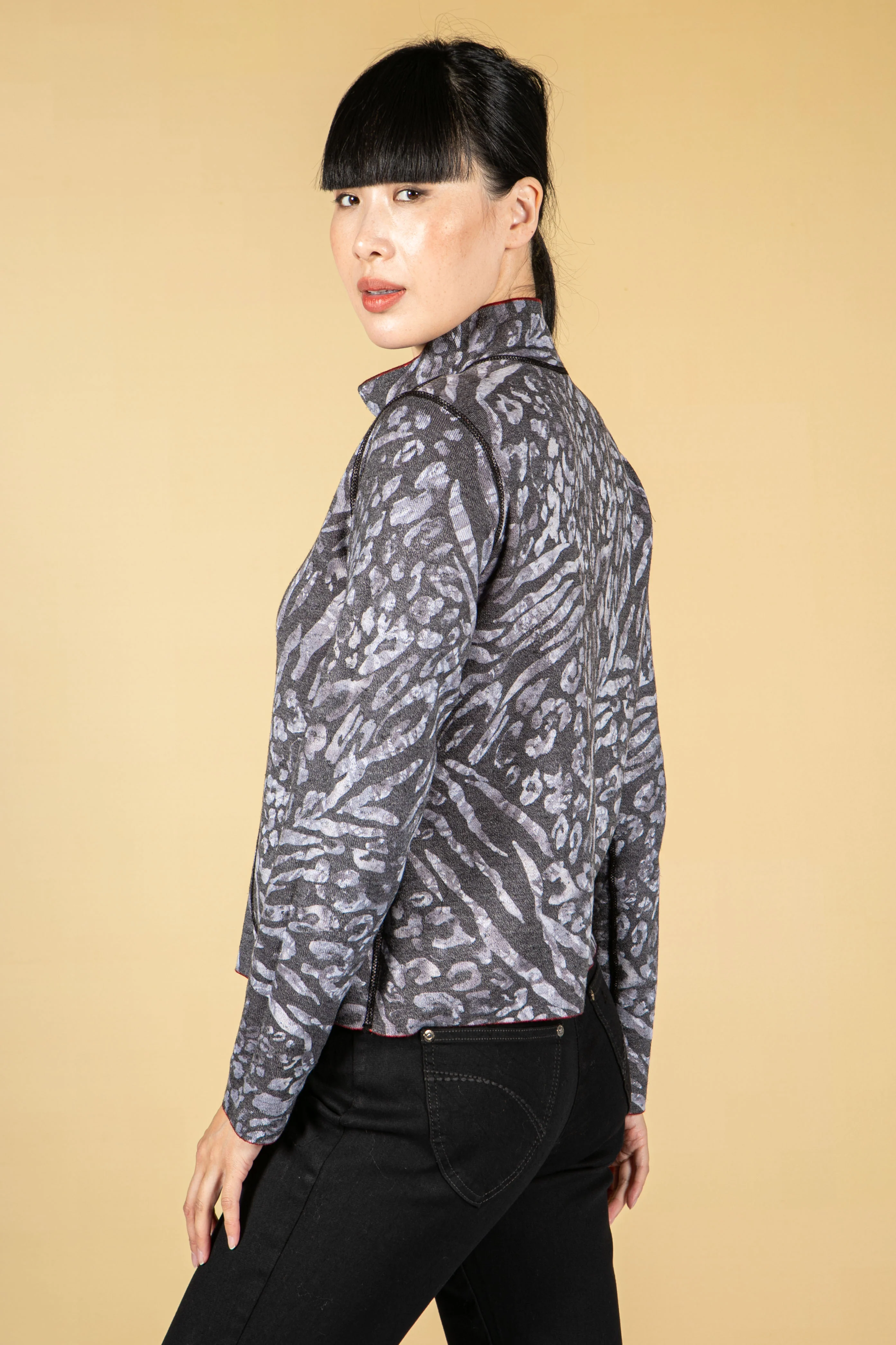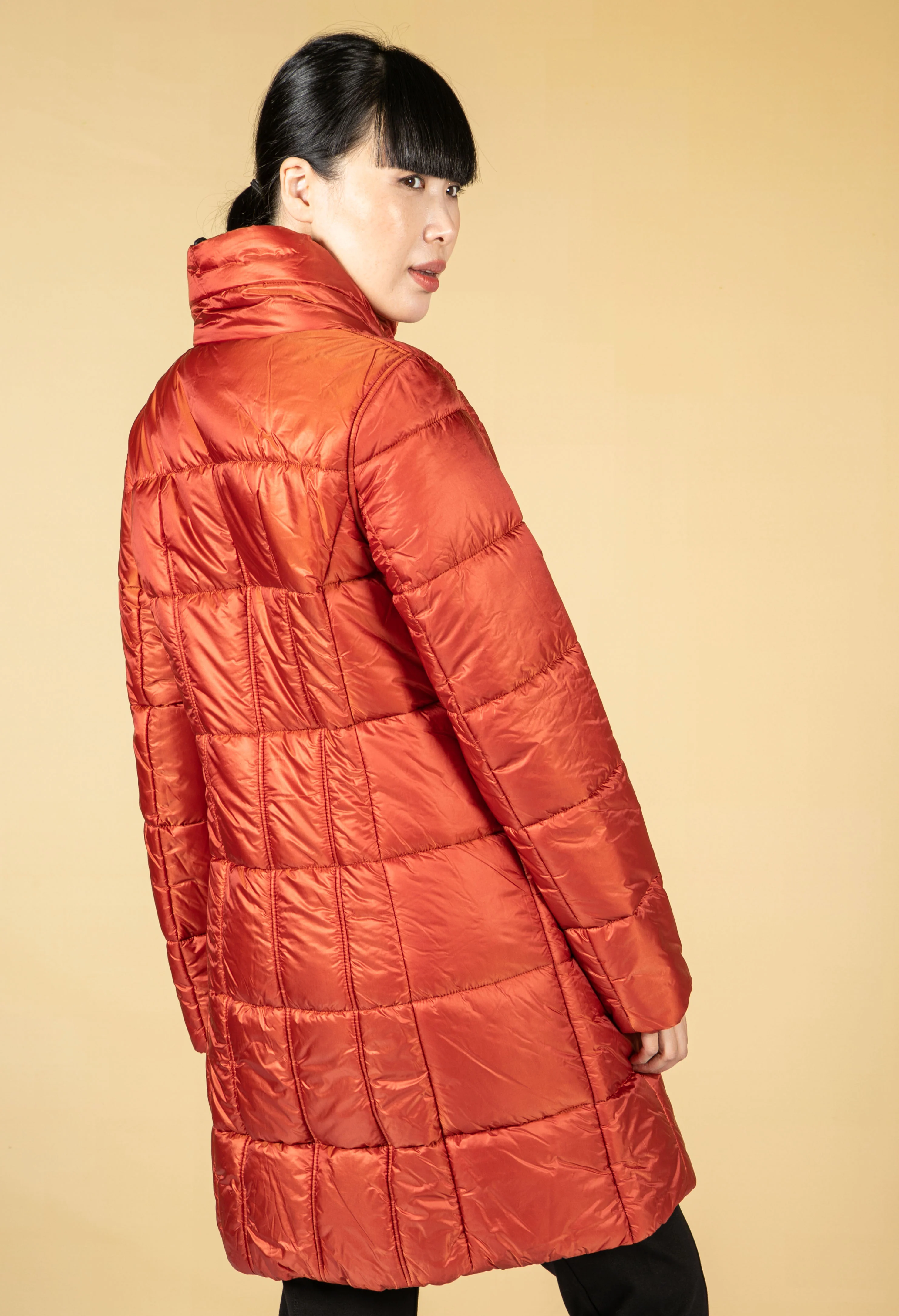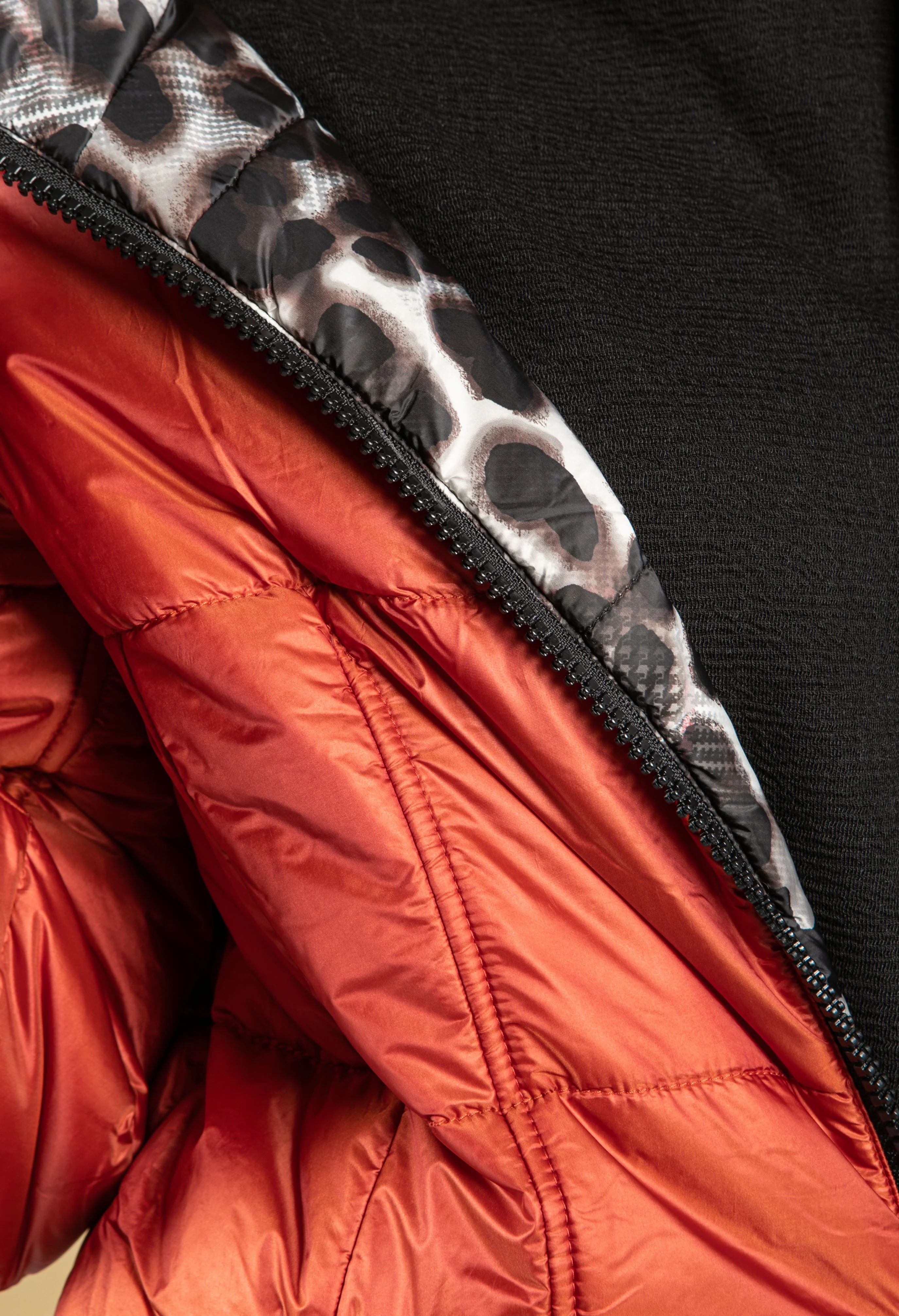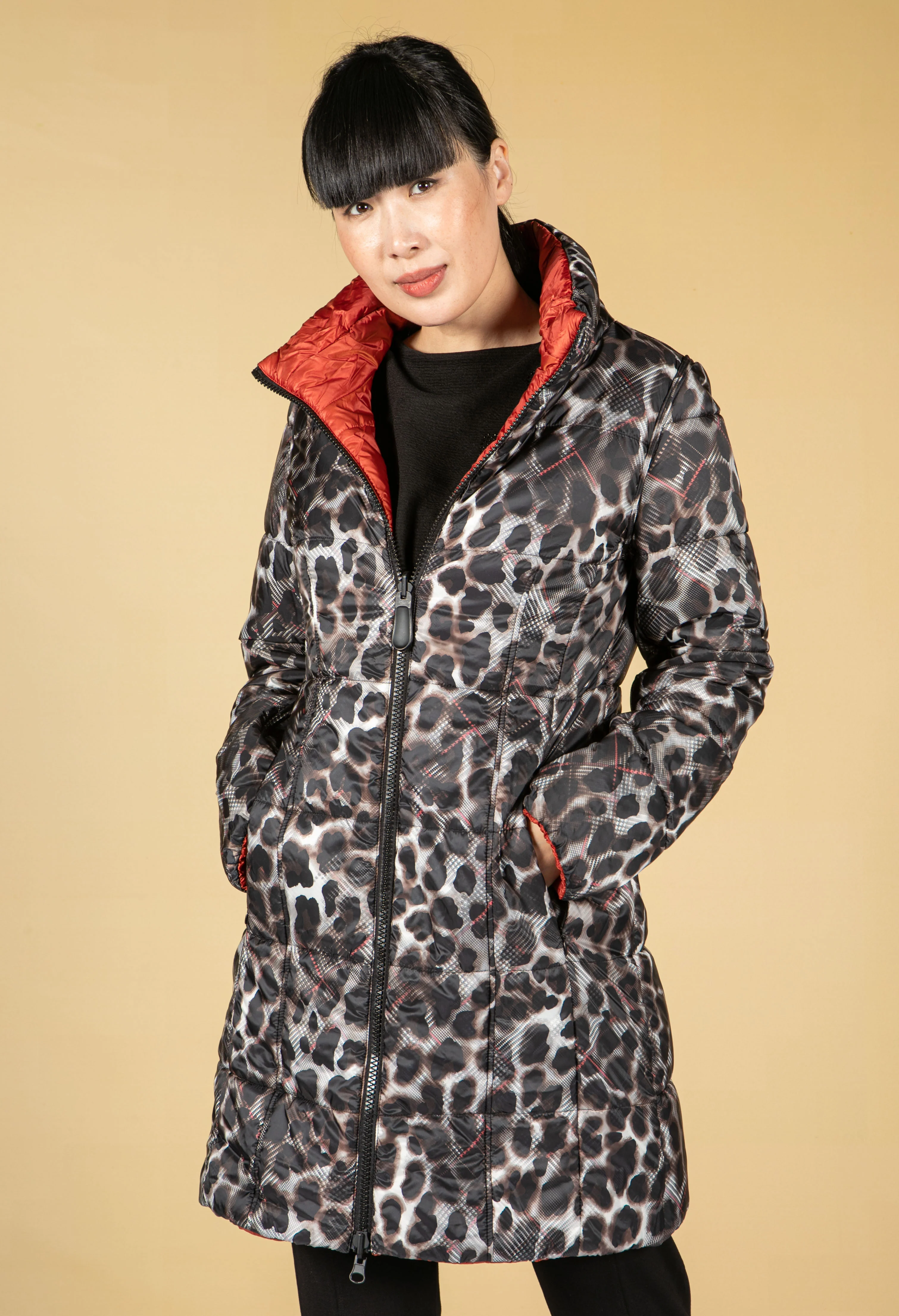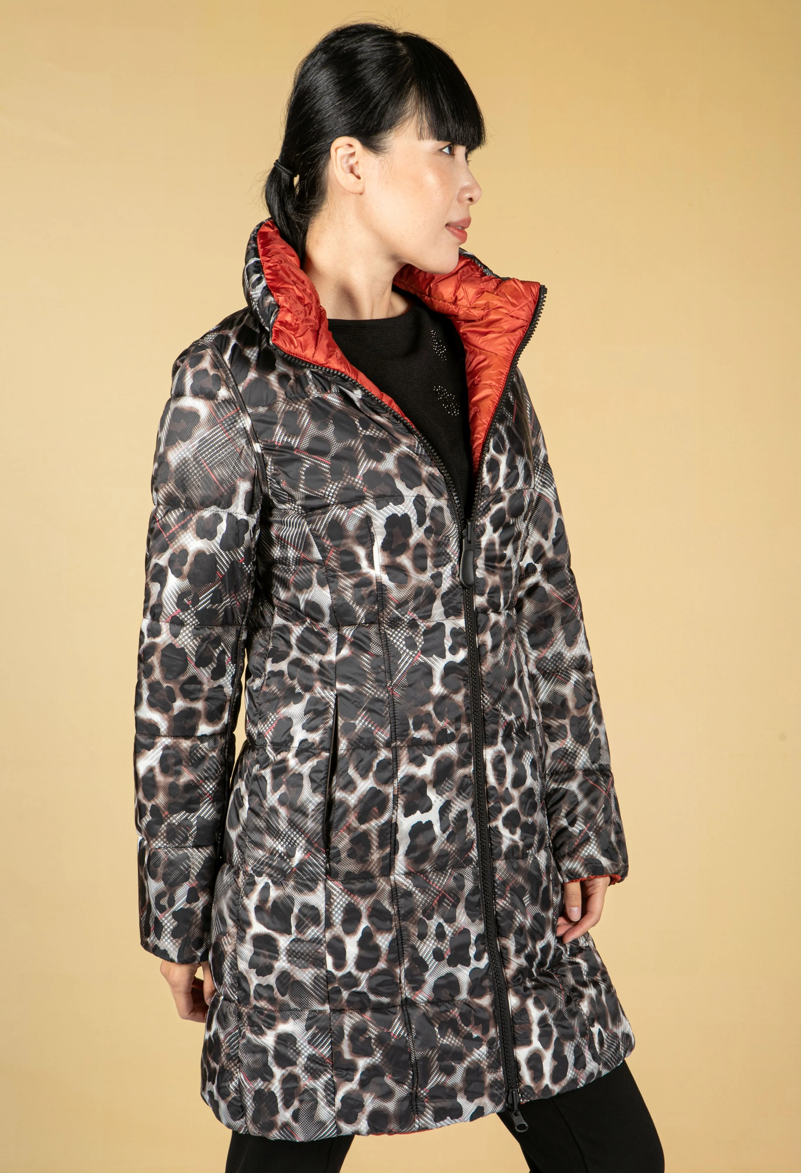 Reversible Quilted Long Coat in Orange/Animal Check Print
