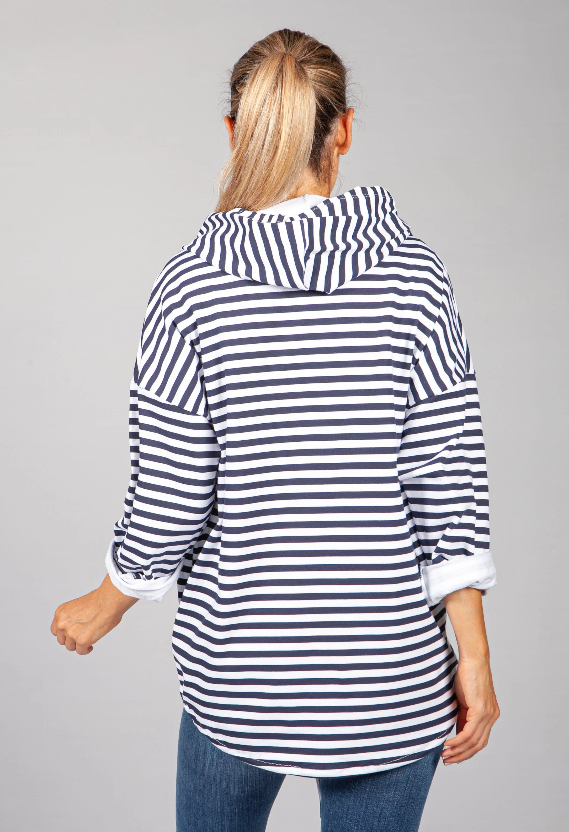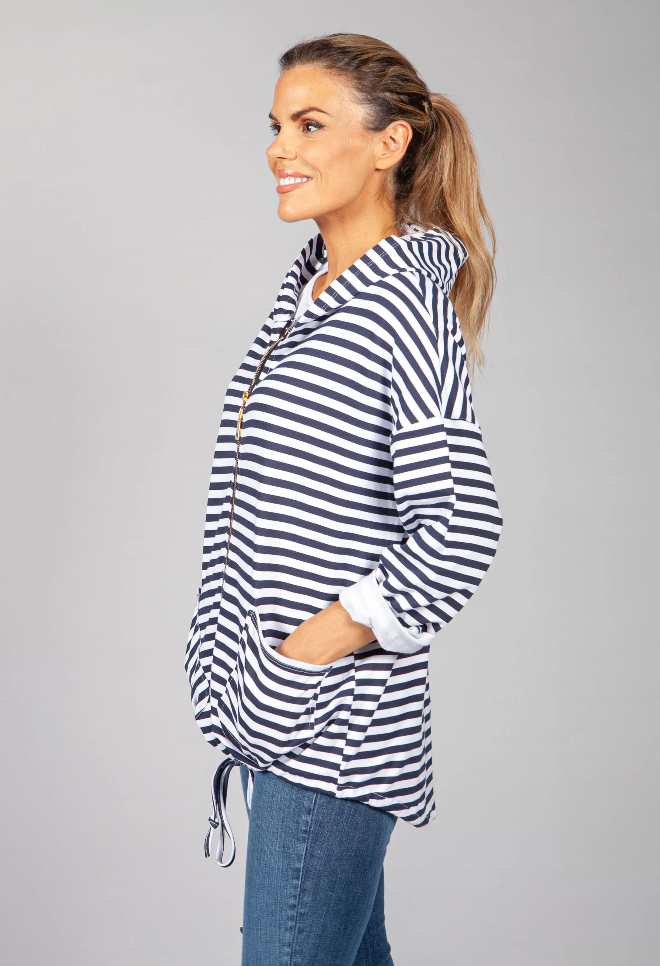 PAMELA SCOTT NAVY & WHITE NARROW STRIPED ZIP UP HOODIE