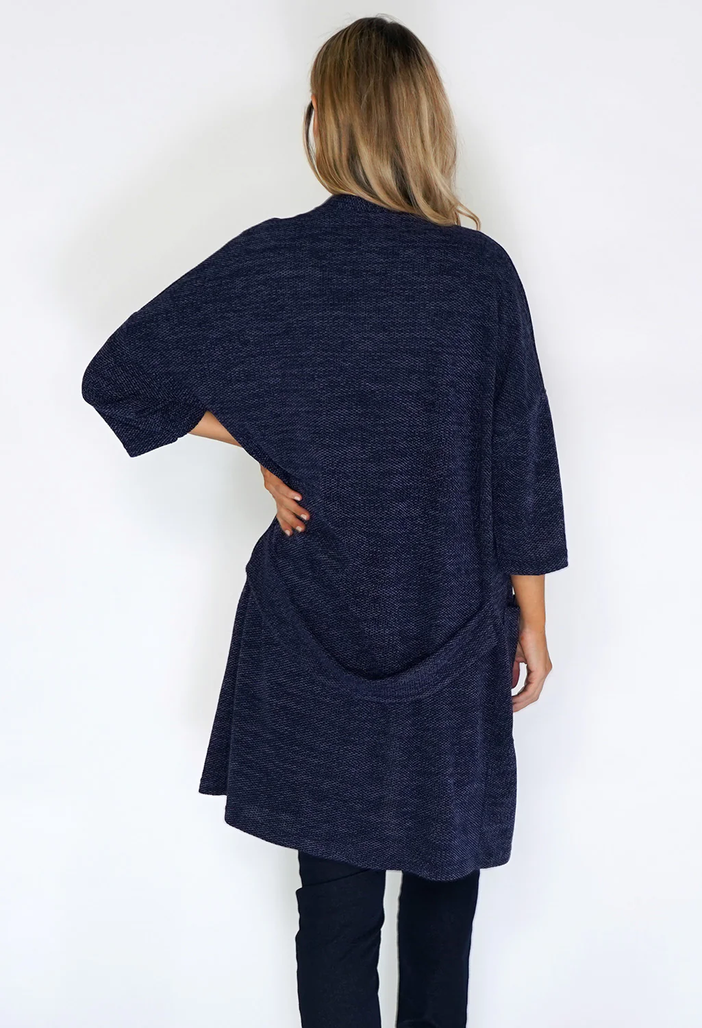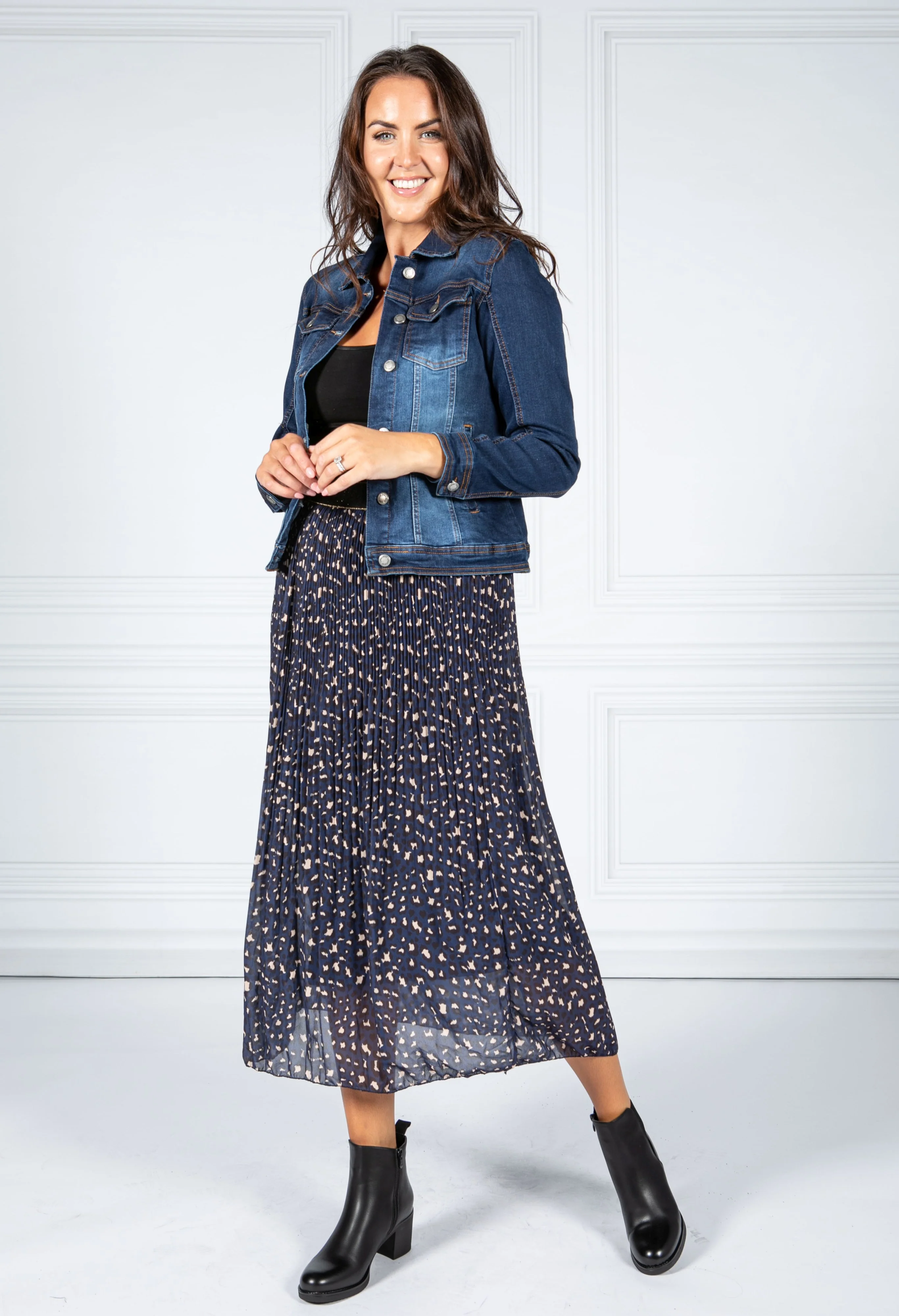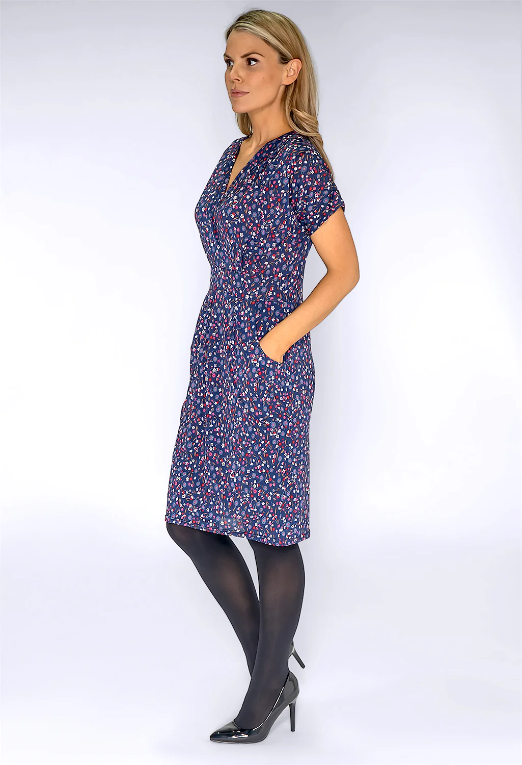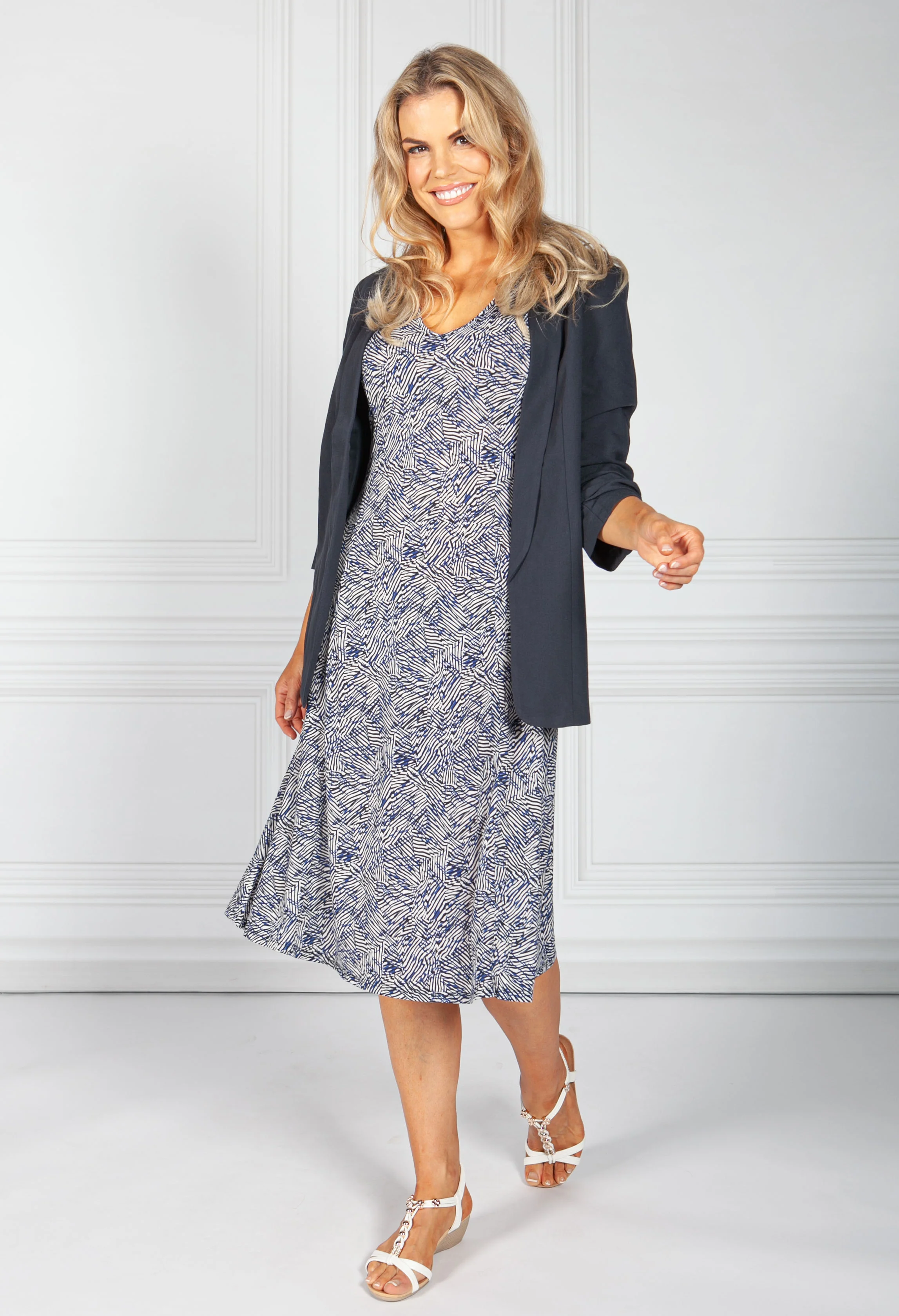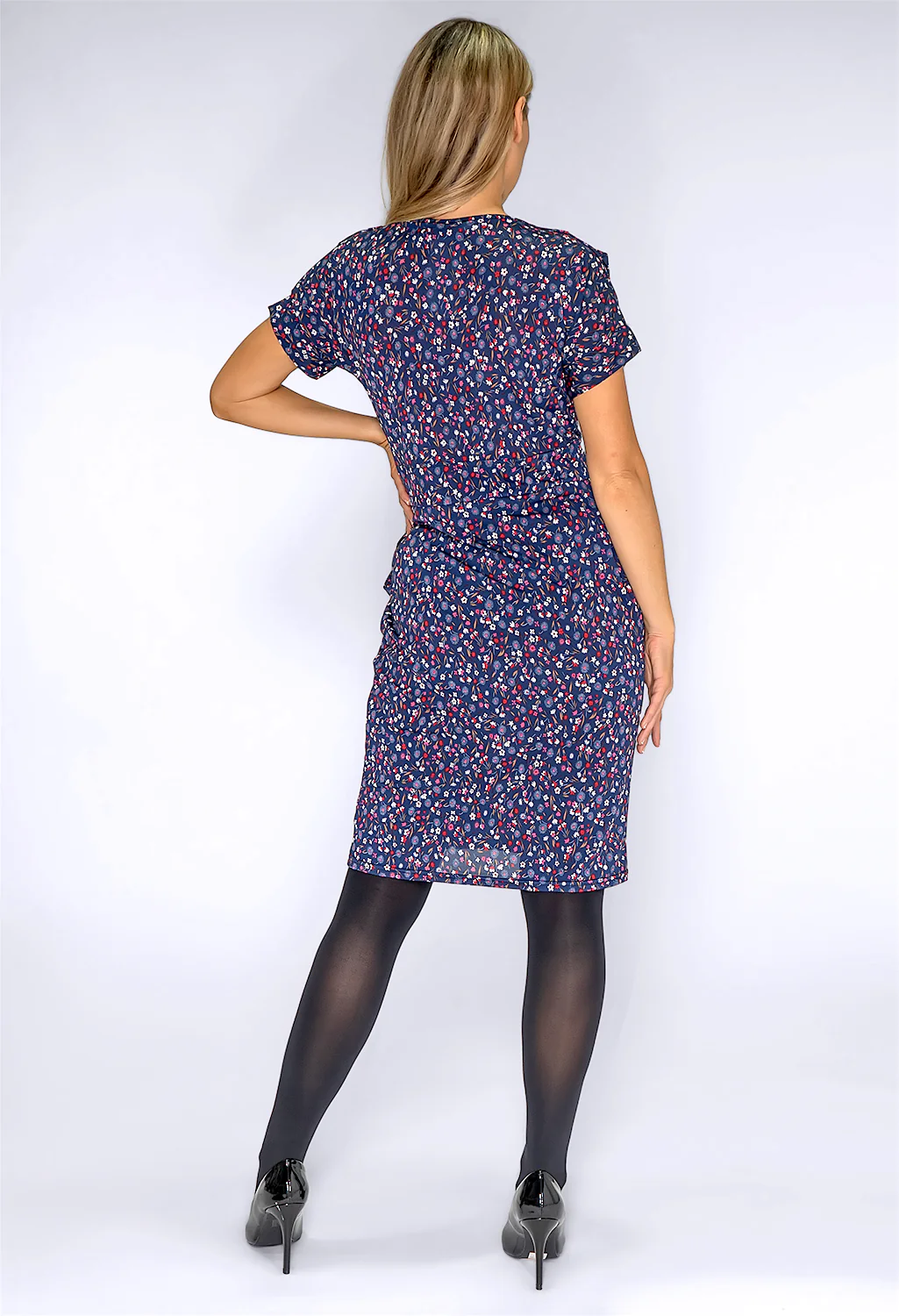 Navy Pattern Stripe V-Neck Dress with Faux Wrap