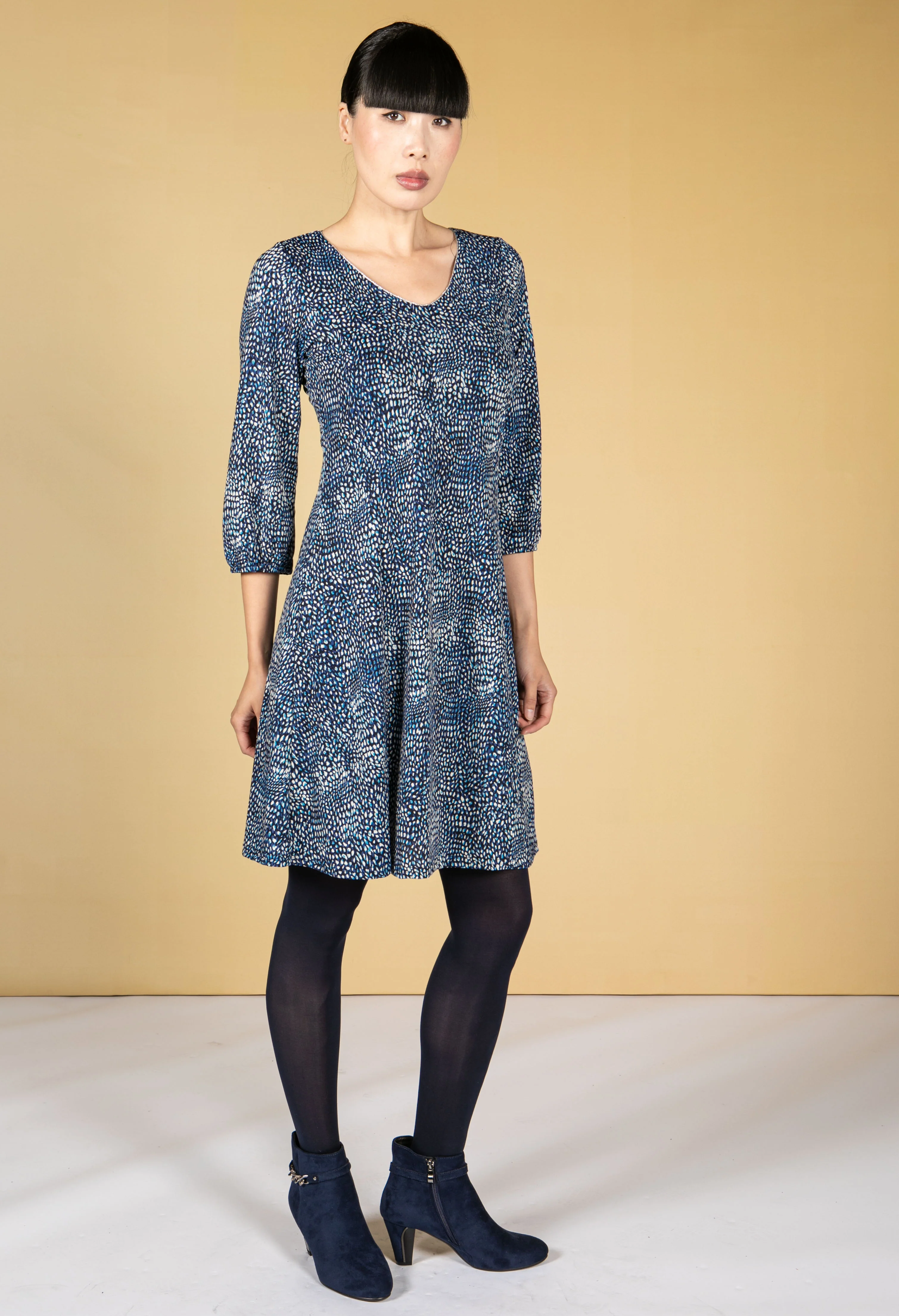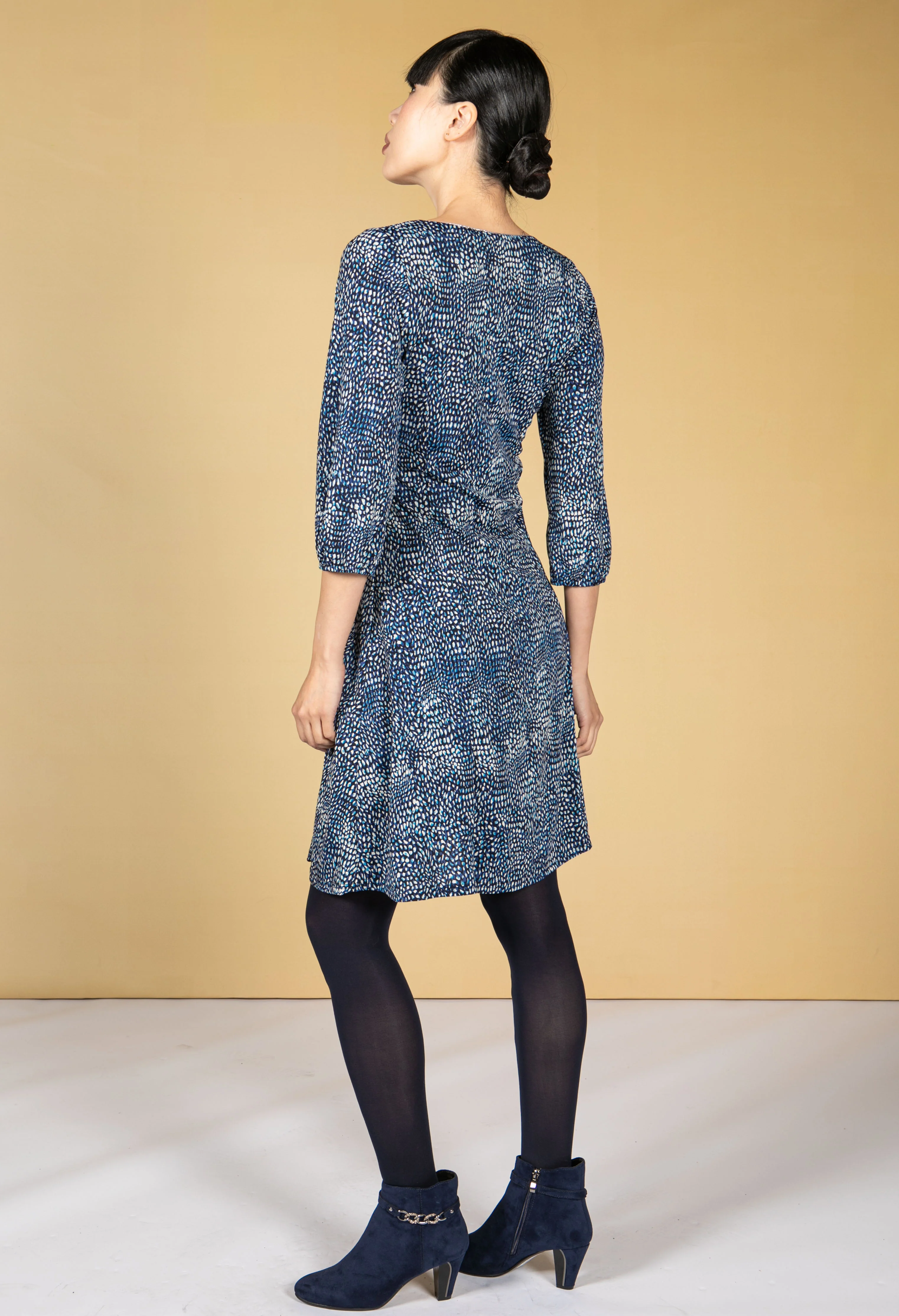 navy dress in polka dot print