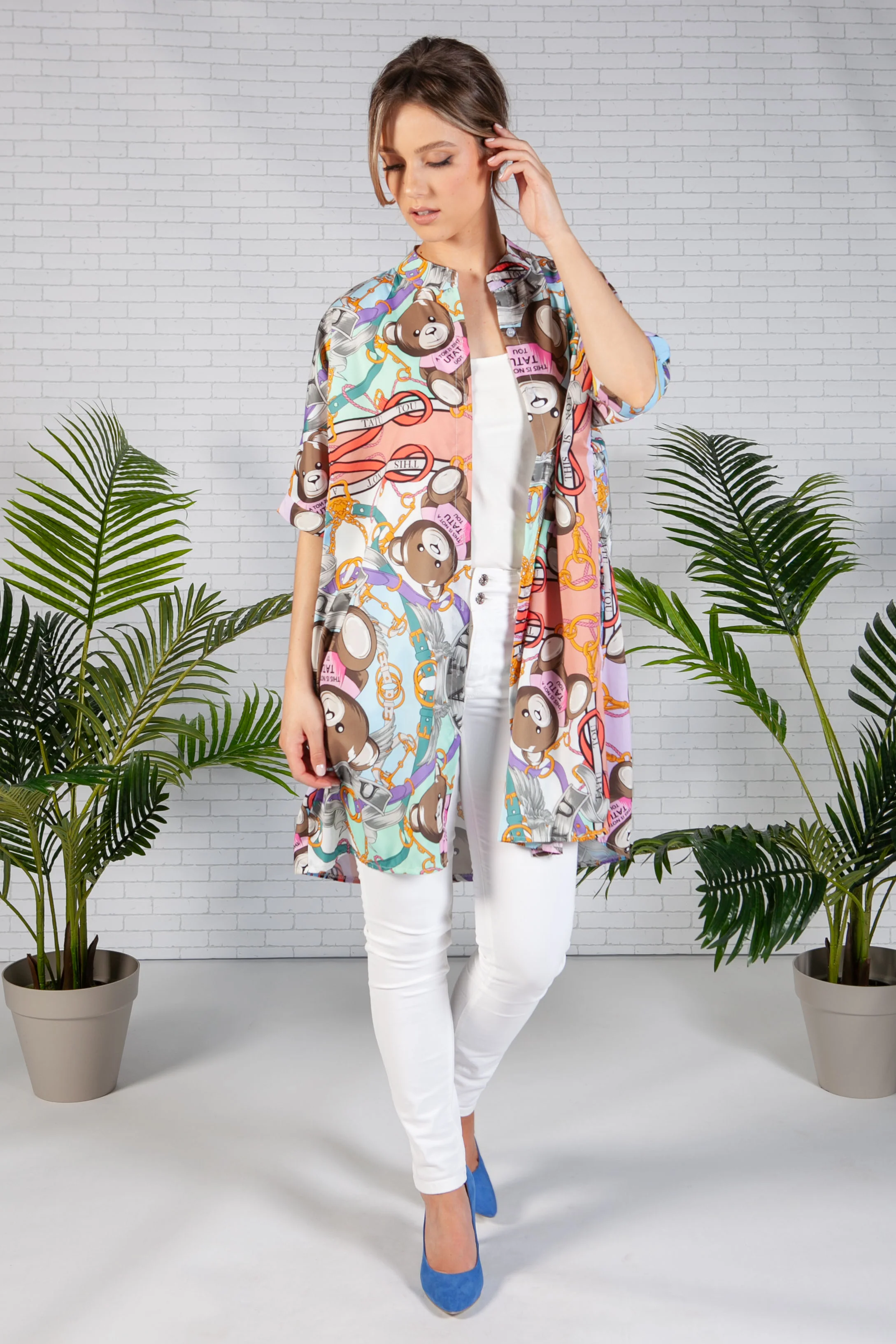 Mandarin Collar Shirt with Teddy Print