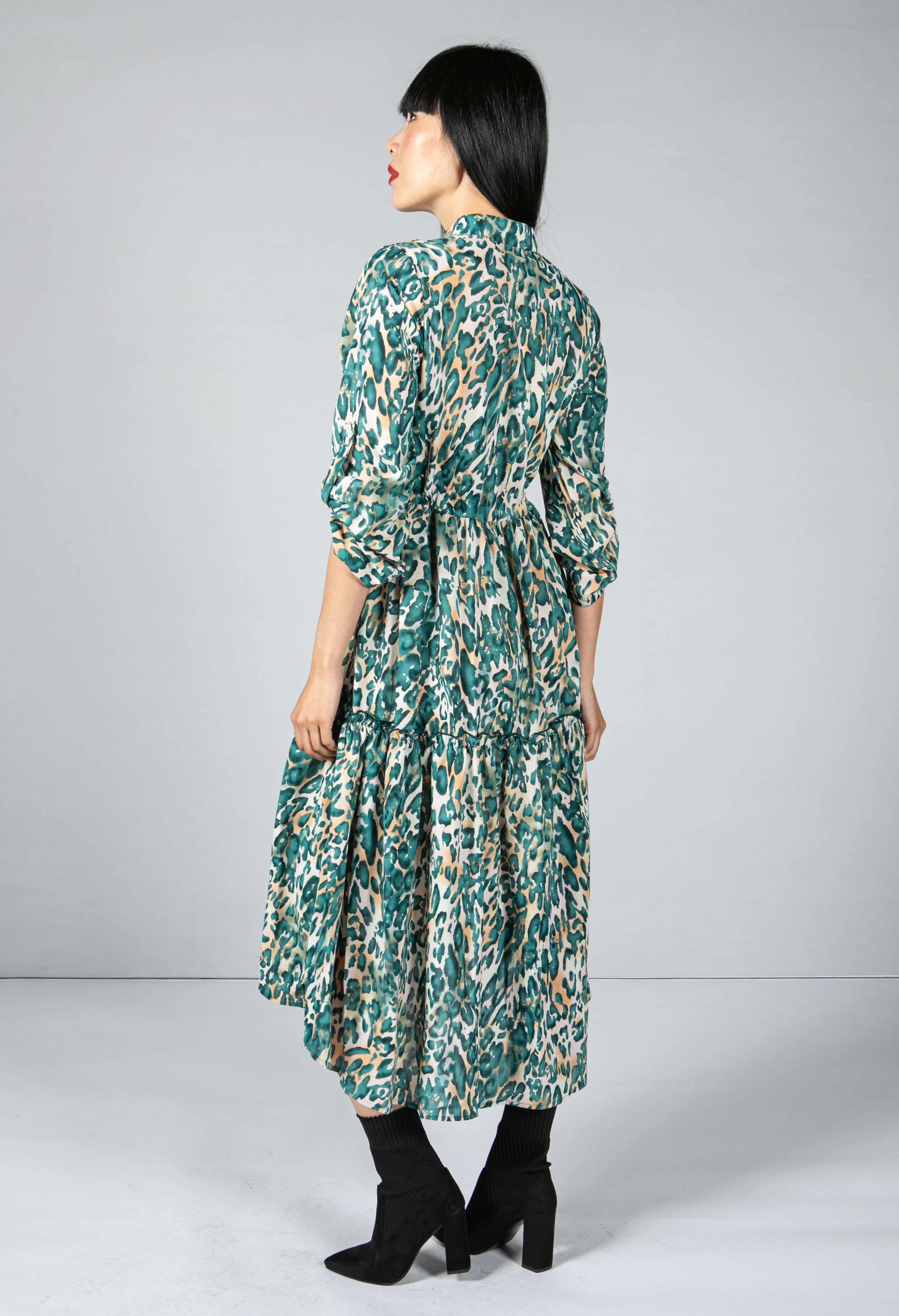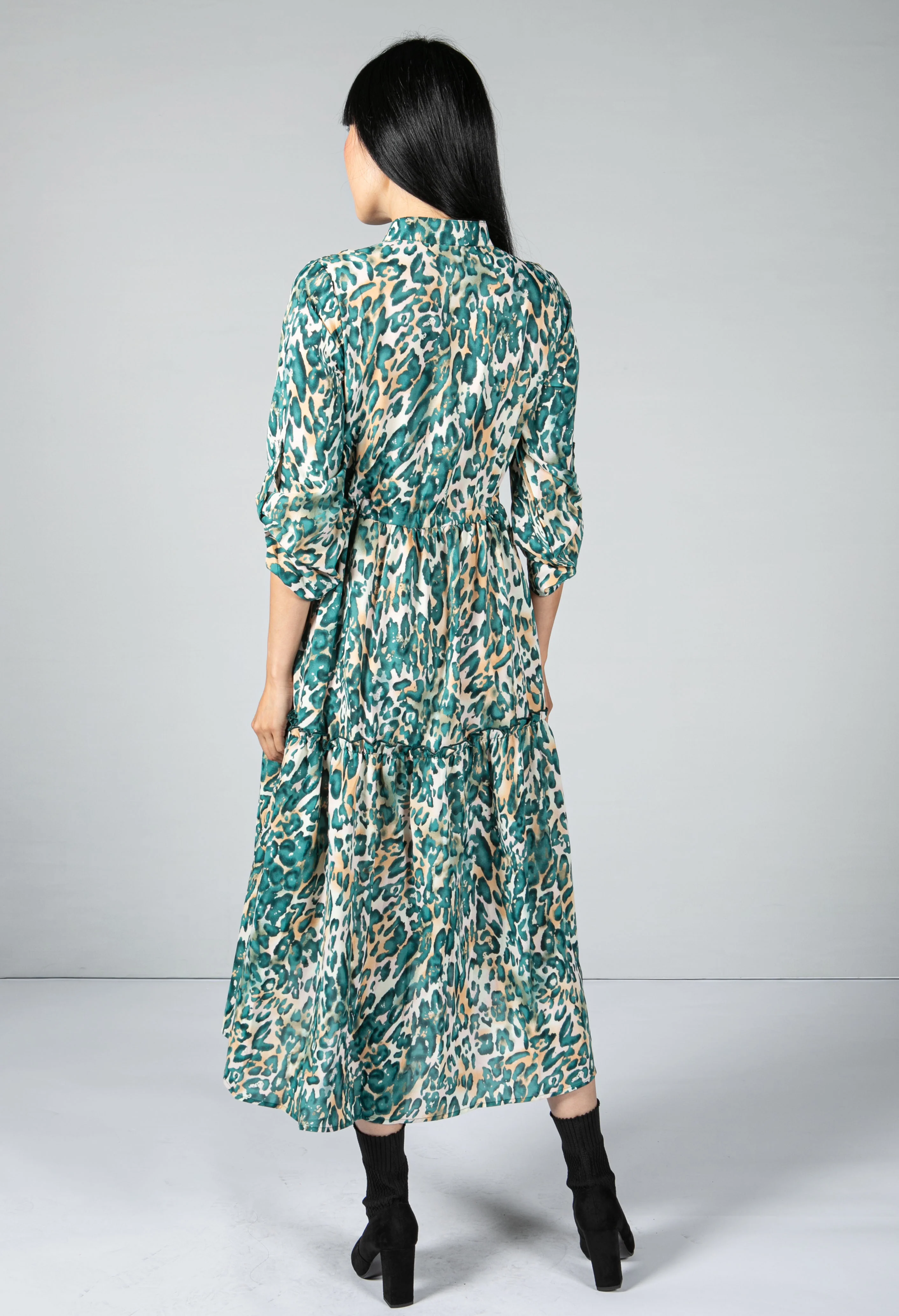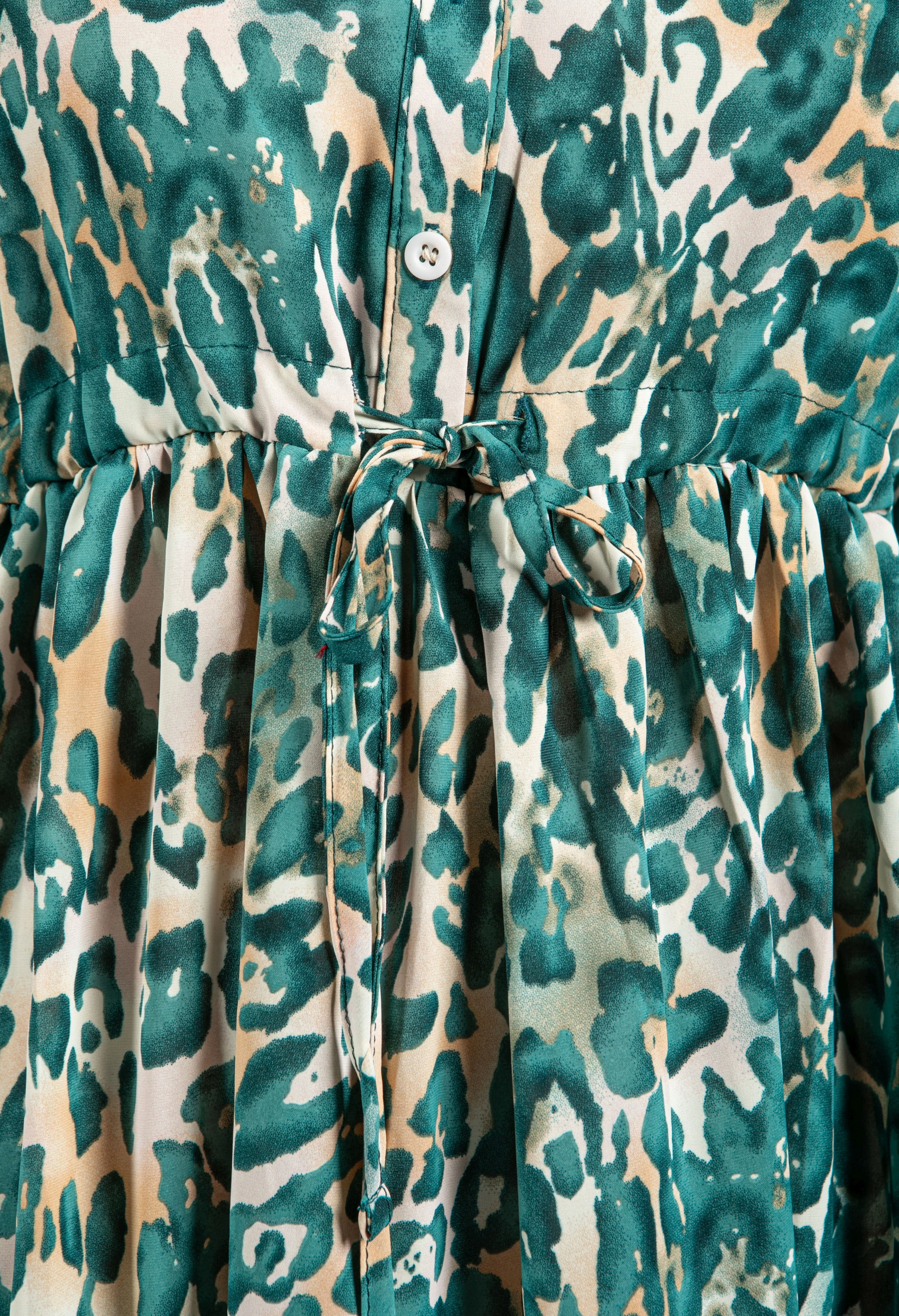 Leopard Print Tiered Shirt Dress In Teal