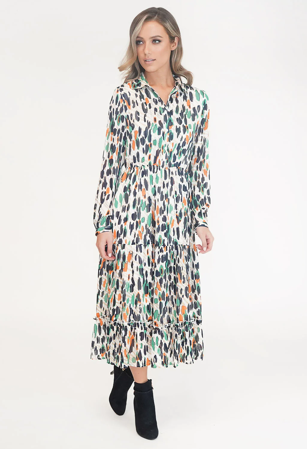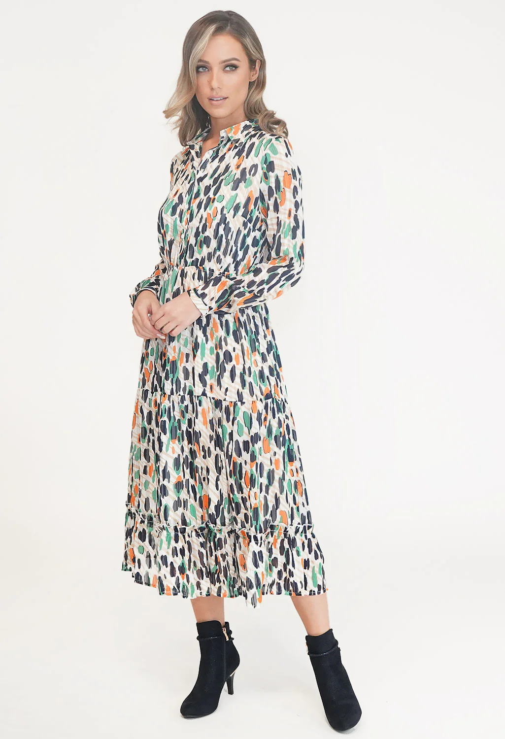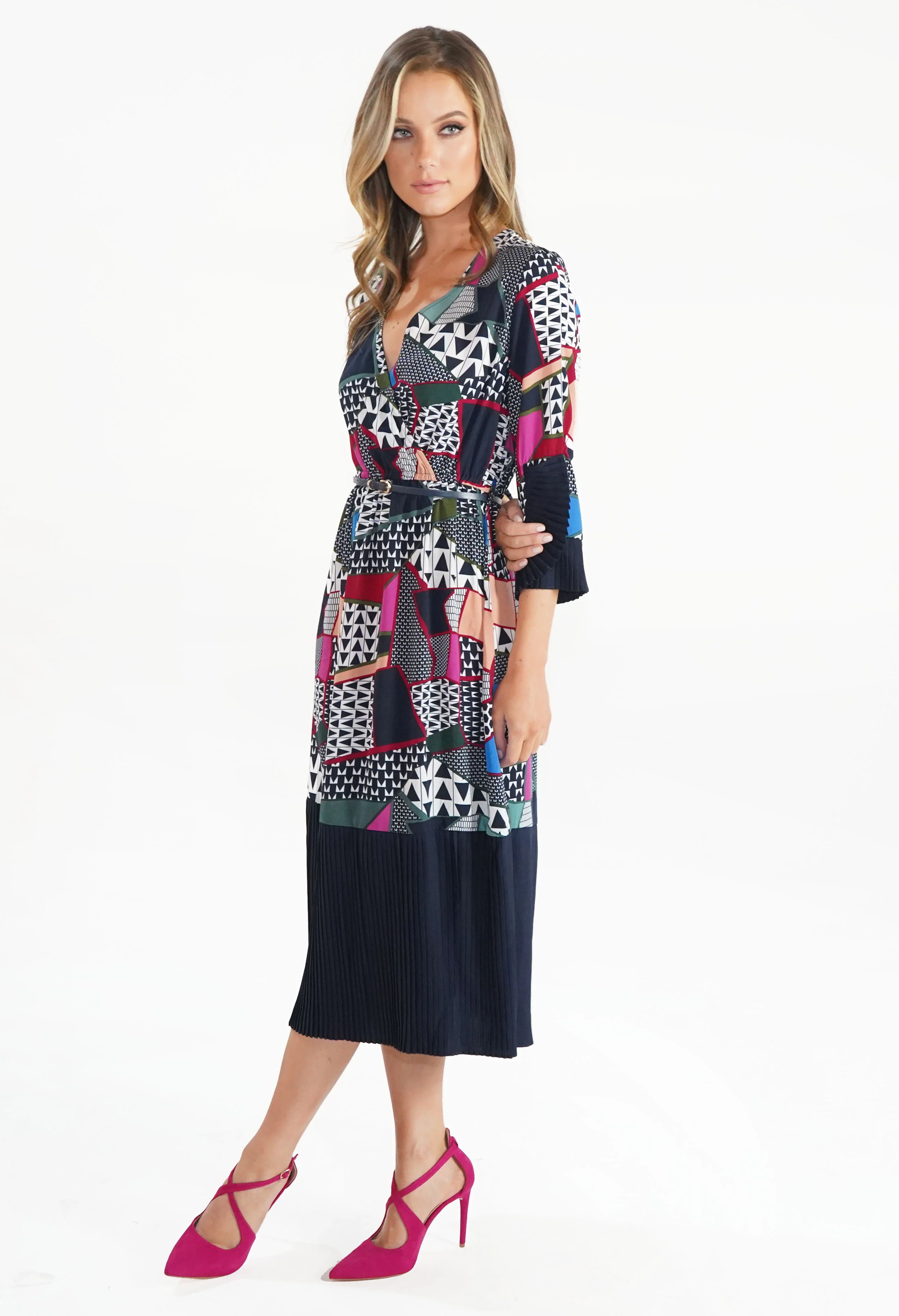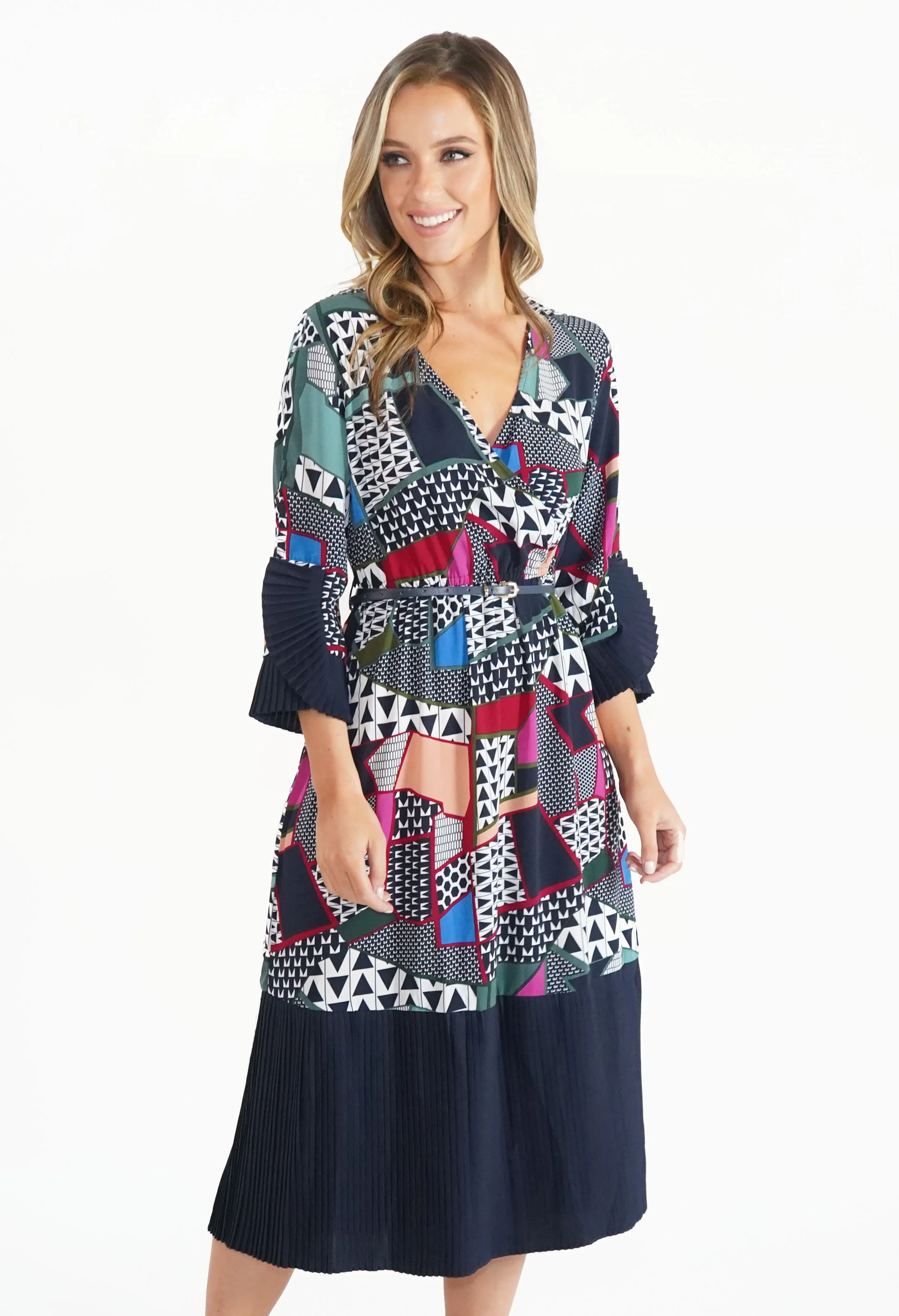 Multi Coloured Cross Over Patterned Dress with Pleated Detail