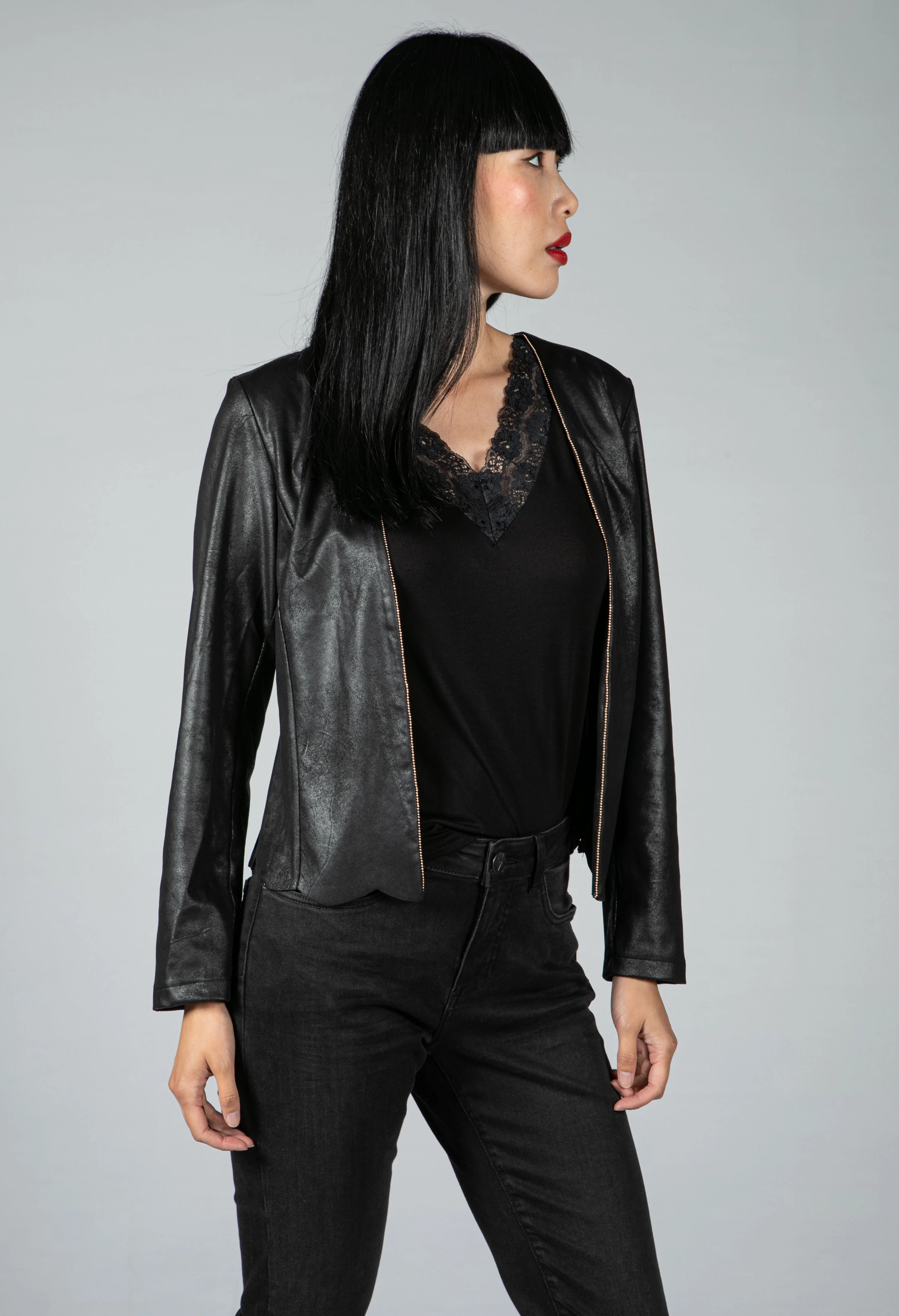 Faux Vintage Leather Jacket with Gold Bead Embellishment