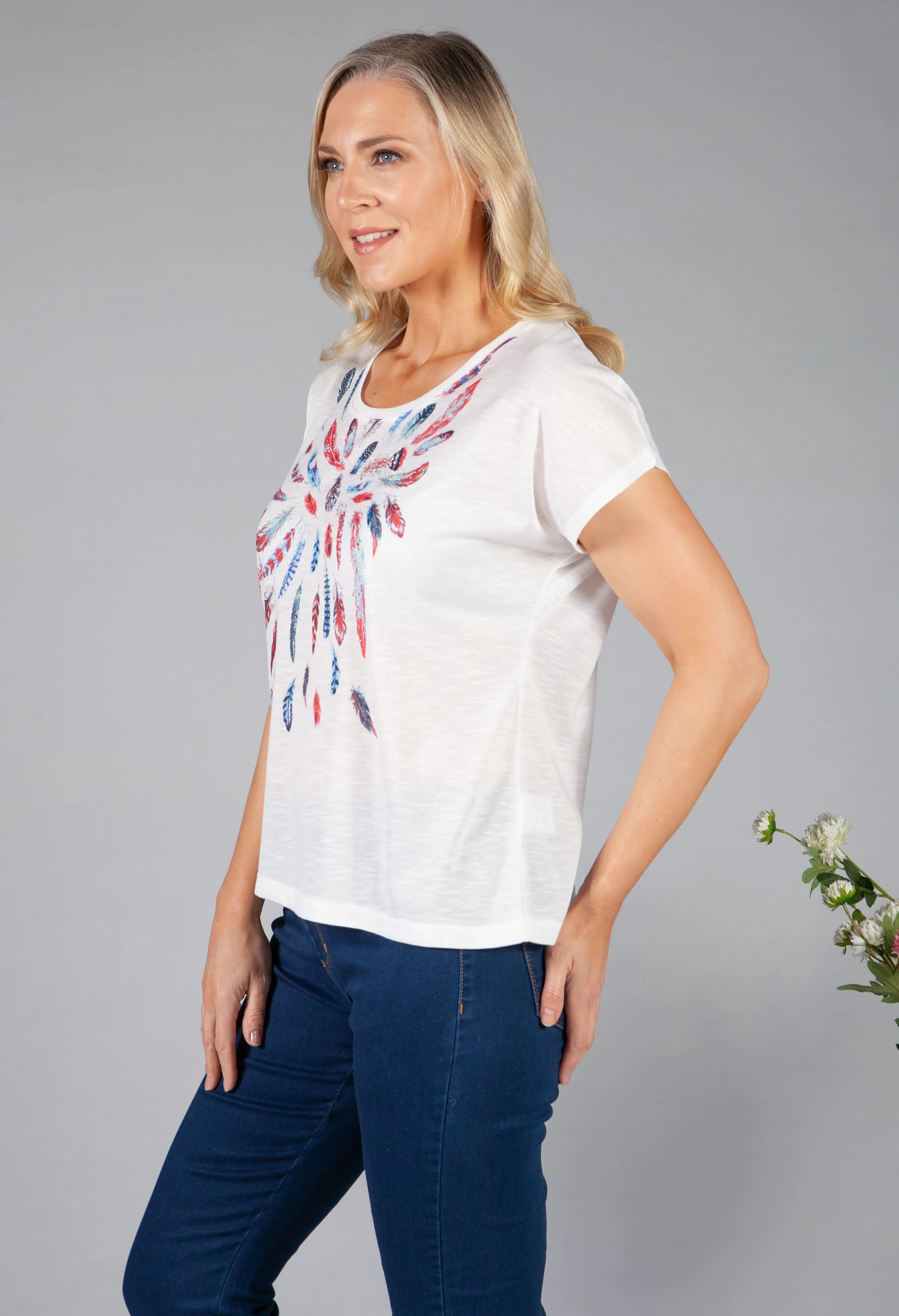 Feather Print Top with Diamante Detailing