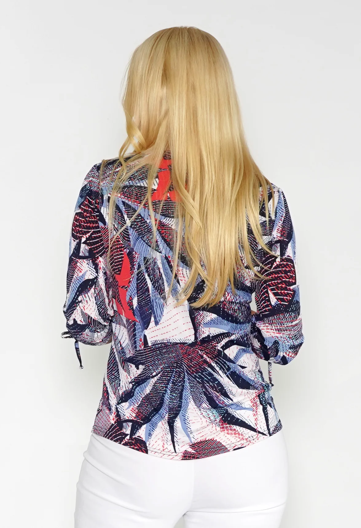TROPICAL LEAF DESIGN TOP WITH PLEAT NECK DETAIL