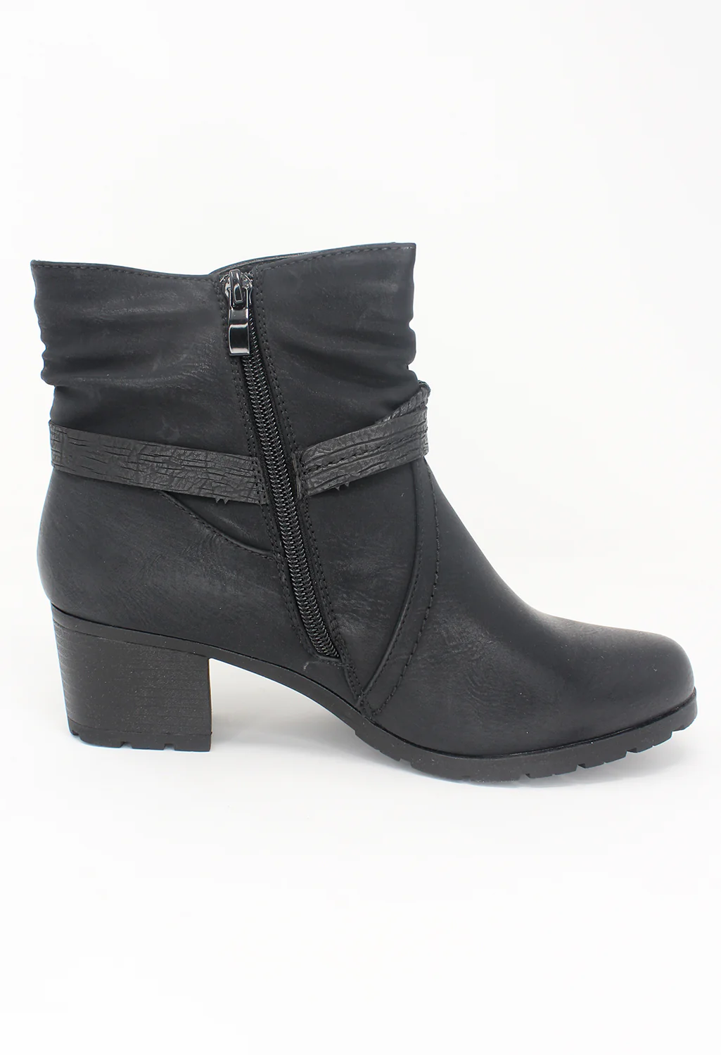 Black Block Heel Ankle Boot with Gold Zip