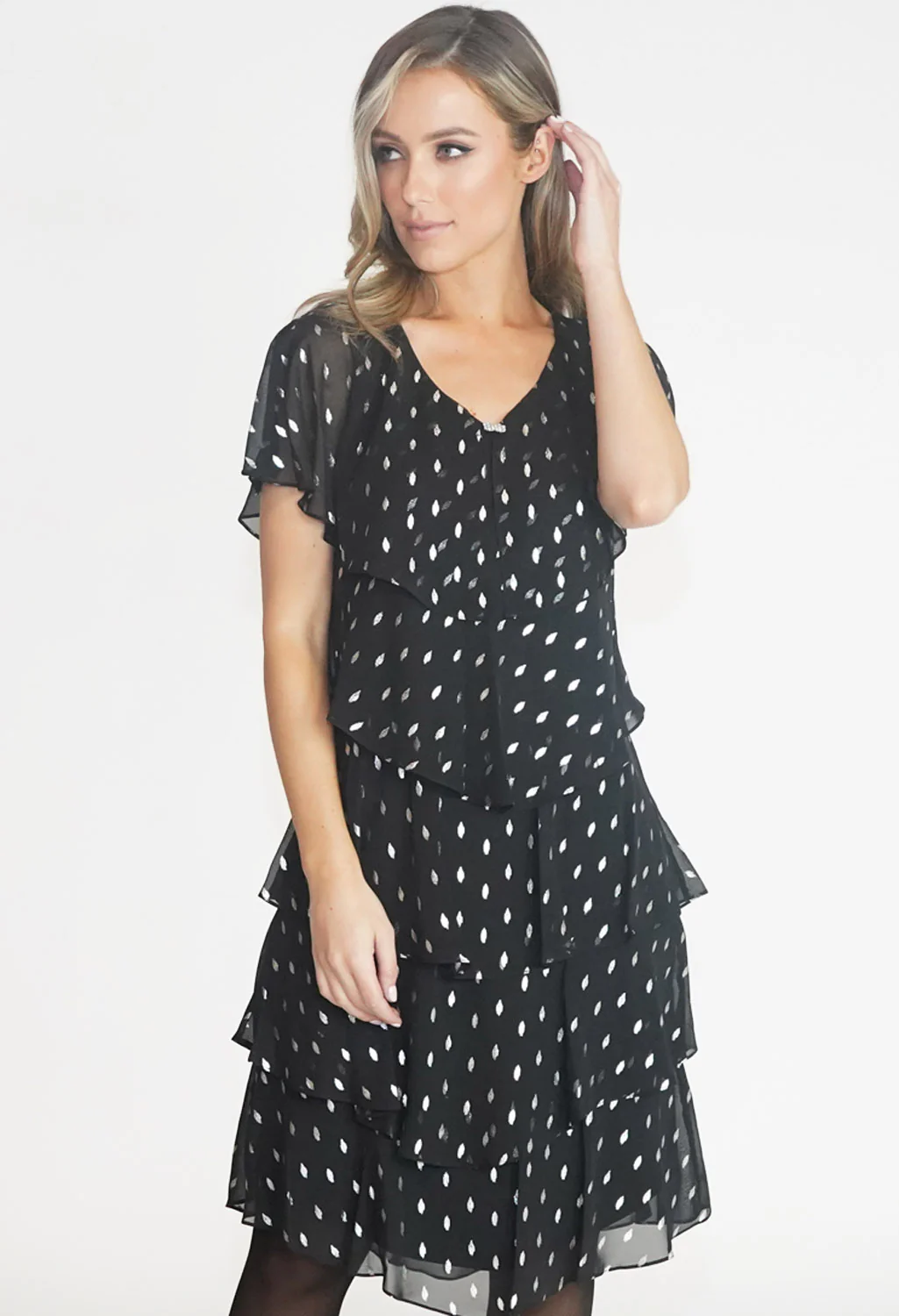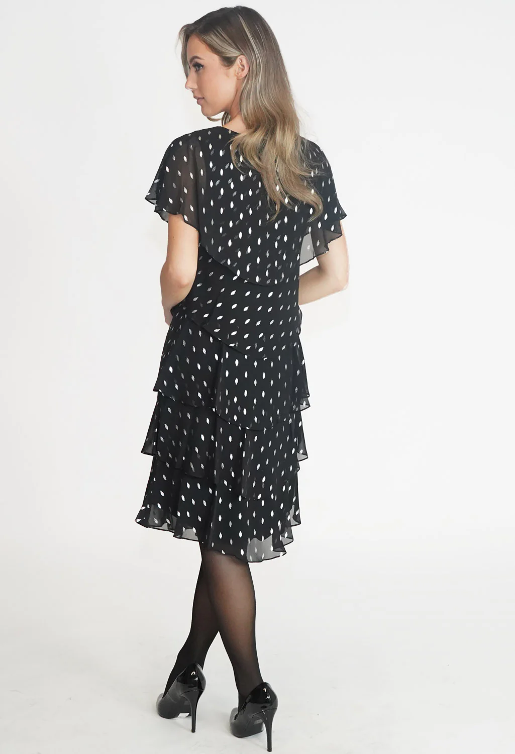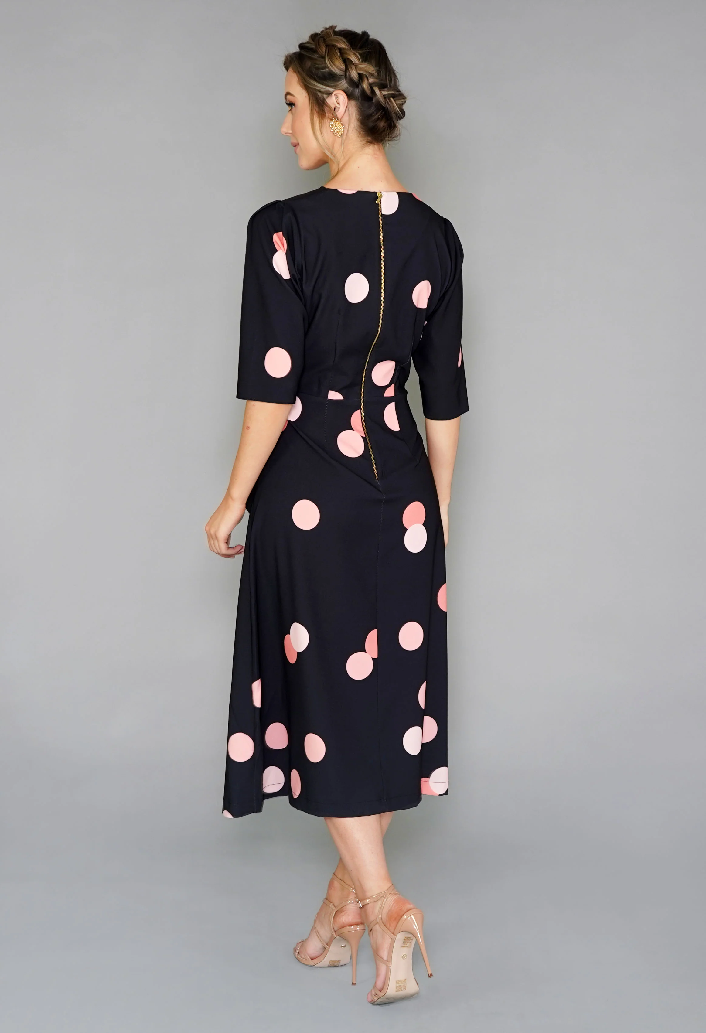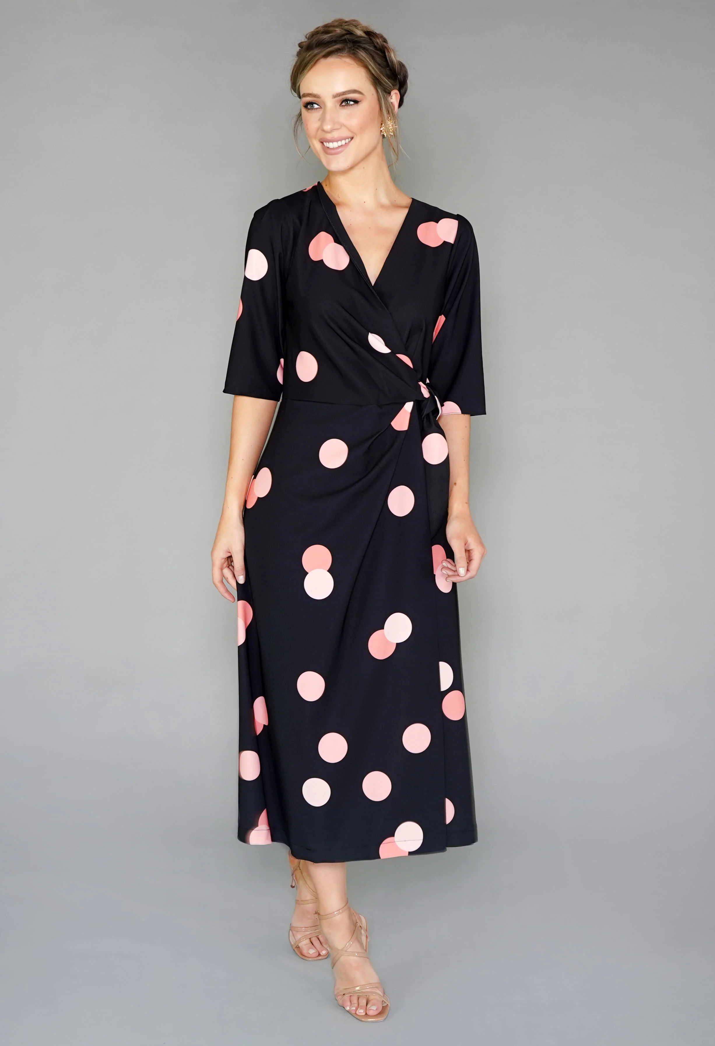 BLACK AND PEACH POLKA DOT WRAP TIE DRESS