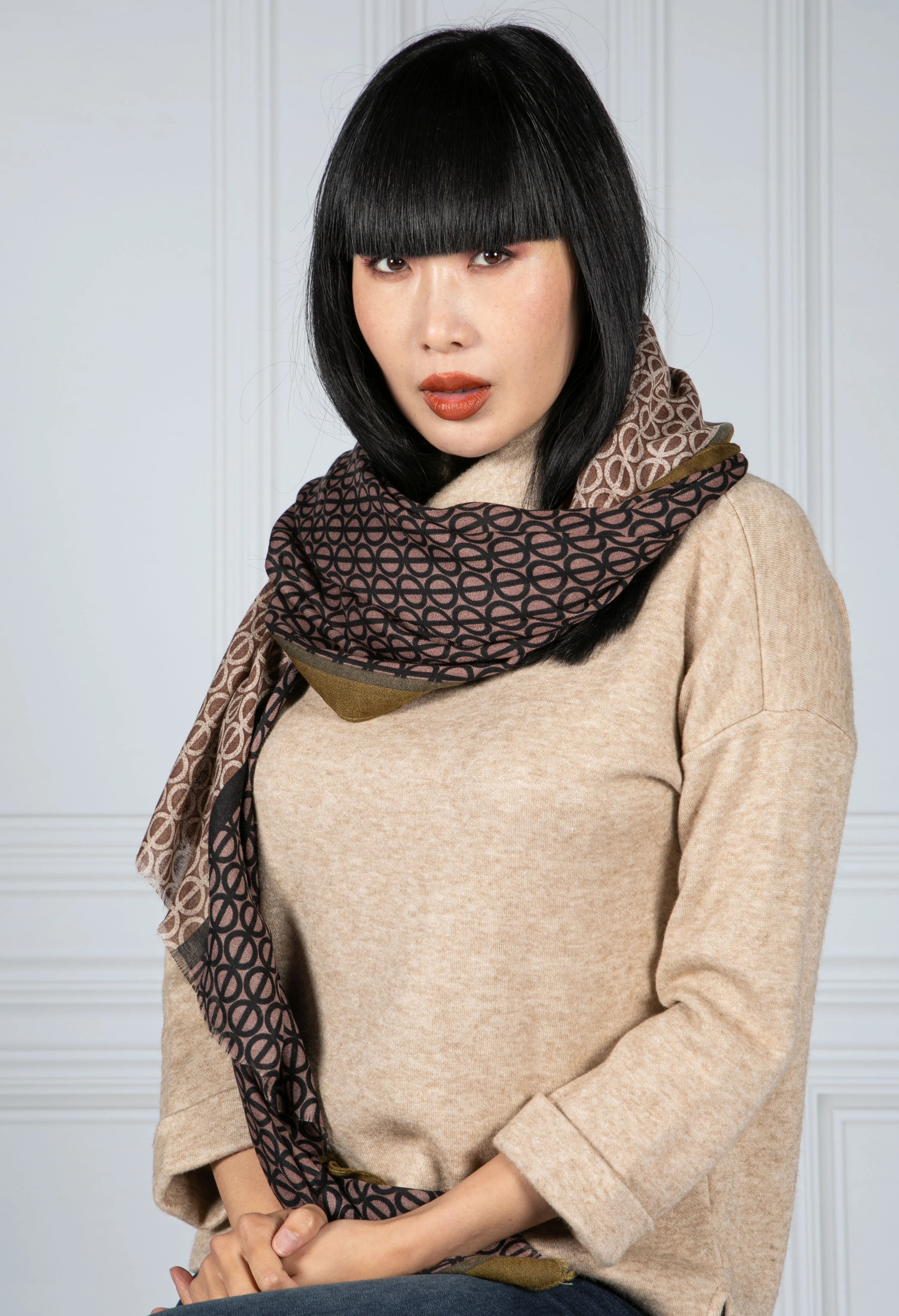 Taupe Geometric Print Scarf with Khaki Trim