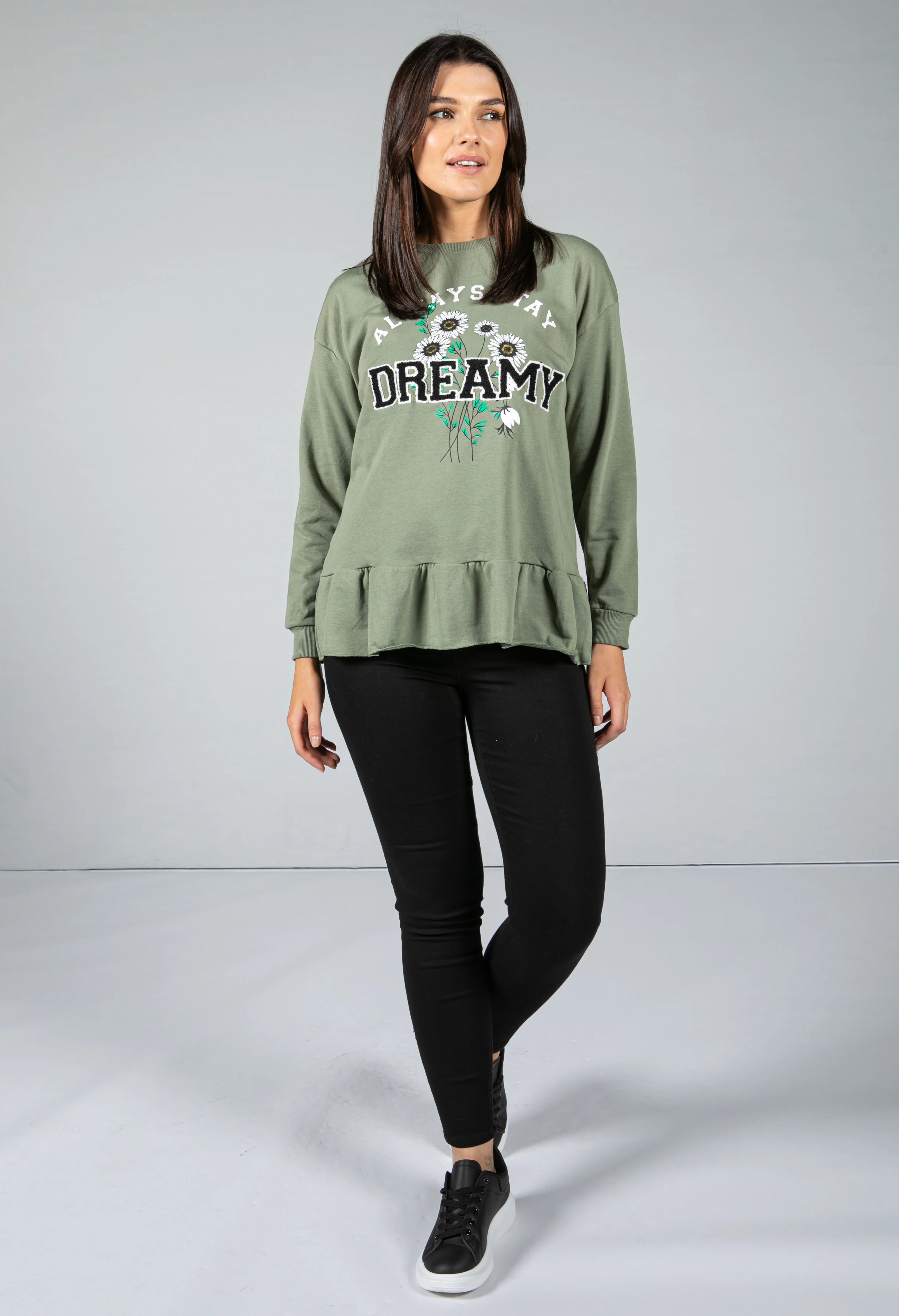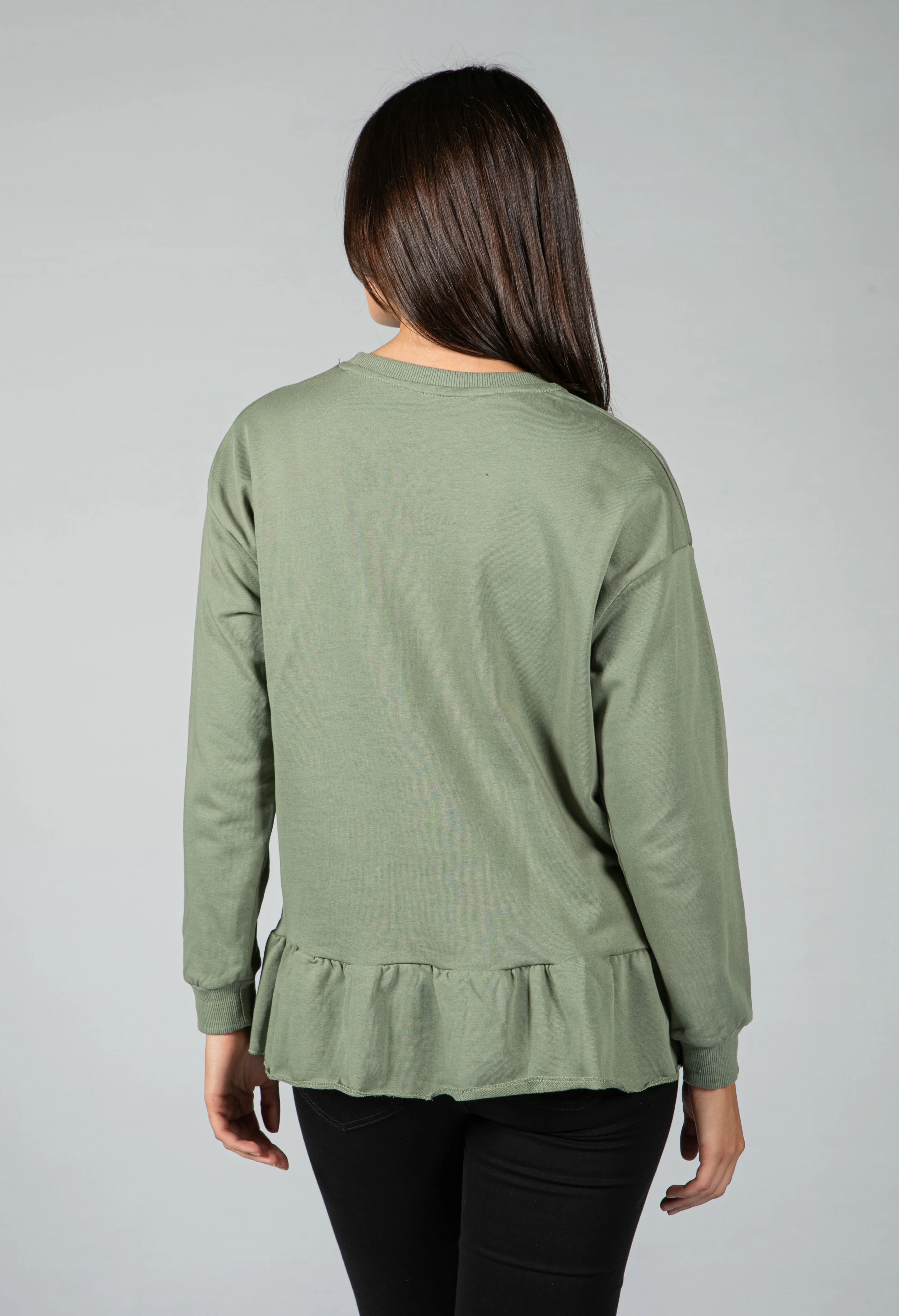 PAMELA SCOTT CREW NECK GRAPHIC JUMPER IN MOSS GREEN