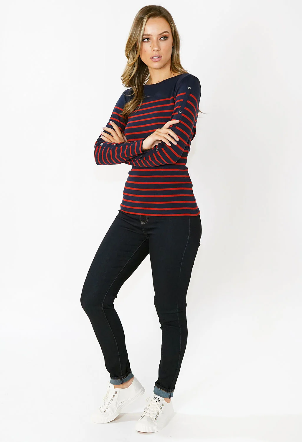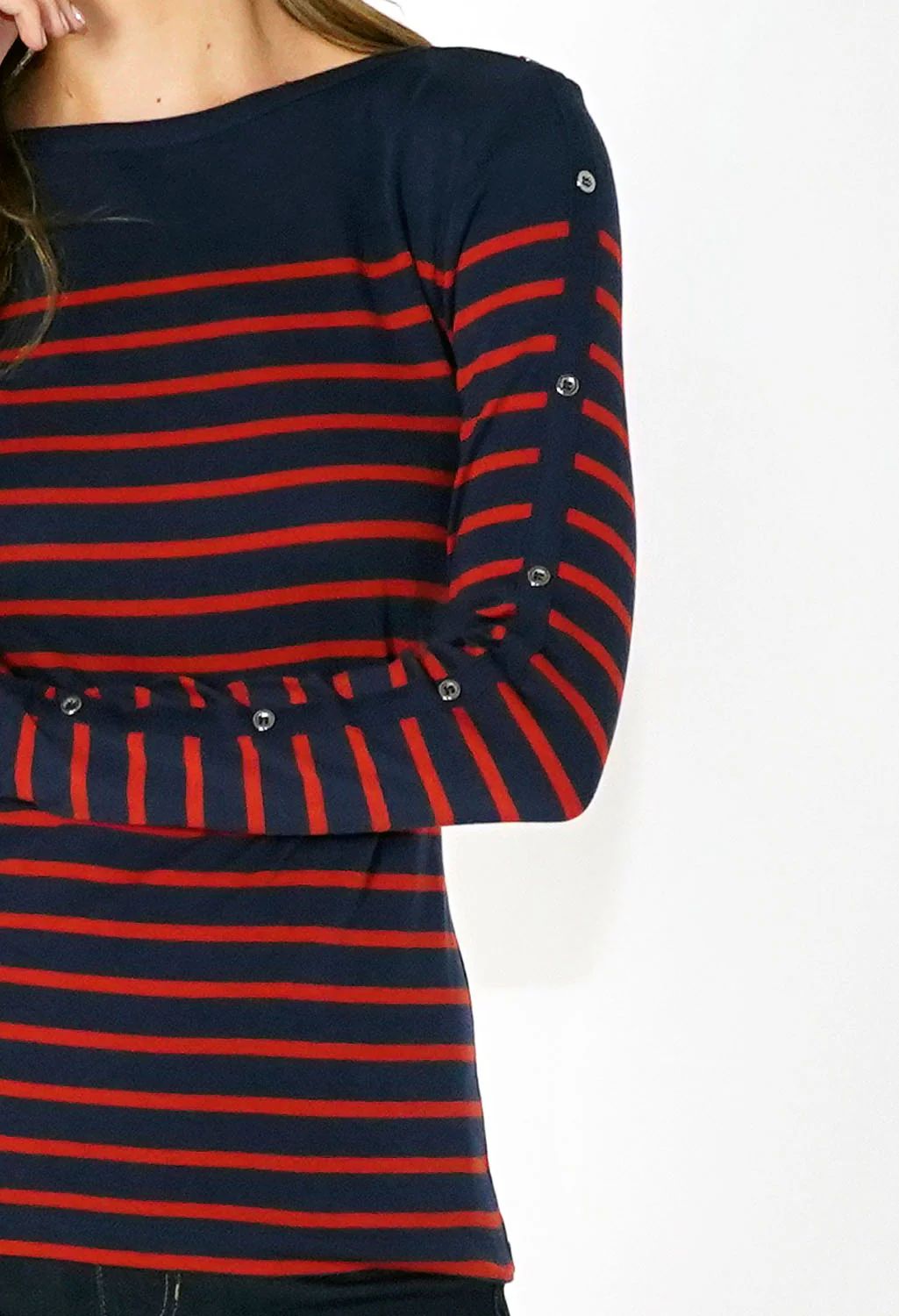 Navy and Red Striped Top with Button Sleeve Detail