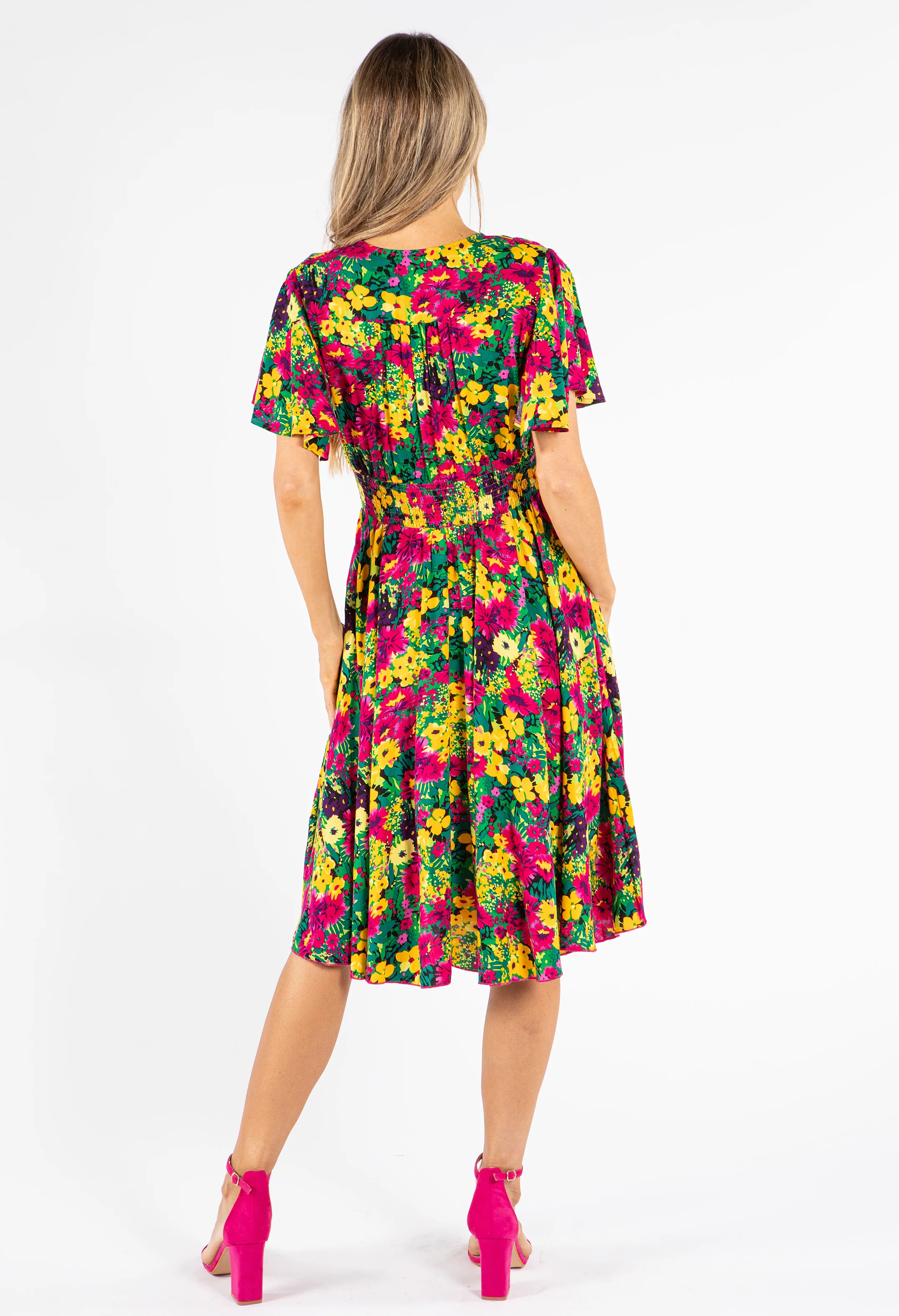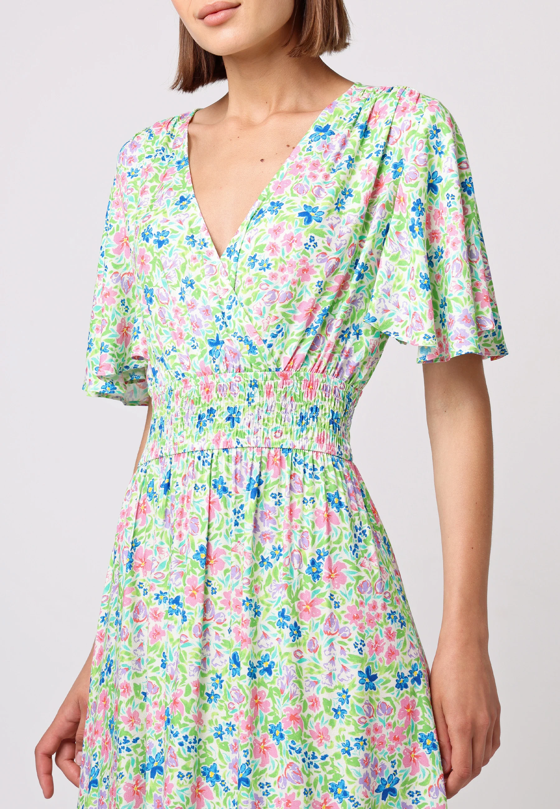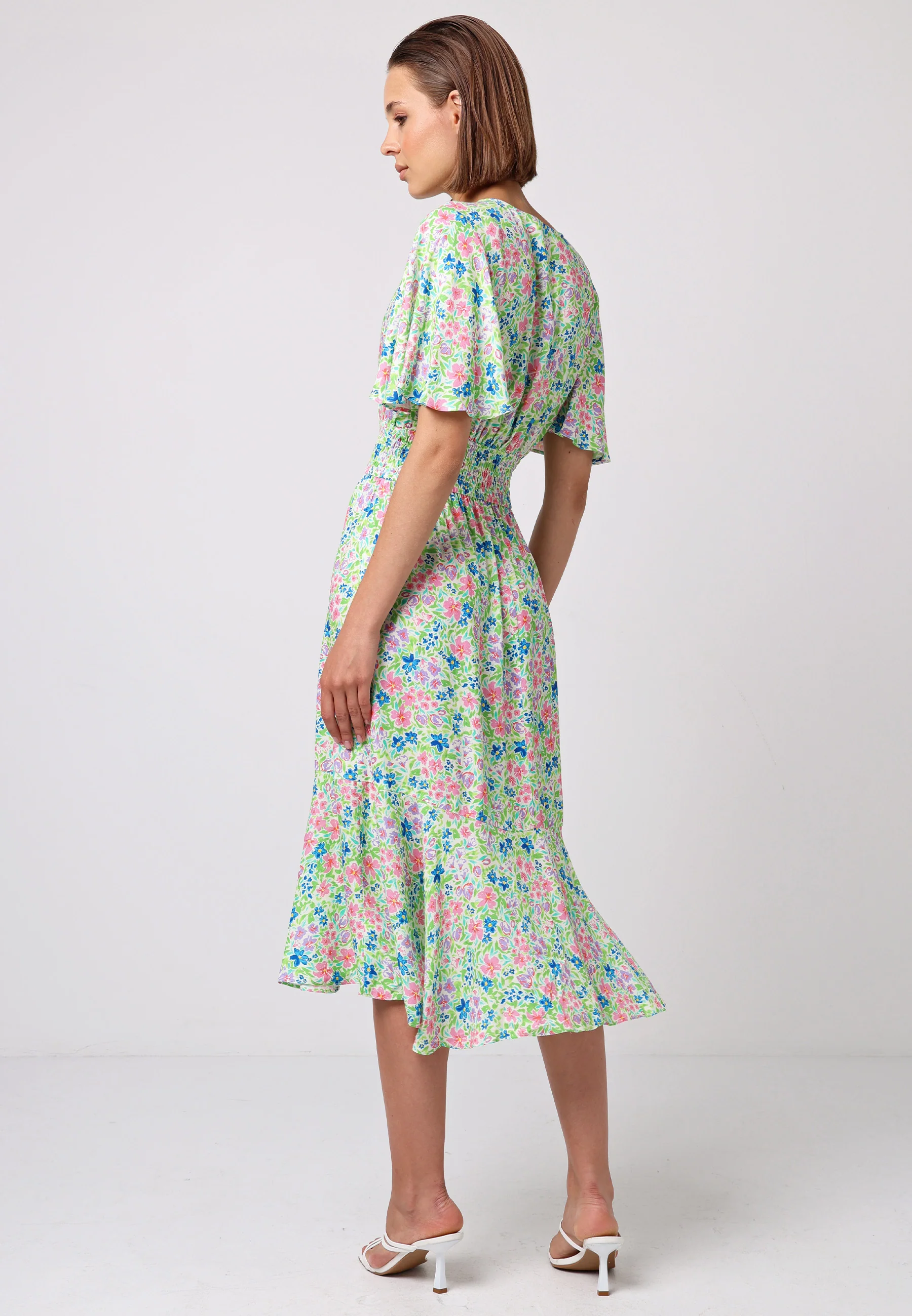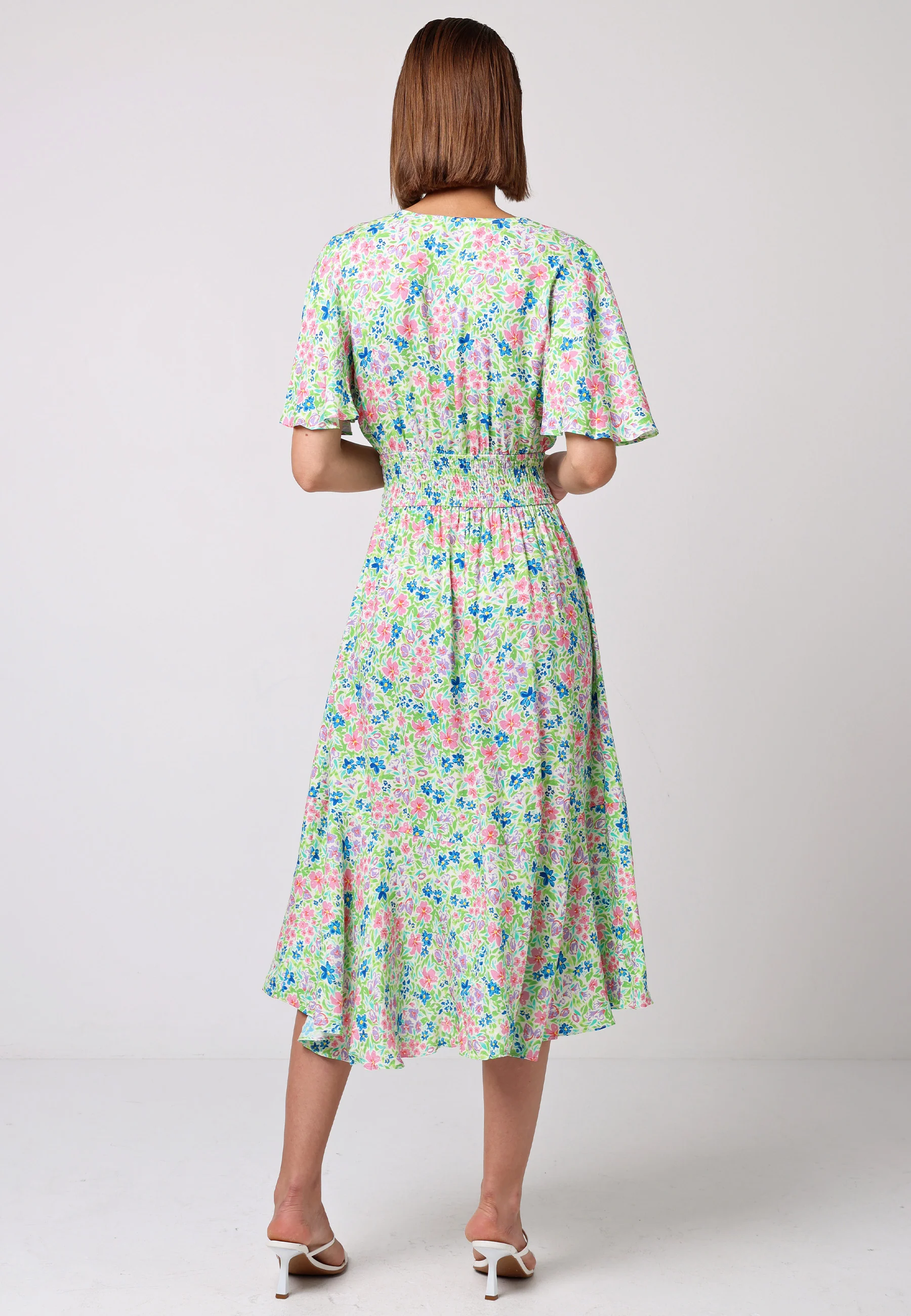 Shirred Waist Wrap Top Flutter Sleeve Midi Dress
