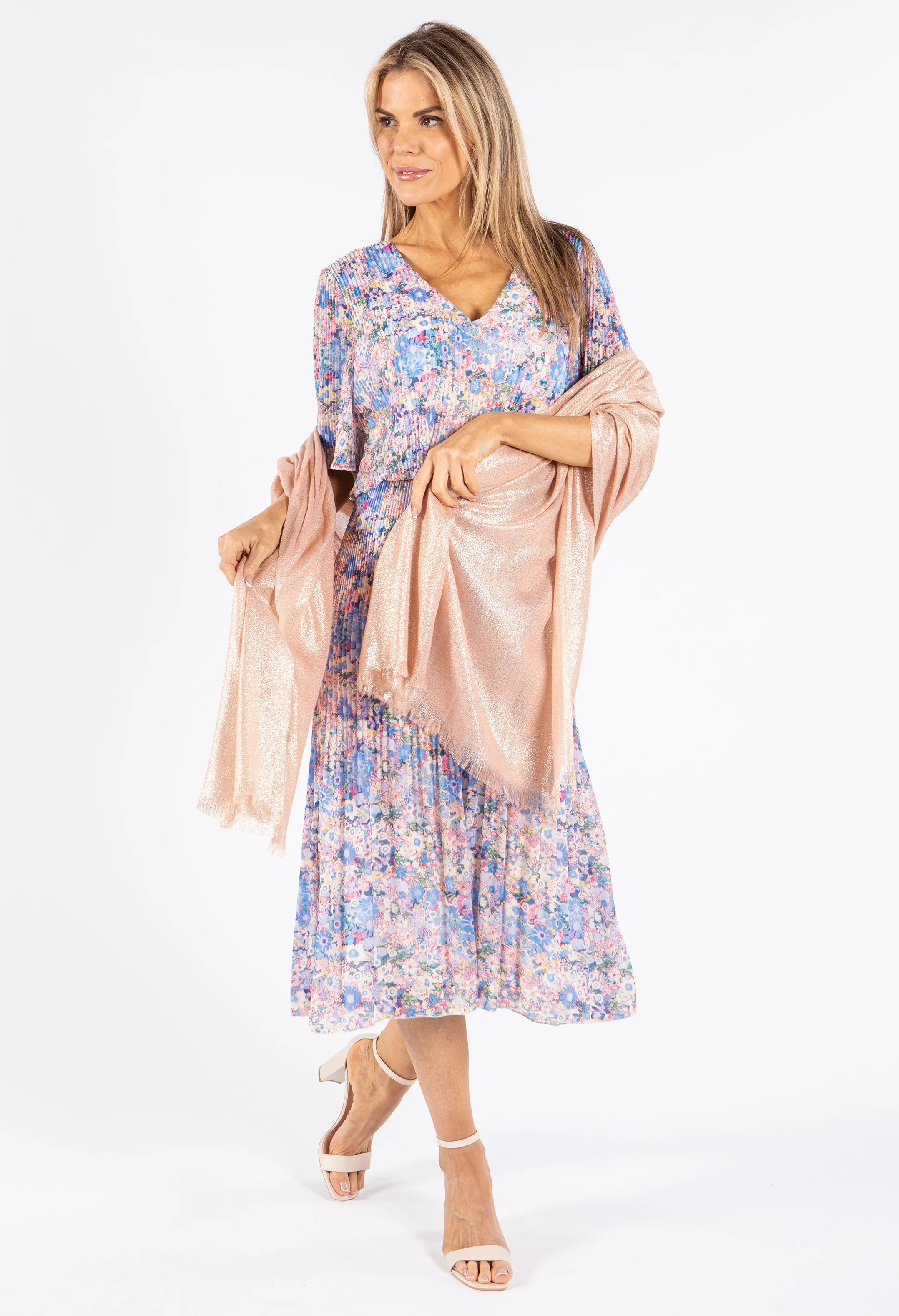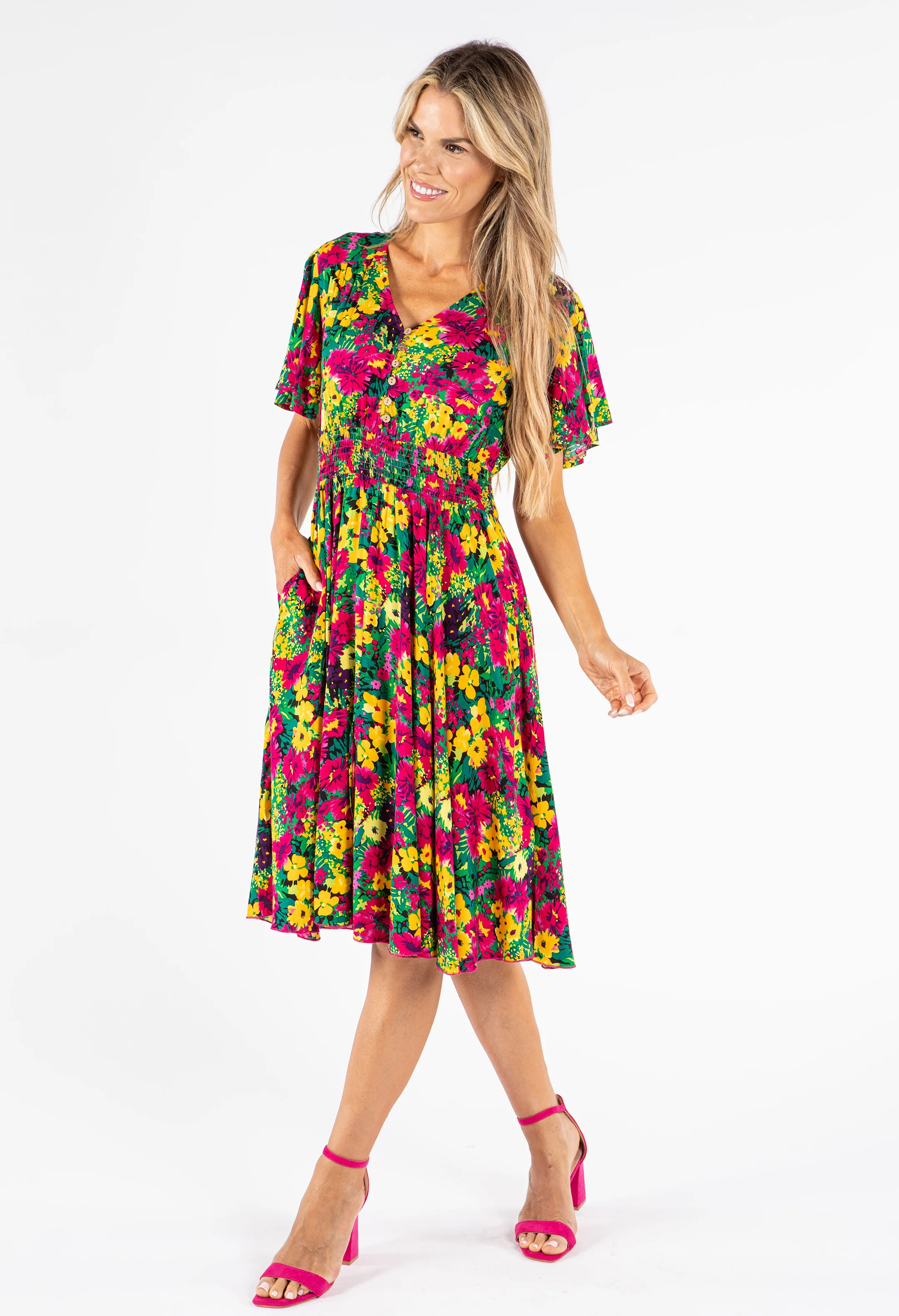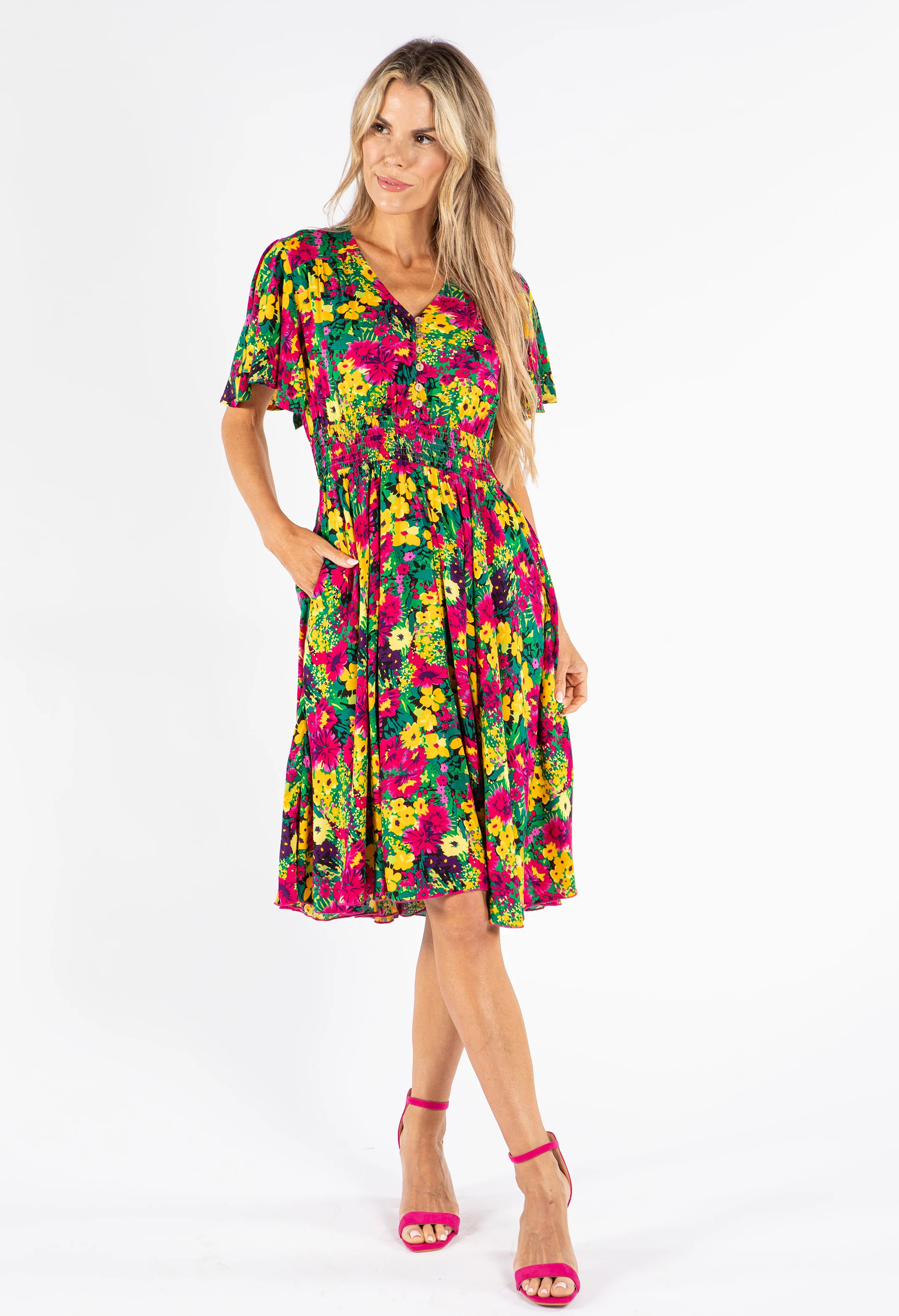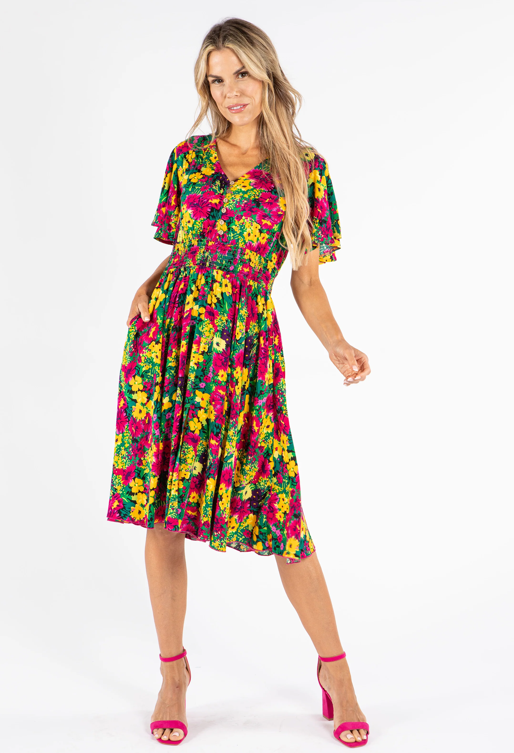 Shirred Waist Wrap Top Flutter Sleeve Midi Dress