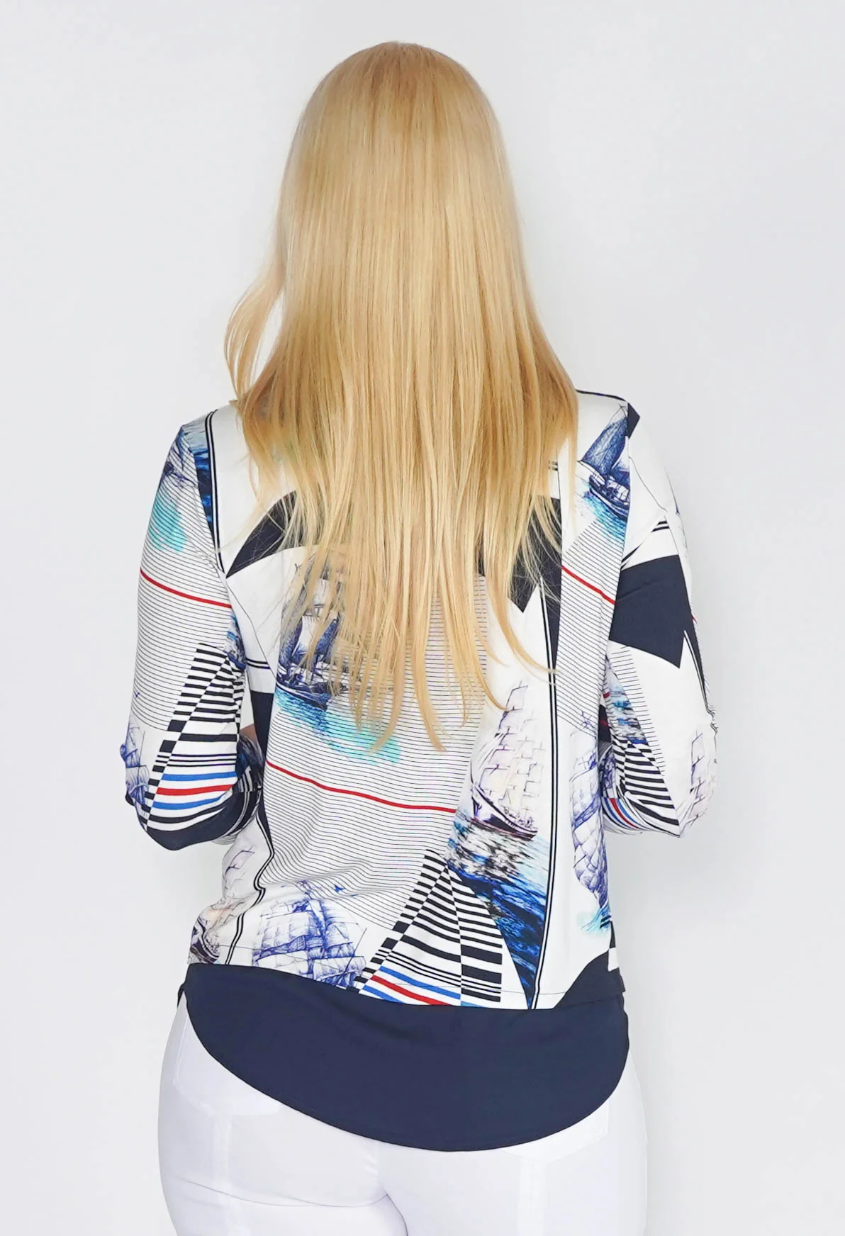 BLOUSE IN NAVY AND OF WHITE NAUTICAL PRINT.