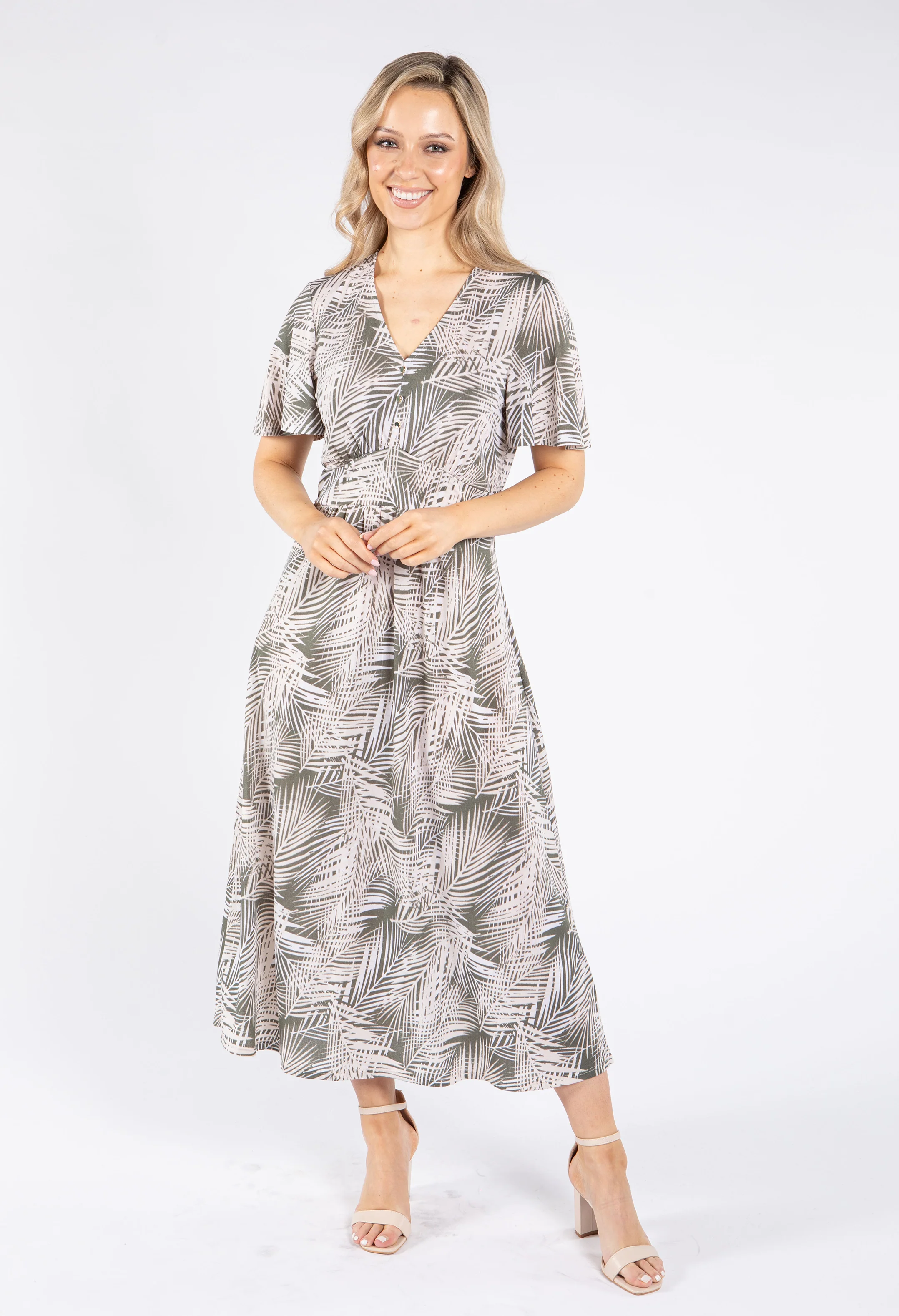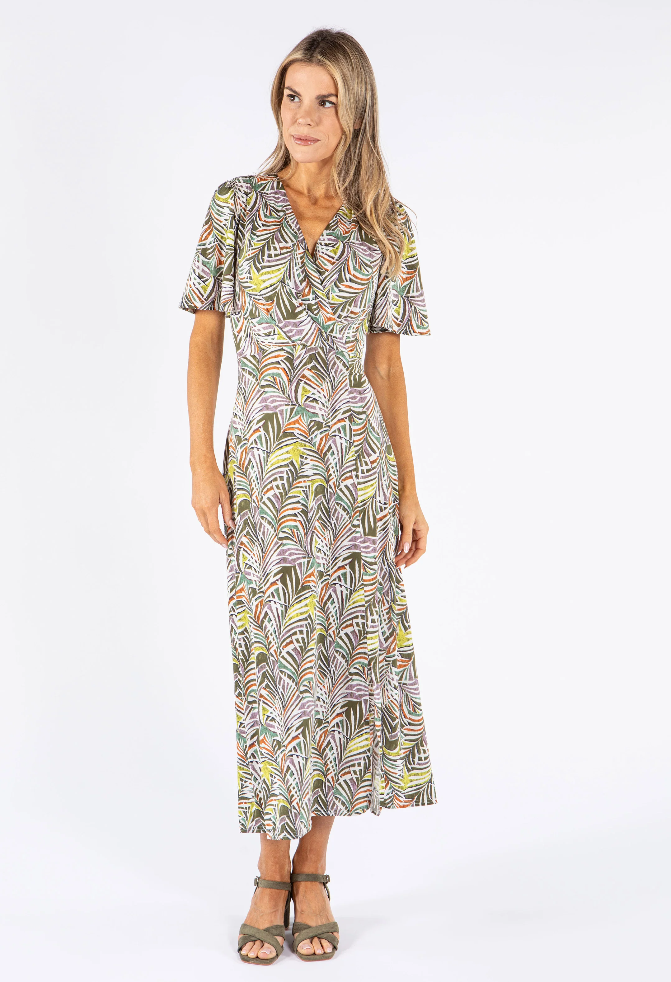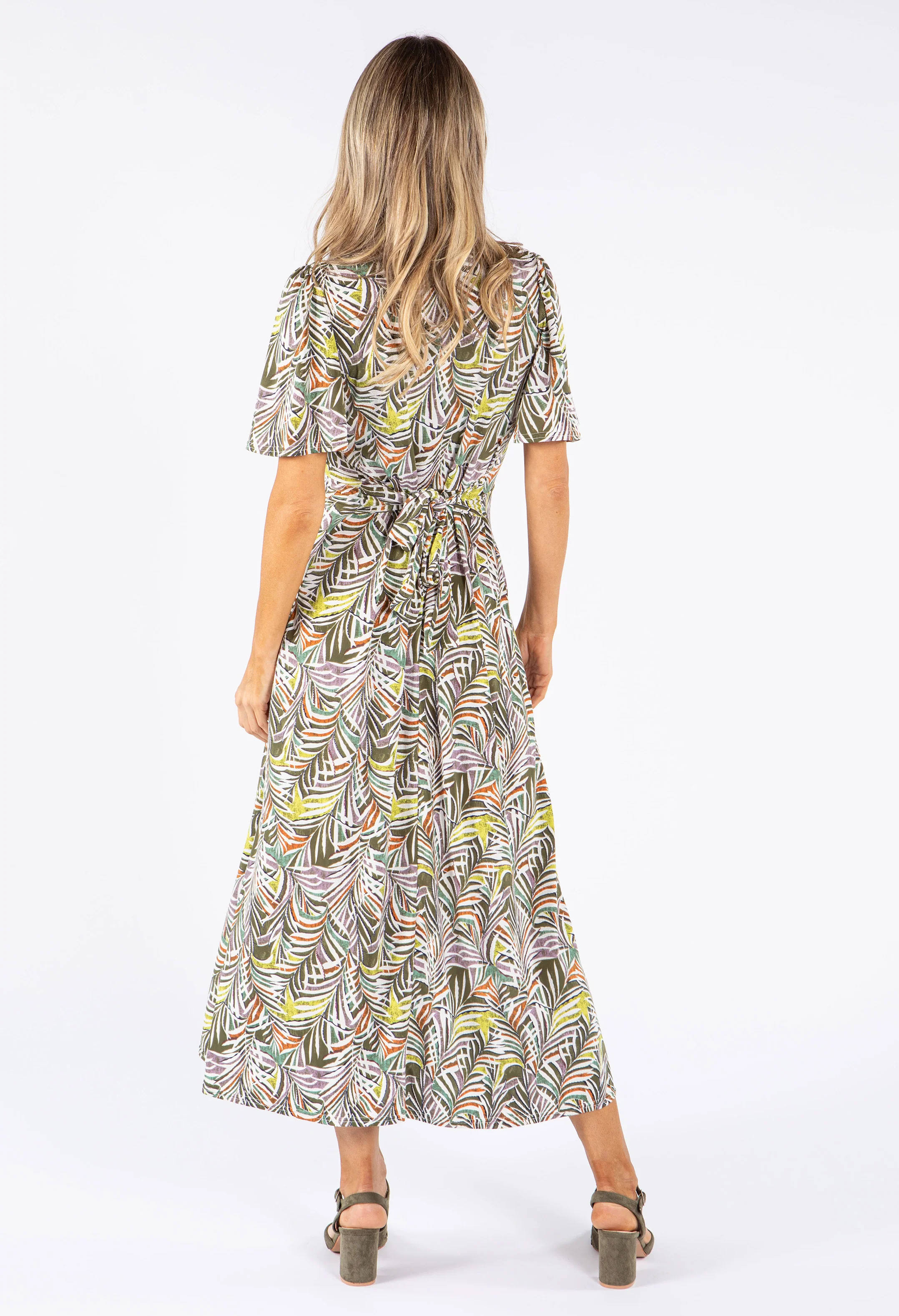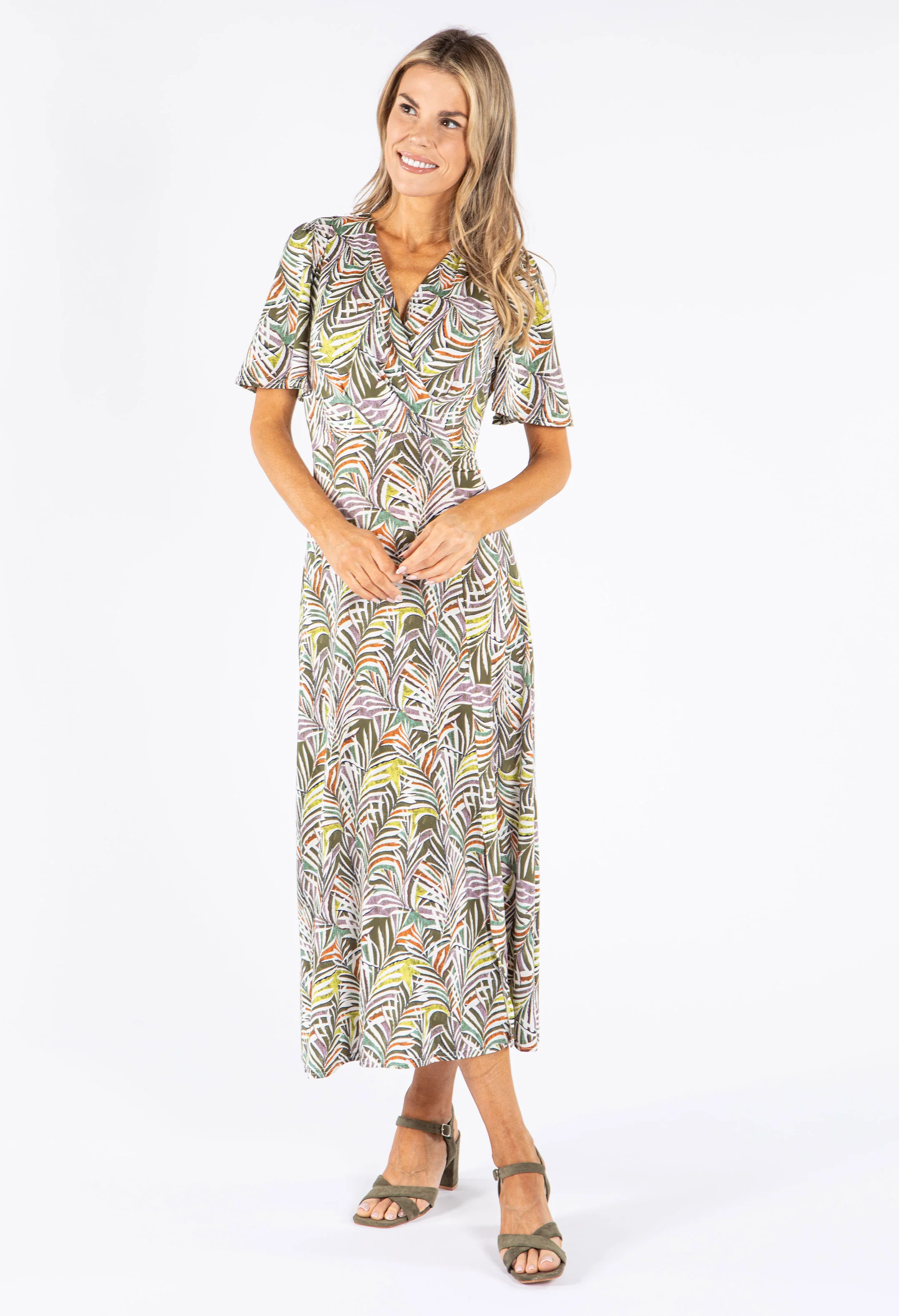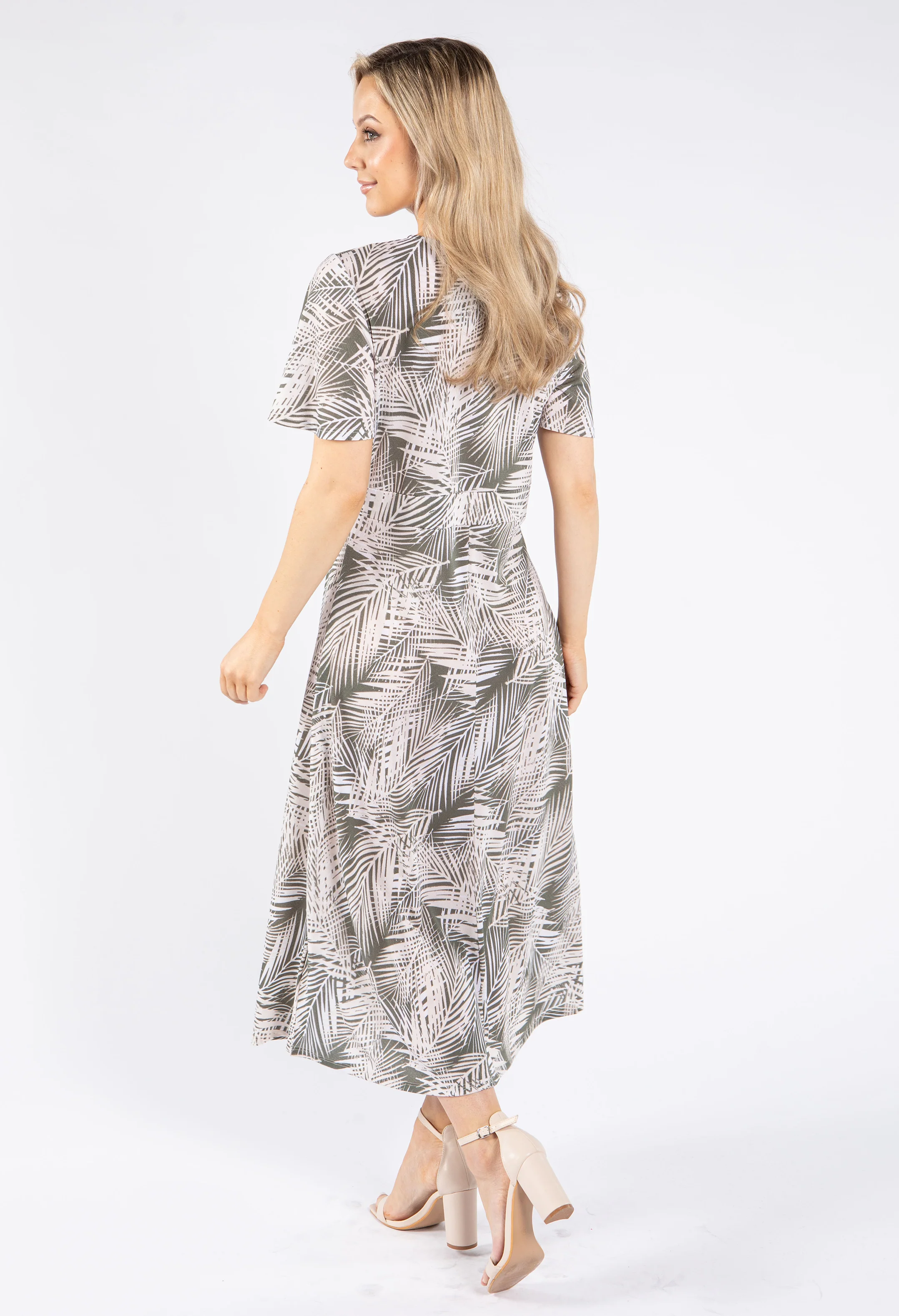 Palm Print V Neck Midi Dress