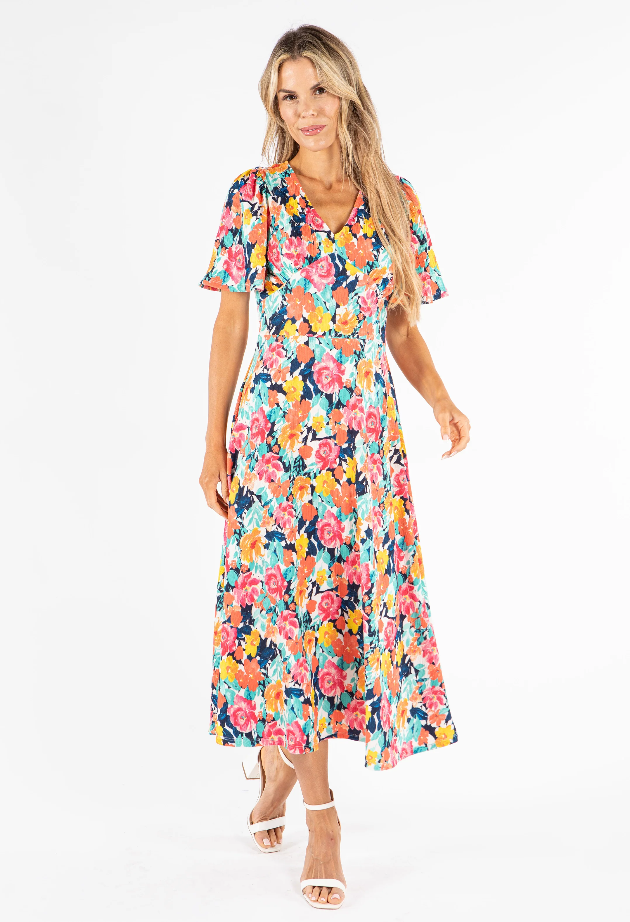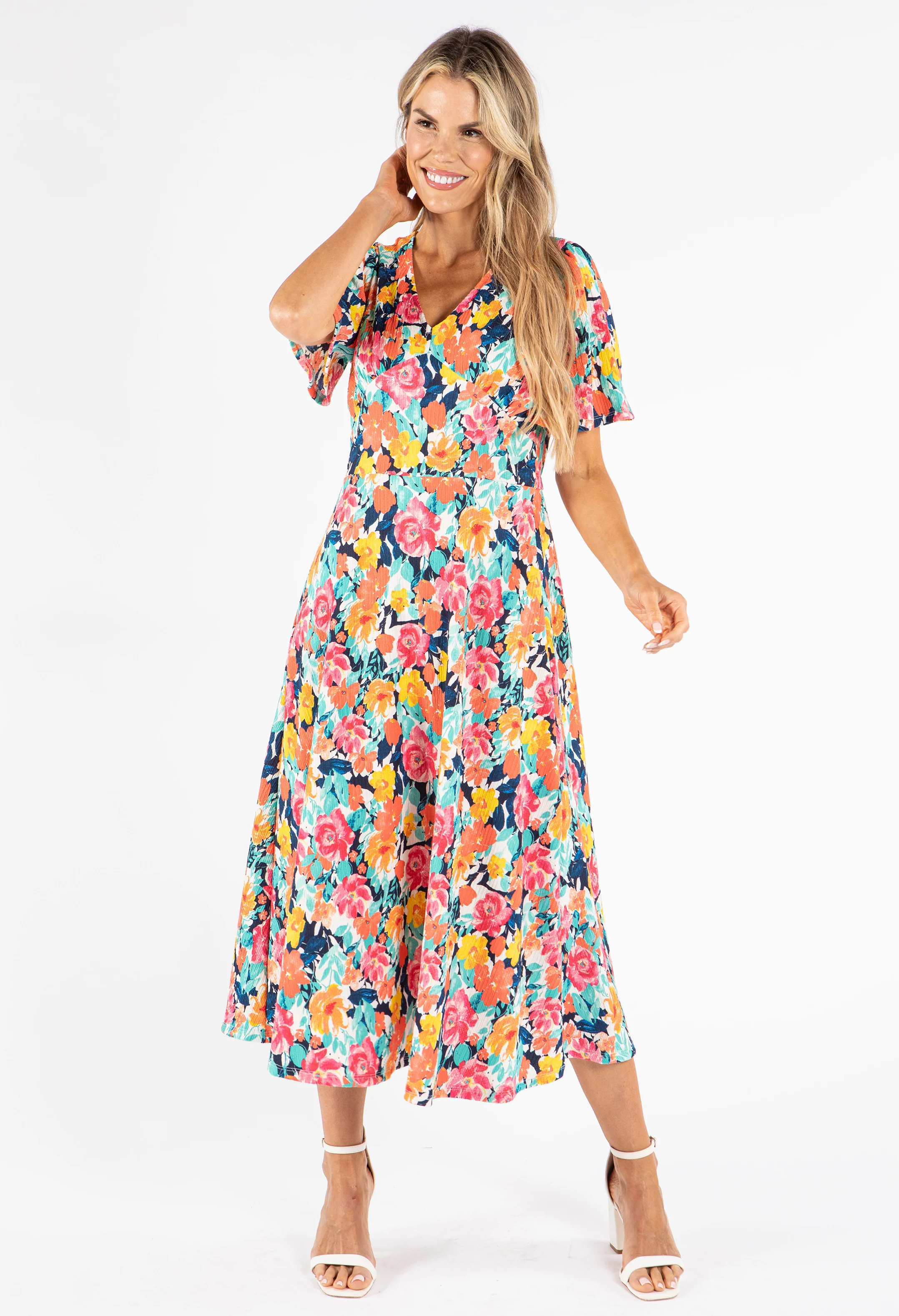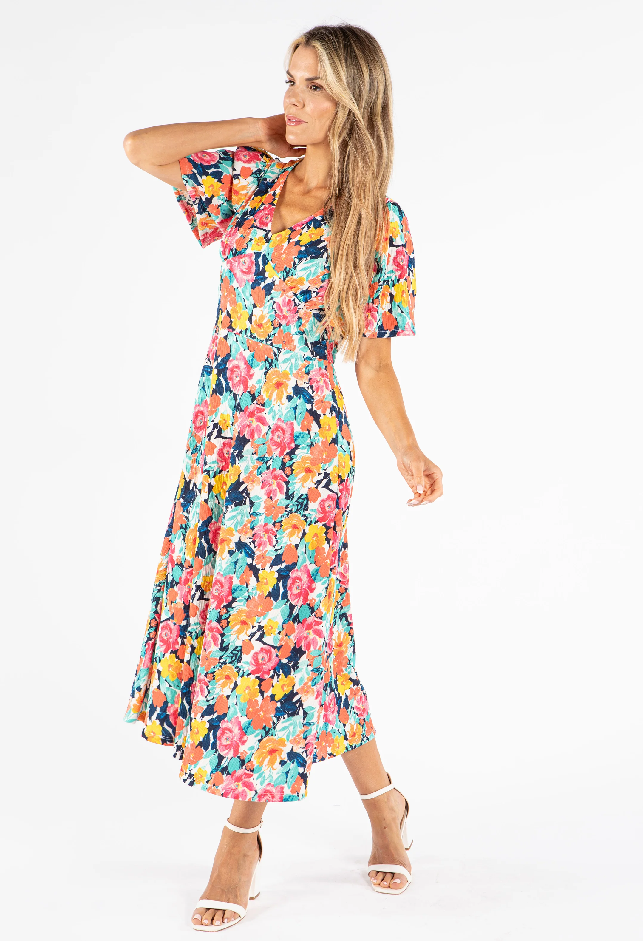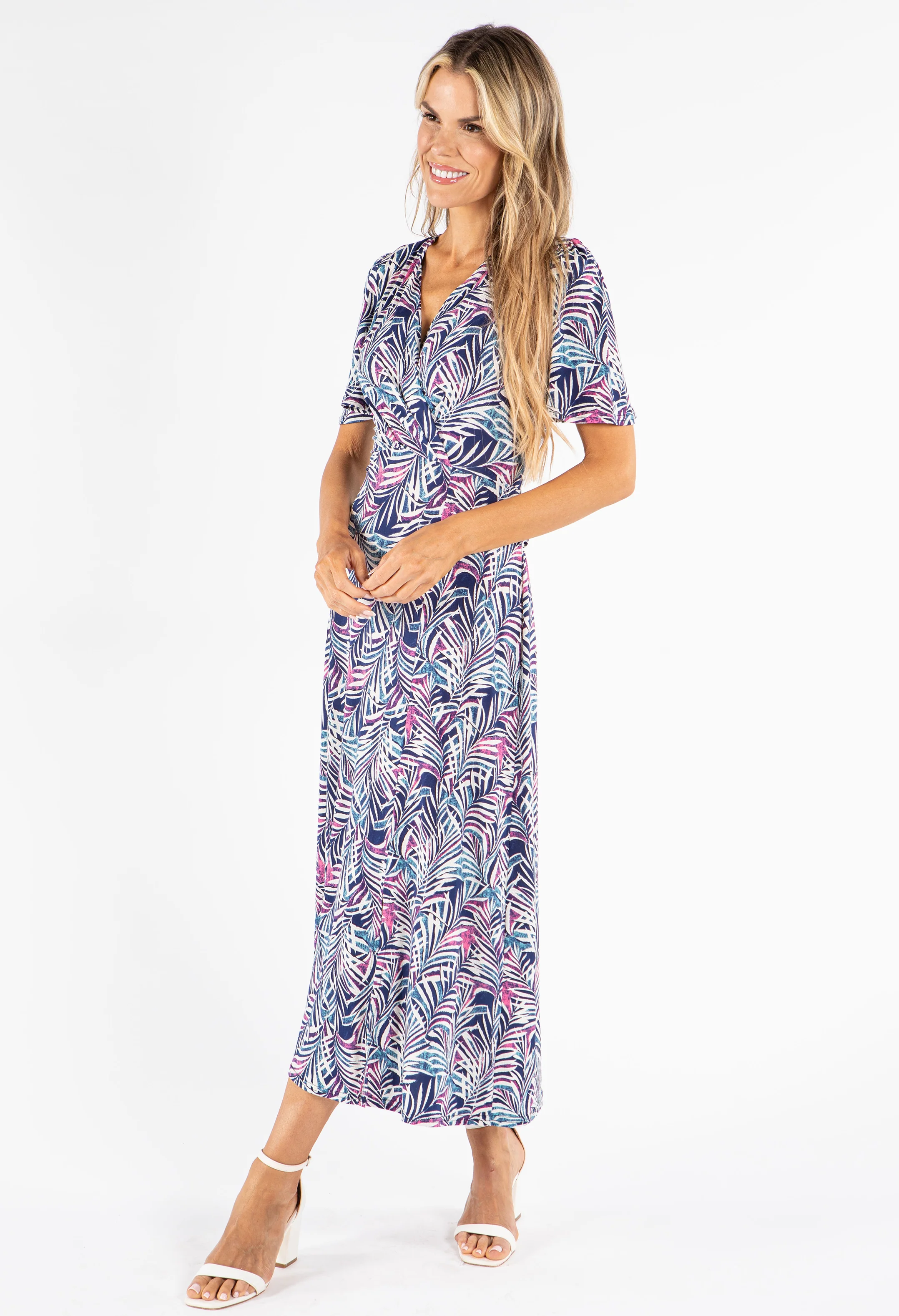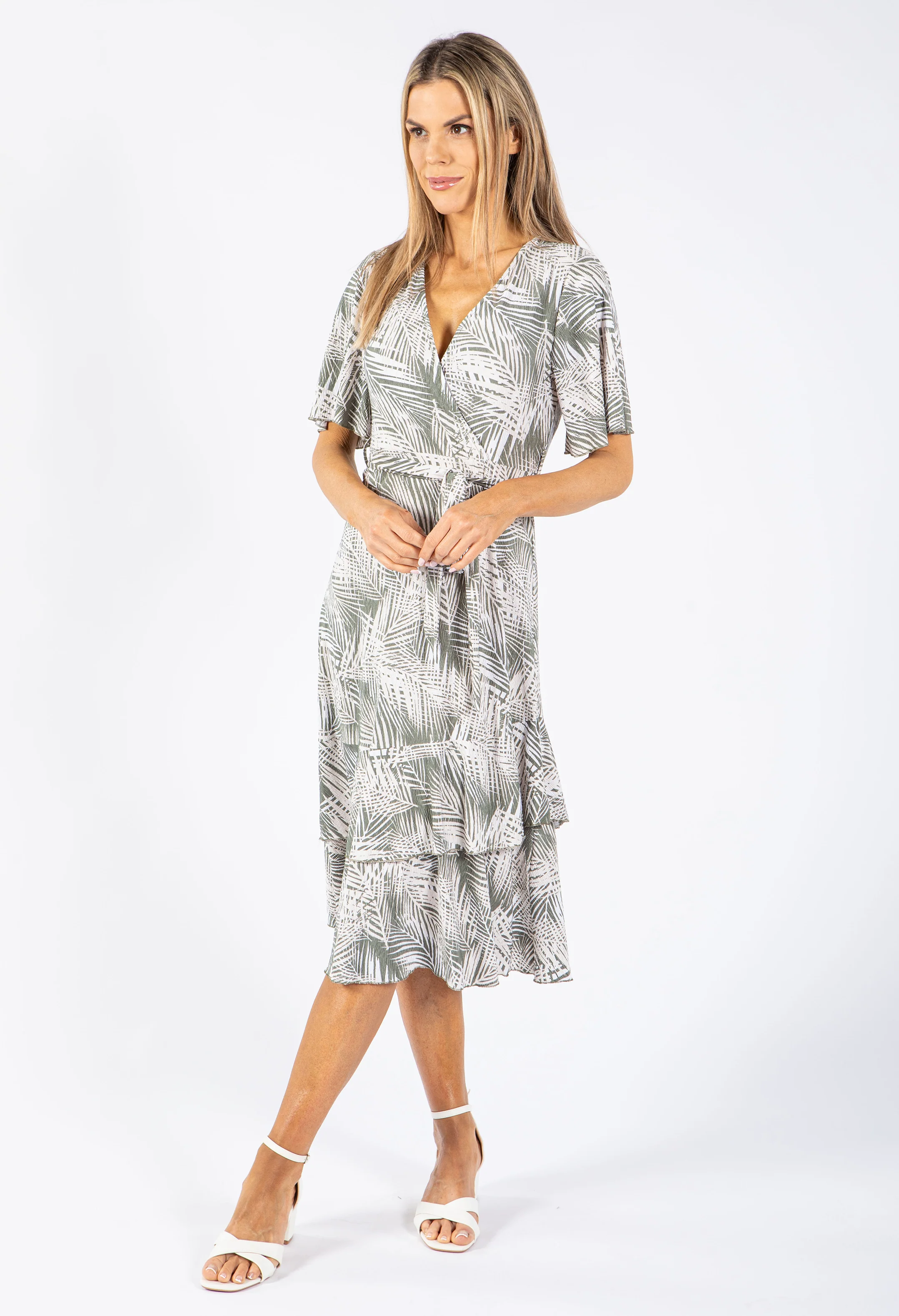 Palm Print V Neck Midi Dress