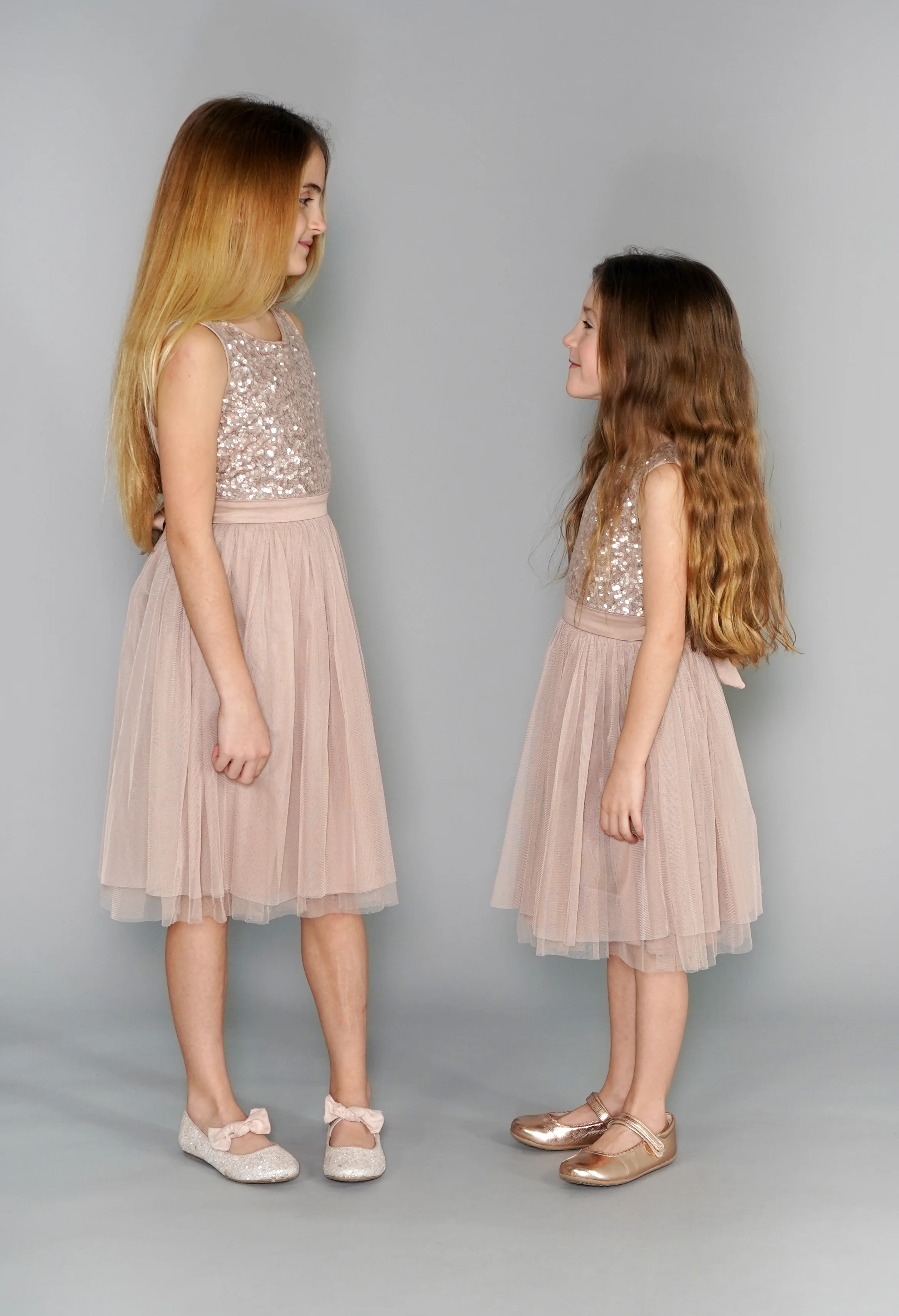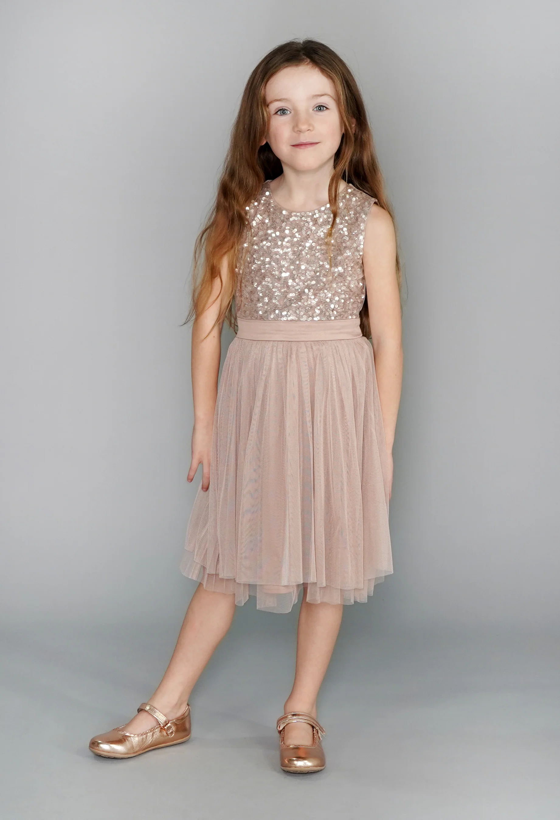 Blush V Neck Sequin and Tulle Dress with Tie Waist